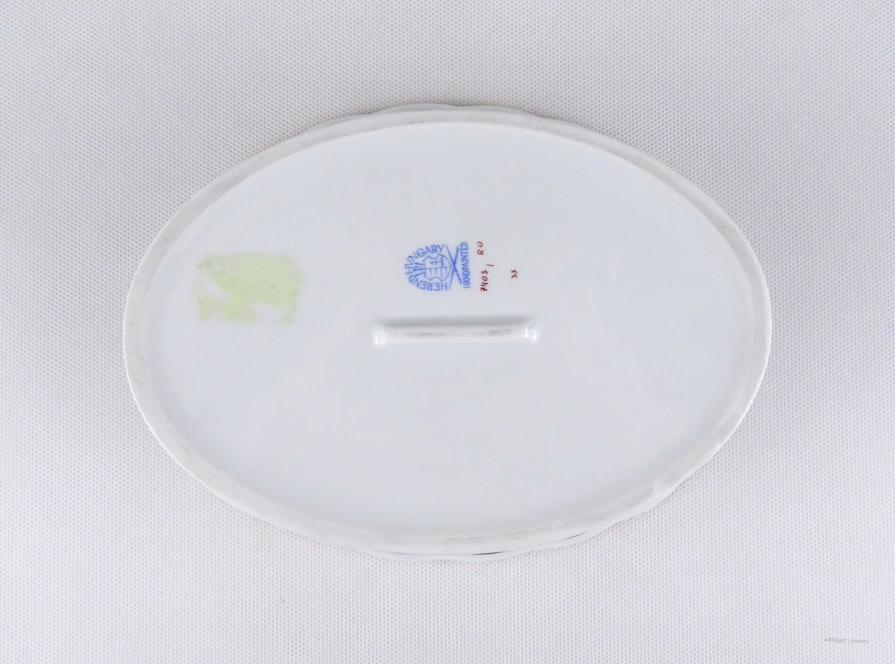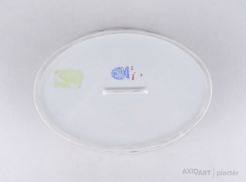 [1U422/X335] Hibátlan állapotú, áttört díszítéses, aranyozott szélű, Rothschild mintás Herendi porcelán asztalközép kínáló tál. Alján kék Herendi márkajelzés: HEREND HUNGARY HANDPAINTED Mélynyomással: HEREND Formaszám: 7403/RO Magasság: 5.7 cm Szélesség: 15.5 cm Hosszúság: 20.8 cm Súly: 0.395 kg