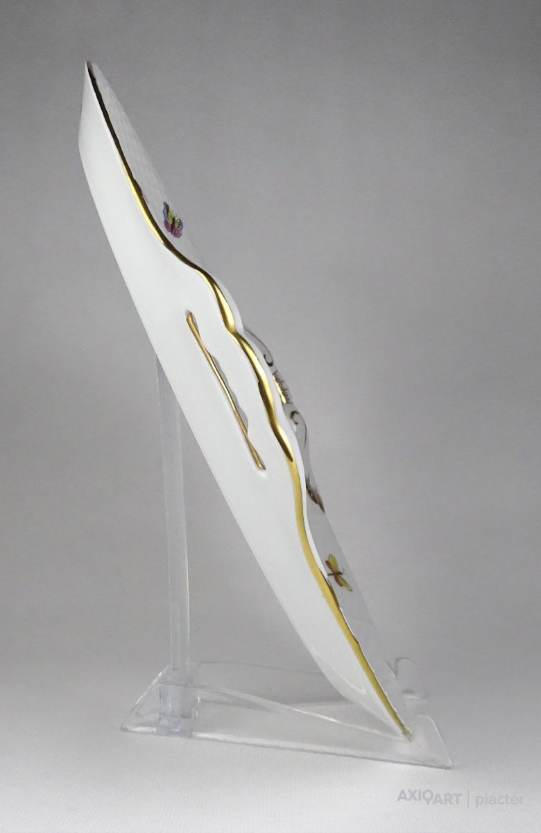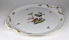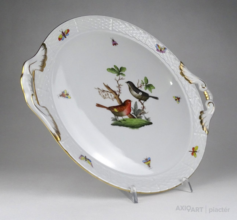[1R774/Z022] Régi, hibátlan állapotú, kézzel festett aranyozott nagy méretű Rothschild mintás Herendi porcelán kínáló tál, tortás tál. Alján kék Herendi jelzés: HEREND HUNGARY HANDPAINTED Mélynyomással: HEREND Formaszám pirossal: 315/RO Szélesség: 28.5 cm Hosszúság: 32.3 cm Súly: 0.775 kg