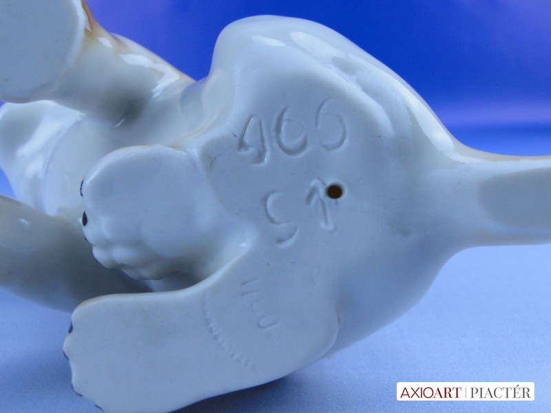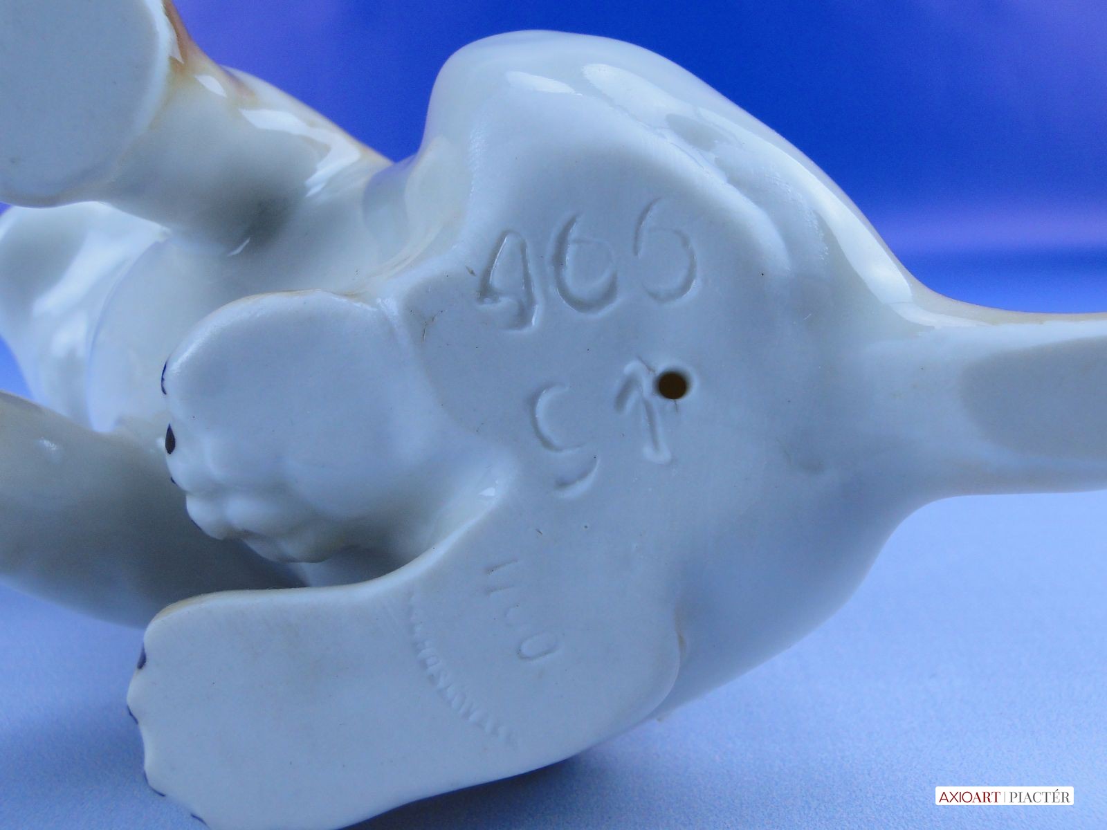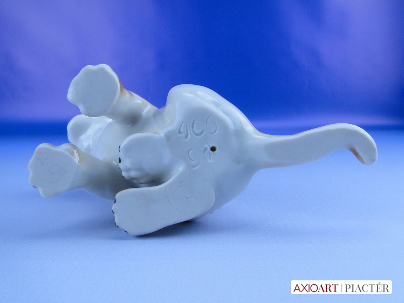 [0D835/X011] Hibátlan állapotú, jelzett cseh porcelán oroszlánkölyök szobor. Alján mélynyomású jelzés: CZECHOSLOVAKIA Gyártói papírvignettán felirat: ROYAL DUX BOHEMIA Formaszám: 466 91 Magasság: 8 cm Szélesség: 5.5 cm Hosszúság: 13 cm Súly: 0.11 kg