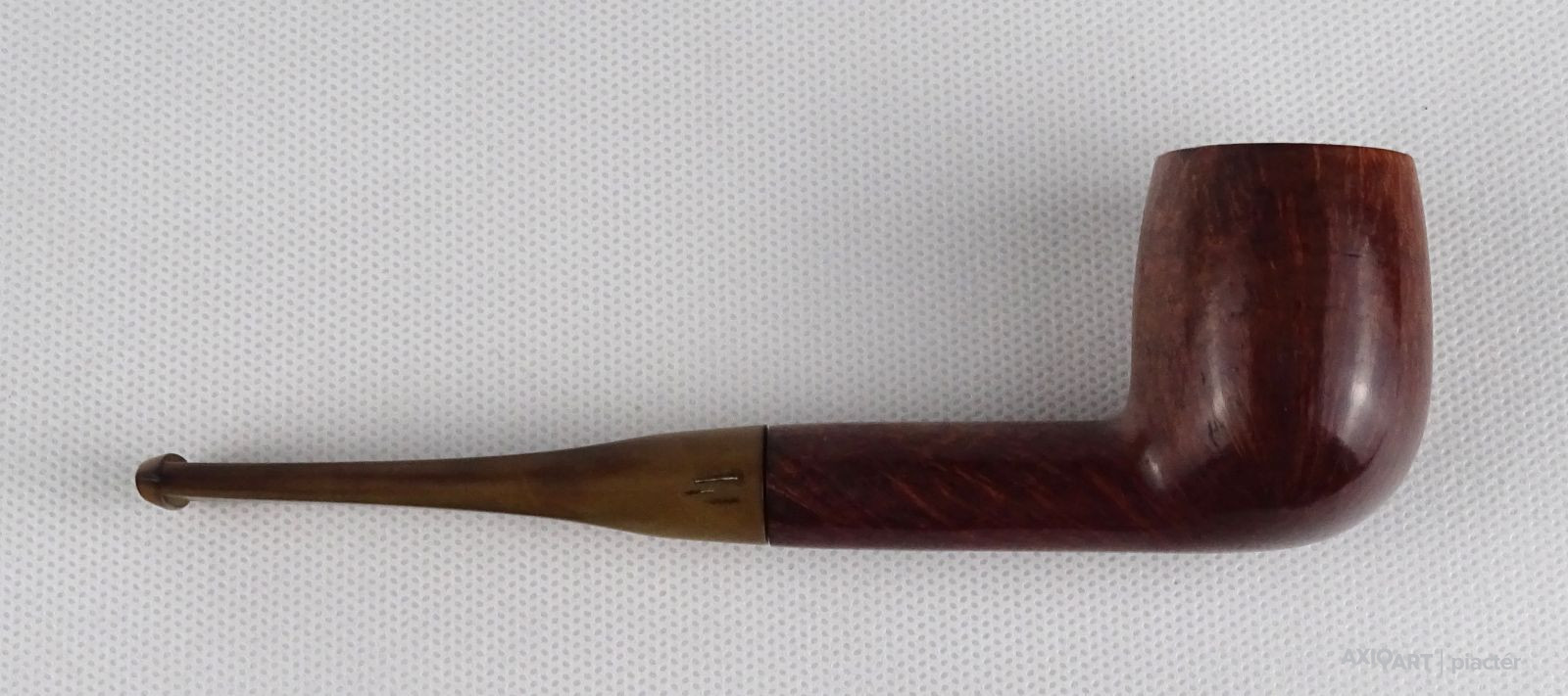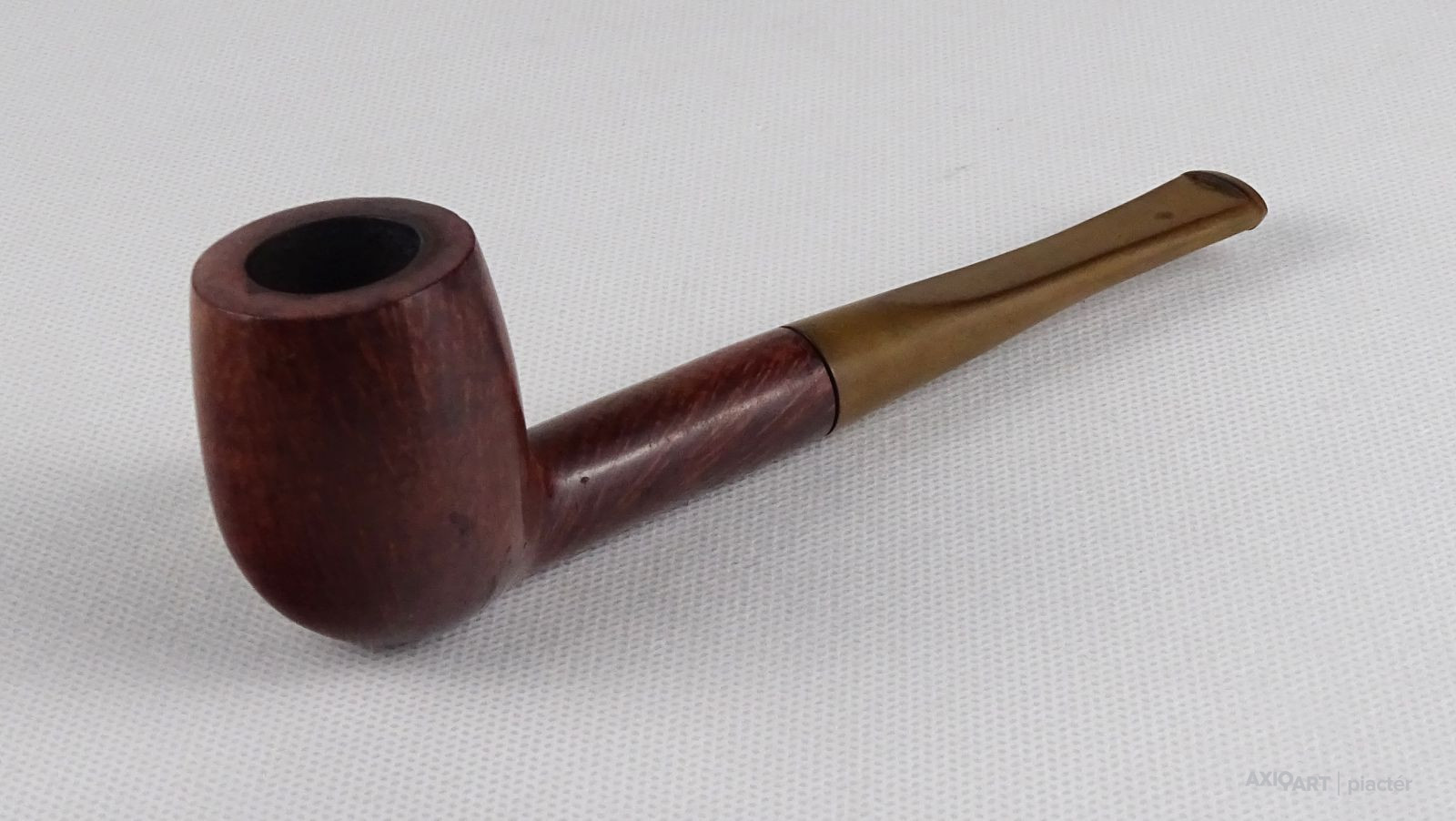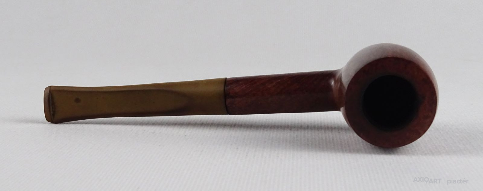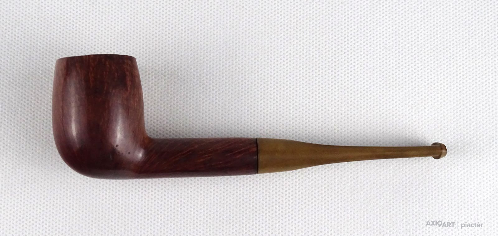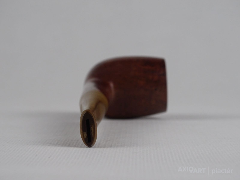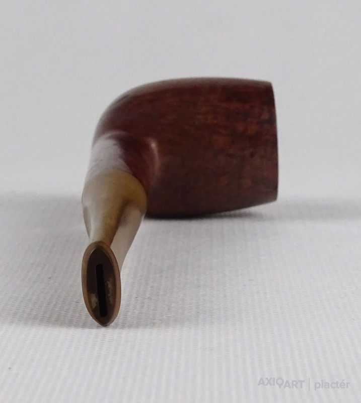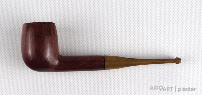 [1S886/FSZ] Szép állapotú, rózsagyökérből készült, Billiard formájú pipa. Magasság: 4.7 cm Szélesség: 3.6 cm Hosszúság: 15.2 cm Súly: 0.04 kg A PIPÁRÓL   A minőségi pipák nagy részét a fehér hanga (Erica arborea) bruyere (angol: briar; francia: bruyere) nevű cserjefajta jellegzetes gyökérgumójából készítik. Ez a különleges növény nagyon kevés helyen terem meg, de leginkább Korzikán őshonos, és főleg köves, sziklás talajon nő. A növényből a pipakészítés folyamata a következő:                   Amikor a fehér hanga bruyere megközelítően 60-70 éves, akkor kiszedik a gyökerét, amely kb. egy focilabda méretű gumó. A kitermelés után a gumót alaposan megtisztítják, majd fűrésszel feldarabolják és osztályozzák. A megtisztított gyökereket két tömbre szelik: ebauchon: a gyökérgumó közepéből vett tömb, plateaux: gyökérgumó külső része, amelyet a pipakészítők a kiváló erezete miatt jobban kedvelnek. Az osztályozás után a tömböket 24 óráig tiszta vízben főzik, hogy minden olyan anyag kioldódjon belőle, ami esetleg megrepeszthetné a fát pipázás közben. Ezután a gyengébb minőségű fát 2 évig, a jobb minőségűeket pedig 5-7 évig szárítják és csak ezután kezdődhet el a pipafaragás egyáltalán. A bruyere gumó értékét az adja, hogy minden kísérlet ellenére sem sikerült még mesterségesen szaporítani, kizárólag ott bújik ki a föld alól, ahol neki kedve tartja. Gyökerének nincs meghatározott formája vagy száliránya, a szálak egymást keresztezik, sűrű, apró pórusokból összeállva, ezzel akadályozva a könnyű kiégést. Kezünkbe véve egy kemény bruyere darabot, érezhetjük, hogy a kézi pipafaragás bizony nem egy könnyű mesterség. A bruyere gyökér több okból is kifejezetten jó pipaalapanyag. Az első és legfontosabb ezek közül természetes tűzállósága. Egy normál, az emberi kéznek kellemes hőmérsékletű fapipában 380 fokon izzik a dohány akár órákon keresztül, mégsem égeti meg a pipázó kezét, nem gyullad meg a pipa fája sem a hatalmas hőtől, mert olyan a pipa szerkezete, hogy ennek ellenáll. A második, a nedvességelnyelő képessége: a bruyere cserje magas nedvességtároló képességgel bír, hogy szárazság esetén a növény ne száradhasson ki. Ez a tulajdonsága előnyt jelent a pipázóknak, ugyanis az égés melléktermékeként létrejövő nedvességet is képes elnyelni. A pipázáshoz több felszerelésre van szükség, mint a cigarettázáshoz vagy a szivarozáshoz. Magán a pipán, valamint a gyufán vagy öngyújtón kívül, a pipásnak általában szüksége van egy tömőfára, egy pipaszurkálóra, a pipa kiürítéséhez valamilyen eszközre és pipatisztító szálra. A tömés legjobb módja, ha a pipás a pipafejbe többször kisebb adagban teszi be a dohányt, a rétegeket mindig lenyomkodja, míg a dohány egyenletes sűrűséget el nem ér, így optimalizálva a légáramlást. Ezt akár egy ujj és a hüvelykujj használatával is meg lehet tenni, de ha a dohányt égés közben újra kell tömni, a pipás általában egy erre a célra szolgáló eszközt, a tömőt használja. Ha meg kell lazítani a dohányt, akkor pipaszurkálót alkalmaznak. Az általános vélekedés szerint a pipa meggyújtásához leginkább a gyufa előnyös. A külön a pipák meggyújtására gyártott bután öngyújtó lehetővé teszi, hogy a lángot a pipafej felé irányítsuk. A gyufa meggyújtása után meg kell várni, míg a foszfor leég róla és teljes lesz a láng. Ezután a tüzet a dohány fölött körkörös mozdulatokkal kell mozgatni, miközben a pipázó személy hosszabb-rövidebb szívásokkal meggyújtja a dohányt. A pipa füstjét a szivarfüsthöz hasonlóan, általában nem kell leszívni tüdőre, csupán a szájba szívják be, majd szájon vagy orron kiengedik, így érződnek igazán a dohány aromái. Normálisnak tekinthető, hogy a pipát időnként újra meg kell gyújtani. Ha rosszul tömték meg, túl nedves a dohány, a keletkező sok hamut nem szedik ki az égéstérből vagy túl nagy időközök maradnak két szippantás közt, akkor akár több után gyújtás szükséges. Ha túl gyorsan szívják, felesleges nedvesség keletkezik, mely a pipában gurgulázó hangot, a nyelven pedig kényelmetlen érzést eredményez és a pipa feje is túlforrósodhat, így kényelmetlen tartani. A világon kevés pipagyár működik, a mediterrán világban a pipakészítés bölcsője a franciaországi Saint- Claude-ban van, itt készítik a híres CHACOM pipákat.   Forrás: www.pipamester.hu