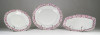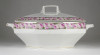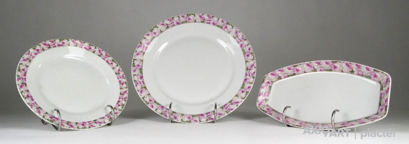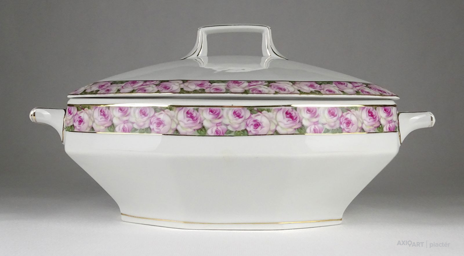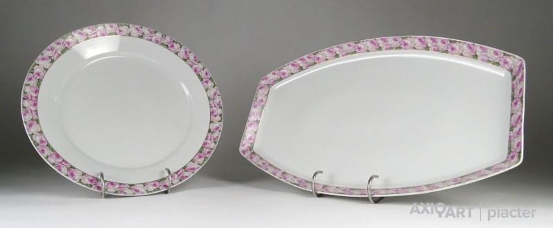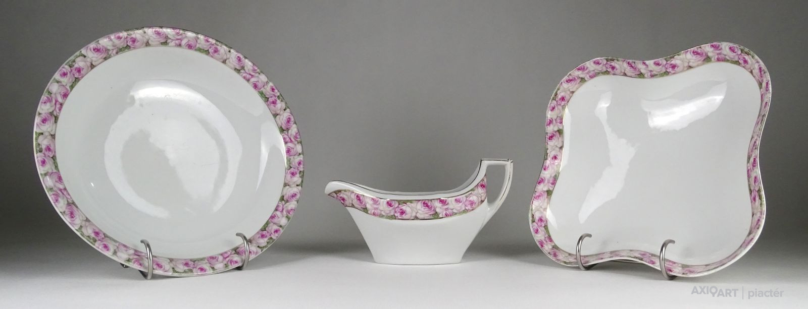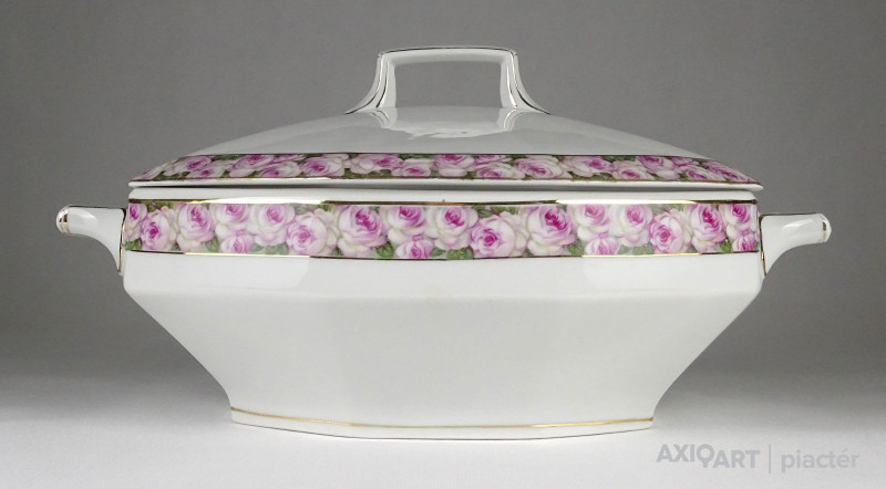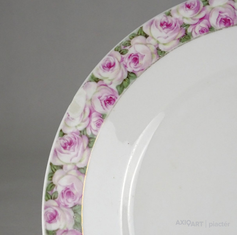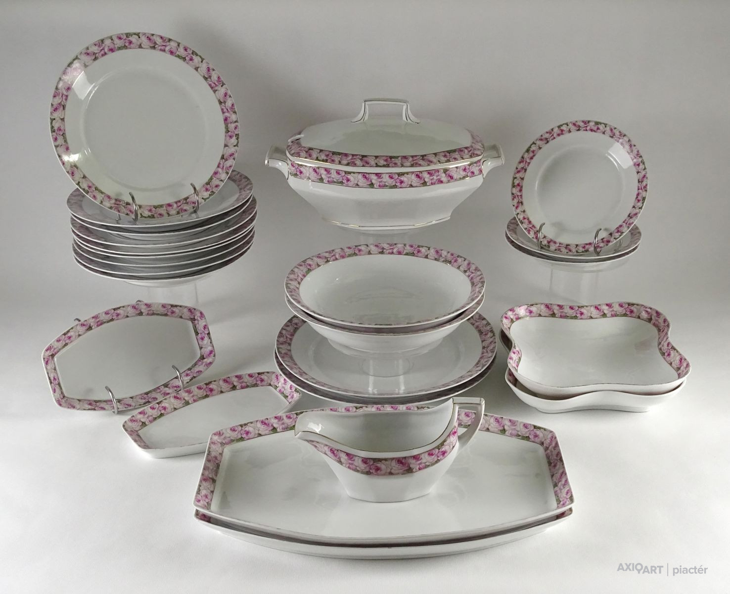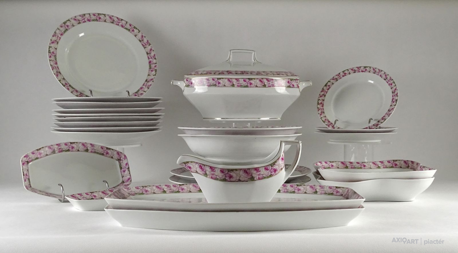 [1N420/X285] Régi hibátlan állapotú, rózsaszín virág mintás, rózsadíszes porcelán étkészlet és süteményes készlet aranyozott szegéllyel. A készlet darabjai: - 1 darab leveses tál fedővel (16.5 x 19 x 32.5 cm) - 9 darab lapostányér (24.5 cm) - 2 darab nagy méretű szögletes húsos pecsenyés tál (39 x 24.5 cm) - 2 darab kerek alakú tésztás tál (5.5 x 25 cm) - 2 darab zöldséges tál (4.5 x 22 x 22 cm) - 2 darab szószos, mártásos tál (11 x 8.8 x 19.7 cm) - 1 darab mártásos tál alátét tányér (21.5 x 12.7 cm) - 2 darab süteményes kínáló tál (29 cm) - 3 darab süteményes tányér (19 cm) Súly: 14.175 kg