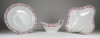 Régi hibátlan állapotú, rózsaszín virág mintás, rózsadíszes porcelán étkészlet és süteményes készlet aranyozott szegéllyel.