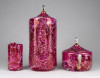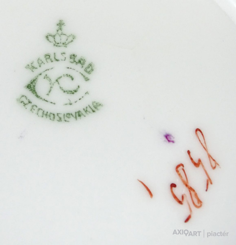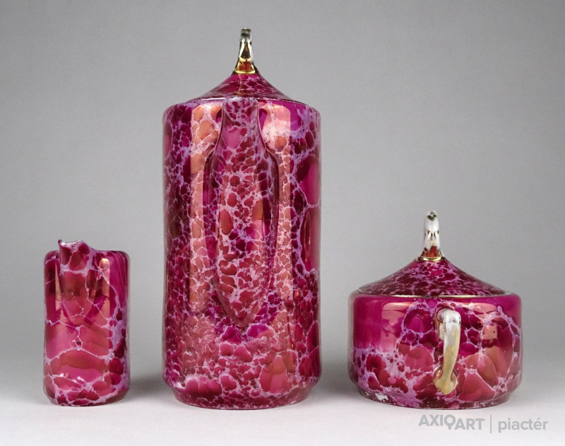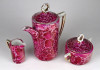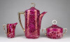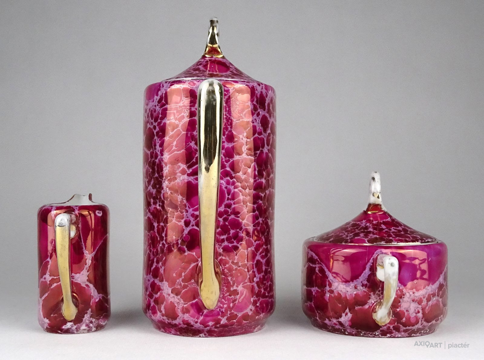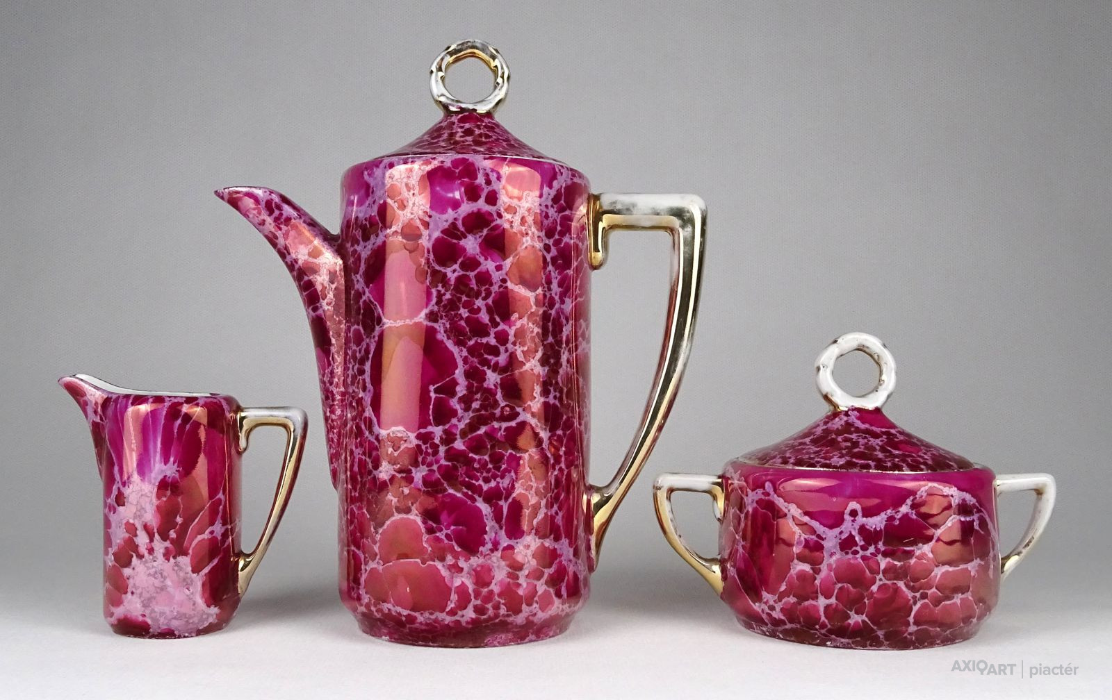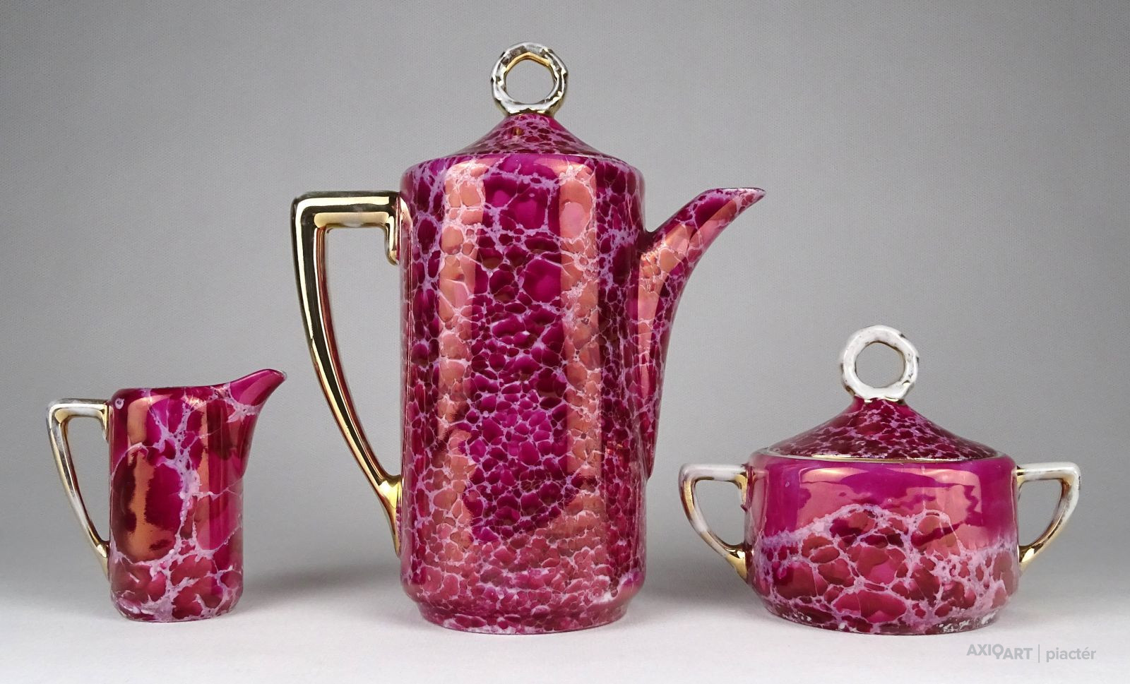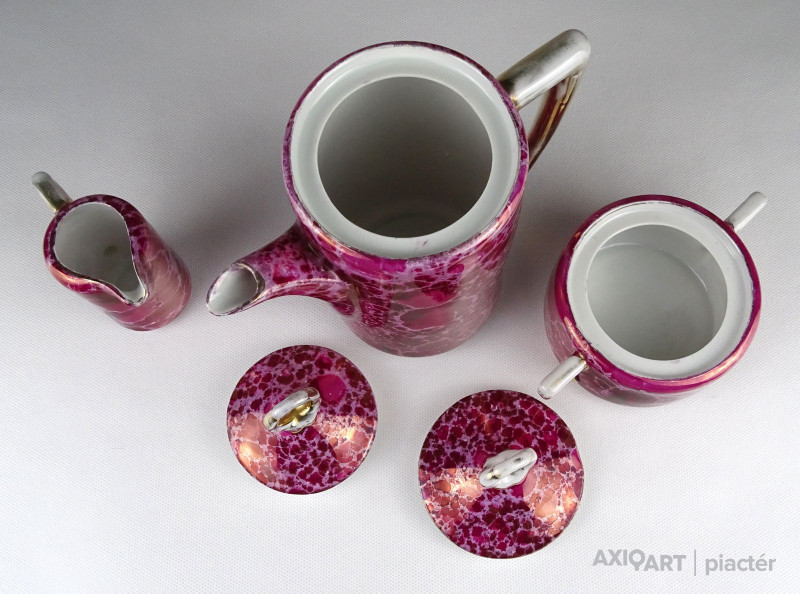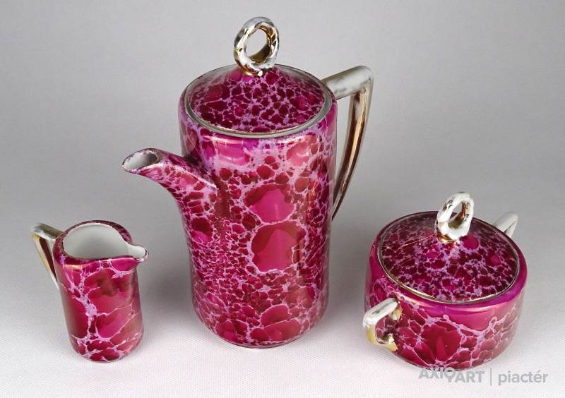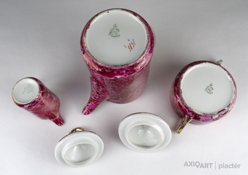 [1N043/X108] Régi jelzett Bavaria porcelán kávéskészlet, rózsaszín márványos díszítéssel, aranyozással. Készlet darabjai: - 1 darab kávéskanna, kiöntő (20 x 8.8 x 16.8 cm) - 1 darab cukortartó bonbonier (10 x 9.5 x 14.2 cm) - 1 darab tejszínes kiöntő (8.5 x 4.7 x 8.3 cm) Alján zöld koronás márkajelzés: KARLSBAD CZECHOSLOVAKIA Súly: 0.685 kg