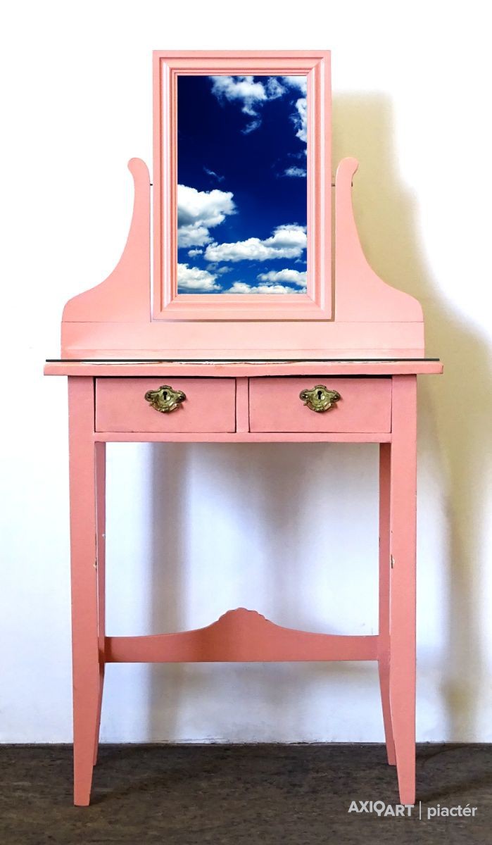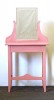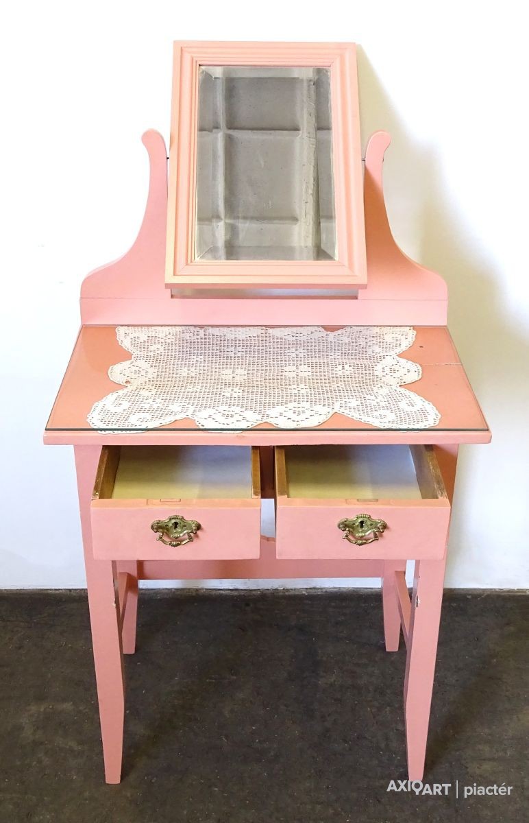 Szép állapotú, felújított rózsaszín, tükrös pipereasztal két fiókkal.