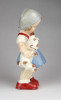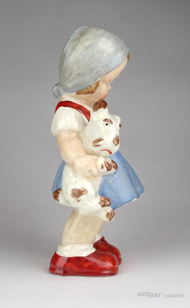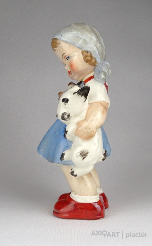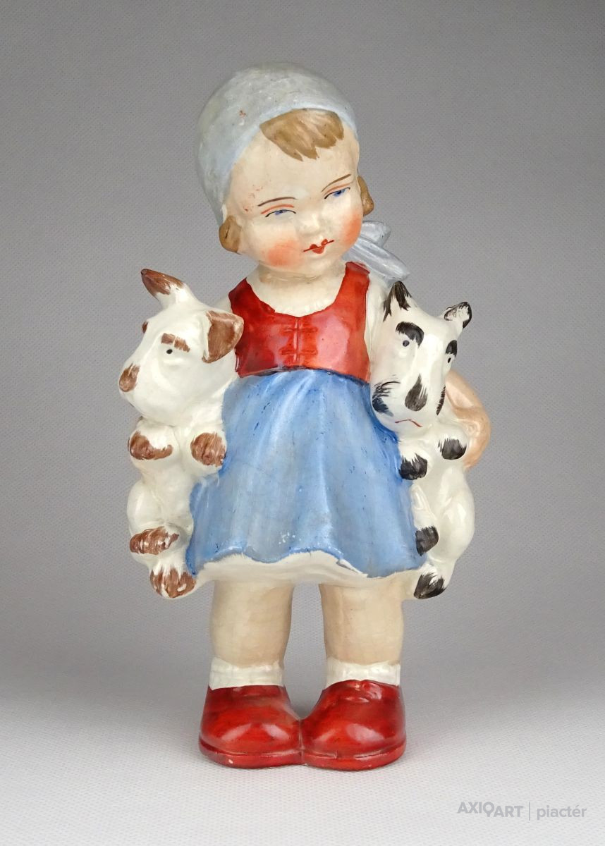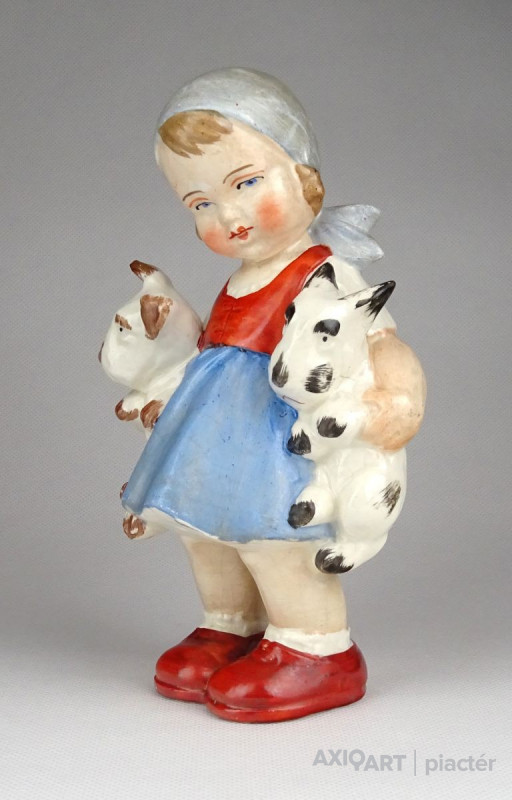 Antik szép állapotú, jelzett német porcelán figura, fejkendős, kék szoknyás kislány szobor két kutyával.