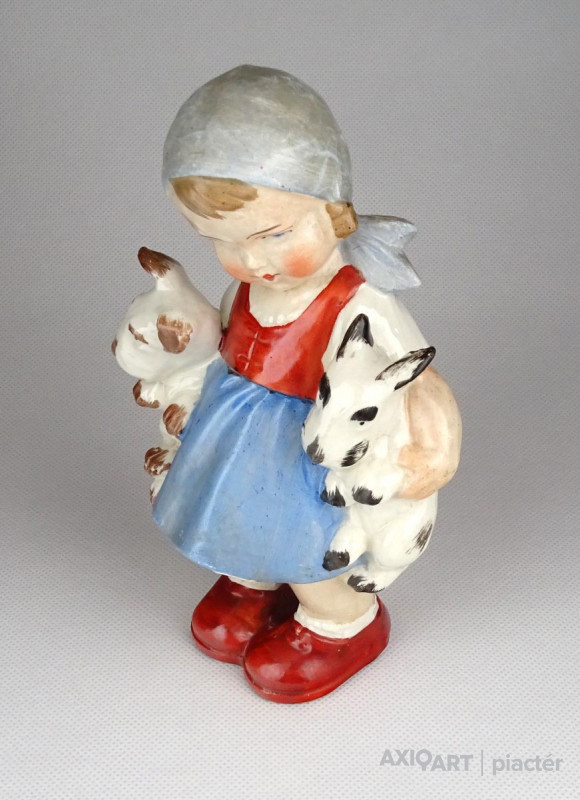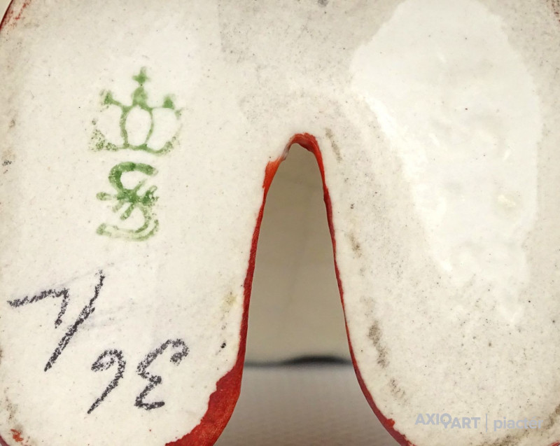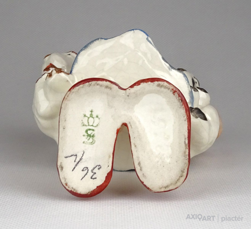 [1T504/Z040] Régi, hibátlan állapotú, talapzaton álló, szépen kidolgozott porcelán bohóc figura. Ritkán előforduló darab. Alján zöld koronás márkajelzés: ROSENTHAL SELB - BAVARIA Talapzaton formatervező neve: FRED. LIEBERMANN (Ferdinand Liebermann - Sculptor - szobrász, a Rosenthal legfontosabb, legnevesebb tervezője) Magasság: 15 cm Szélesség: 11.5 cm Súly: 0.205 kg   Ferdinand Liebermann Ferdinand Liebermann (1883–1941), the son of a toy manufacturer, was a German sculptor. He studied at the Munich School of Arts and Crafts and the Art Academy. After taking study trips to Rome and Paris, he opened a studio in 1910 in Munich. In the same year he received the Great Austrian Golden State Medal for a small bronze sculpture. Several exhibitions followed. He became one of the most important designers for the porcelain manufacturer Rosenthal AG. Liebermann’s work-spectrum encompasses bronze sculpturing, monumental sculpturing and memorials. In 1926 he received the professor title for monumental and portrait sculpturing in Munich.  After 1933, Liebermann  produced at the orders of the Nazi party 32 busts of Hitler (all 1½ life size), one of which was a commission from the city of Munich for the city hall. In appreciation he was made city councillor of the Capital of the Movement, the 'Haupstadt der Bewegung'. Liebermanns Führerbust was displayed at the XIX Venice Biennale 1934 ('Cancelliere del Reich Adolf Hitler') and also at the GDKs of 1937, 1938 and in the Münchener Kunstausttellungen 1934, 1940 and 1941. It is said that the busts designed by Liebermann were favoured by the German leader over all the others.  His sculpture 'L'Abbandoro' ('Abandoned') was displayed at the XIV Biennale 1924 in Venice; ‘Erhebung’ (‘Elevatione’ or ‘Elevation’) was displayed at the XIX Venice Biennale 1934 and later again at the GDK 1937, room 9. In 1938 his bronze ‘Abwehr’ (‘Defence’ or 'Ripulso') was displayed at the XXI Venice Biennale. Liebermann also completed a bronze bust of Hitler's half-niece Geli Raubal, who had shot herself in Hitler’s apartment in 1931. From this bust Hitler had numerous copies made for display in his residences.  At the Great German Art Exhibitions Ferdinand Liebermann was represented with 16 works, among them the two Hitler busts, the relief 'Wille’ (design for the Freikorps-monument), a bust of Riechsleiter Alfred Rosenberg, Reichsleiter Amann and two 'Kampf' sculptures.  In 1941, the year of his death, he created the massive sculpture for the  Freikorpsdenkmal in Munich. In the possession of the Bayerische Staatsgemäldesammlungen are the following works: 'Eva' (GDK 1939 room 35), 'Abwehr', 'In Erwartung', Frisches Lachen', 'Paolo', 'Rhythmus' and 'Knabe auf einem Waller reitend'. A copy of 'Eva' in bronze (72 cm high) was displayed at the exhibition ‘Kunst im 3. Reich, Dokumente der Unterwerfung’; the exhibition, instigated by the Frankfurter Kunstverein, was held from 1974 to 1975 in Frankfurt, Hamburg, Stuttgart, Ludwigshafen and Wuppertal.Ferdinand Liebermann: Ferdinand Liebermann: (1883–1941), the son of a toy manufacturer, was a German sculptor. He studied at the Munich School of Arts and Crafts and the Art Academy. After taking study trips to Rome and Paris, he opened a studio in 1910 in Munich. In the same year he received the Great Austrian Golden State Medal for a small bronze sculpture. Several exhibitions followed.r He became one of the most important designers for the porcelain manufacturer Rosenthal AG. Liebermann’s work-spectrum encompasses bronze sculpturing, monumental sculpturing and memorials. In 1926 he received the professor title for monumental and portrait sculpturing in Munich.  After 1933, Liebermann  produced at the orders of the Nazi party 32 busts of Hitler (all 1½ life size), one of which was a commission from the city of Munich for the city hall. In appreciation he was made city councillor of the Capital of the Movement, the 'Haupstadt der Bewegung'. Liebermanns Führerbust was displayed at the XIX Venice Biennale 1934 ('Cancelliere del Reich Adolf Hitler') and also at the GDKs of 1937, 1938 and in the Münchener Kunstausttellungen 1934, 1940 and 1941. It is said that the busts designed by Liebermann were favoured by the German leader over all the others.  His sculpture 'L'Abbandoro' ('Abandoned') was displayed at the XIV Biennale 1924 in Venice; ‘Erhebung’ (‘Elevatione’ or ‘Elevation’) was displayed at the XIX Venice Biennale 1934 and later again at the GDK 1937, room 9. In 1938 his bronze ‘Abwehr’ (‘Defence’ or 'Ripulso') was displayed at the XXI Venice Biennale. Liebermann also completed a bronze bust of Hitler's half-niece Geli Raubal, who had shot herself in Hitler’s apartment in 1931. From this bust Hitler had numerous copies made for display in his residences.  At the Great German Art Exhibitions Ferdinand Liebermann was represented with 16 works, among them the two Hitler busts, the relief 'Wille’ (design for the Freikorps-monument), a bust of Riechsleiter Alfred Rosenberg, Reichsleiter Amann and two 'Kampf' sculptures.  In 1941, the year of his death, he created the massive sculpture for the  Freikorpsdenkmal in Munich. In the possession of the Bayerische Staatsgemäldesammlungen are the following works: 'Eva' (GDK 1939 room 35), 'Abwehr', 'In Erwartung', Frisches Lachen', 'Paolo', 'Rhythmus' and 'Knabe auf einem Waller reitend'. A copy of 'Eva' in bronze (72 cm high) was displayed at the exhibition ‘Kunst im 3. Reich, Dokumente der Unterwerfung’; the exhibition, instigated by the Frankfurter Kunstverein, was held from 1974 to 1975 in Frankfurt, Hamburg, Stuttgart, Ludwigshafen and Wuppertal.
