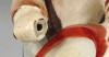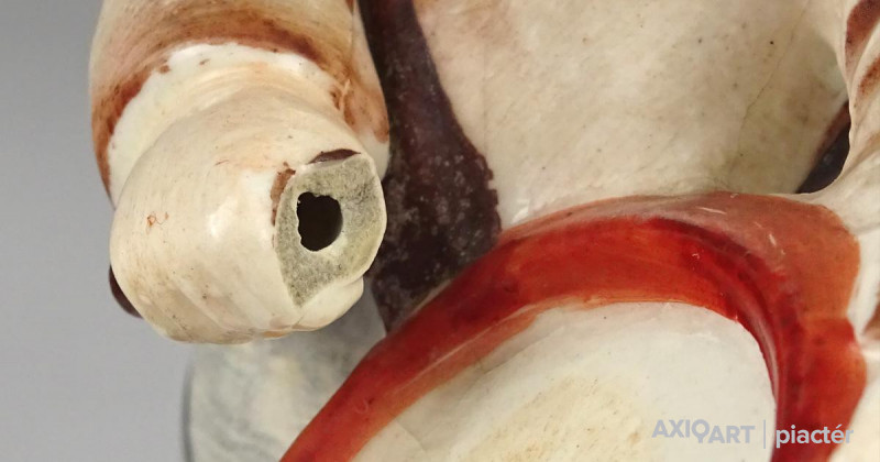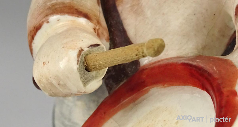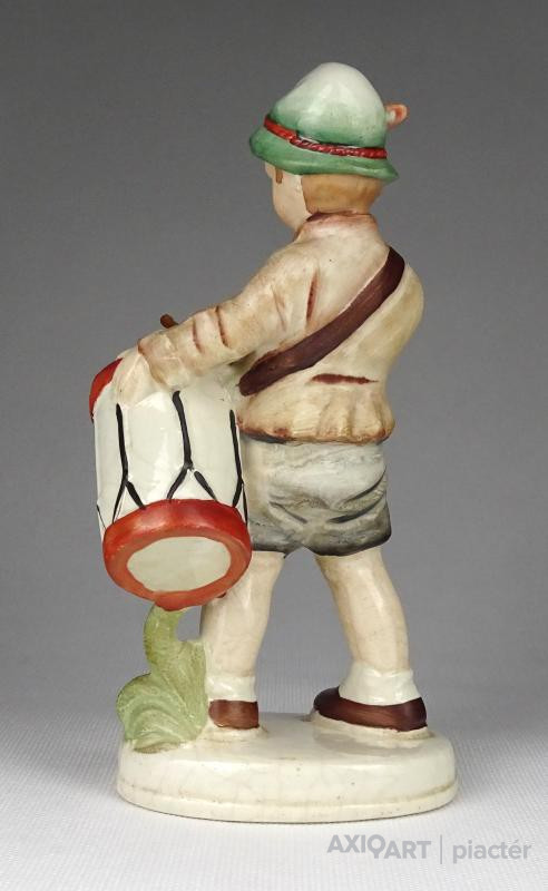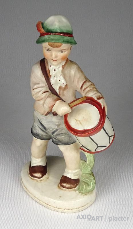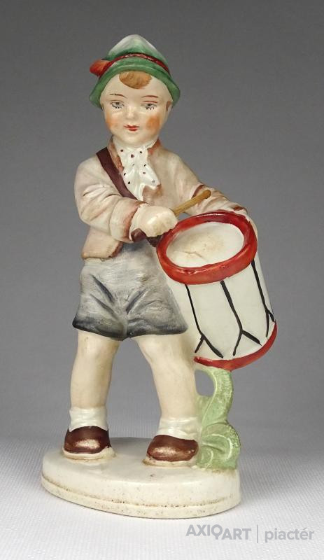 Régi, talapzaton álló, kézi festéssel díszített, porcelán, dobot verő kisfiú szobor. A dobverő faragott fa dobverővel pótolt.