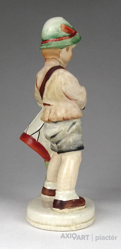 [1J124/UZ-K] Régi, talapzaton álló, kézi festéssel díszített, porcelán, dobot verő kisfiú szobor. A dobverő faragott fa dobverővel pótolt. Alján zöld márkajelzés: lásd fotó. ( SITZENDORF ) Formaszám: 39567 Magasság: 17.5 cm Szélesség: 8.5 cm Súly: 0.175 kg