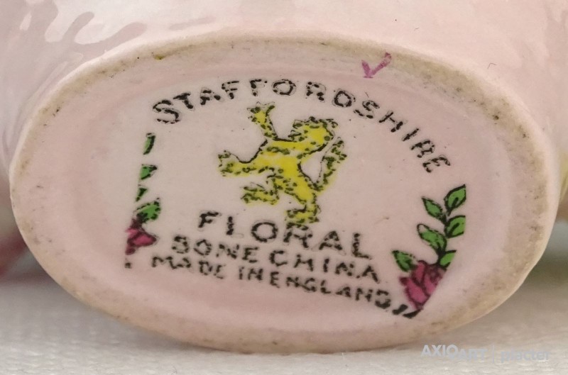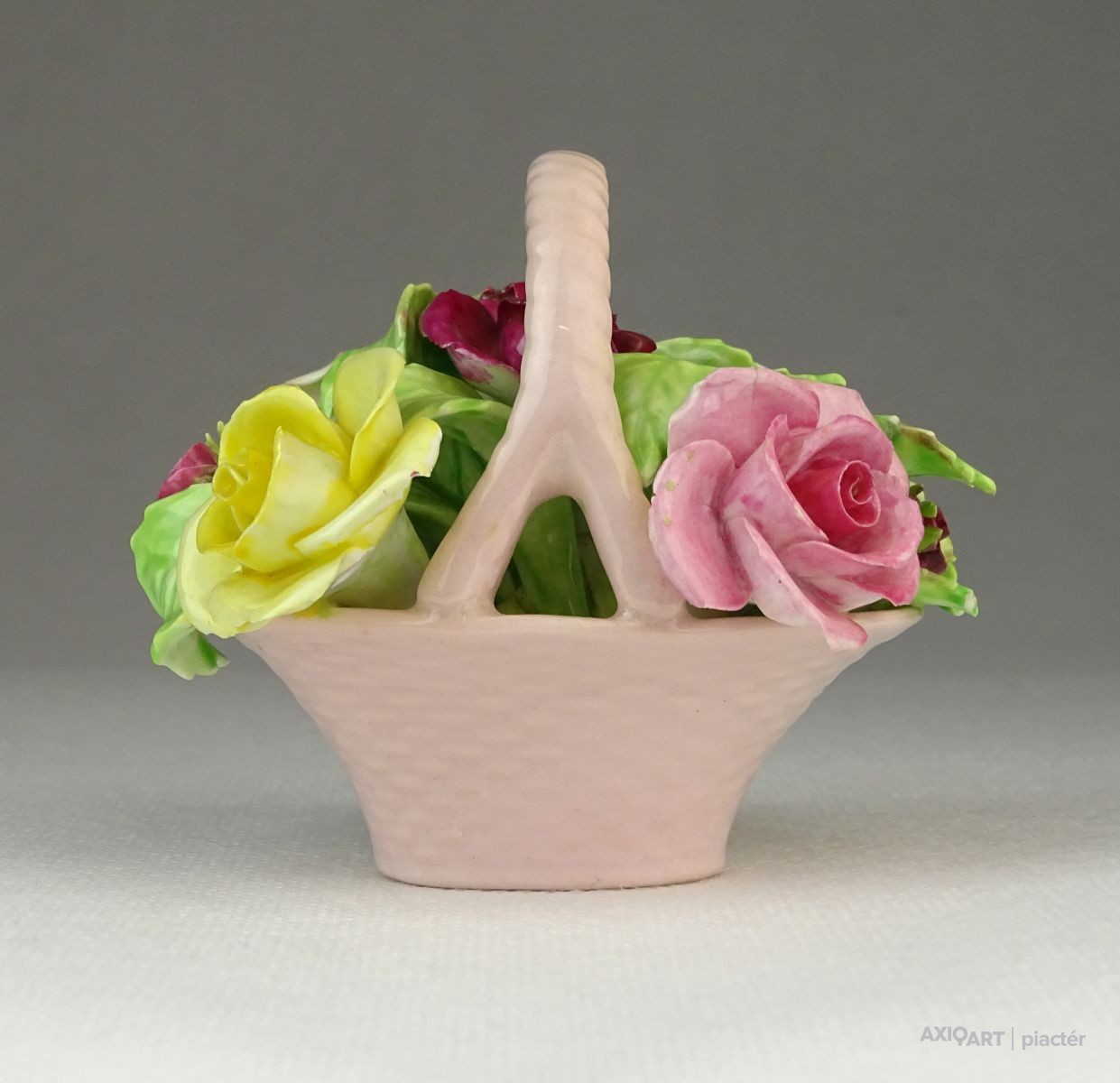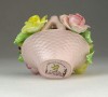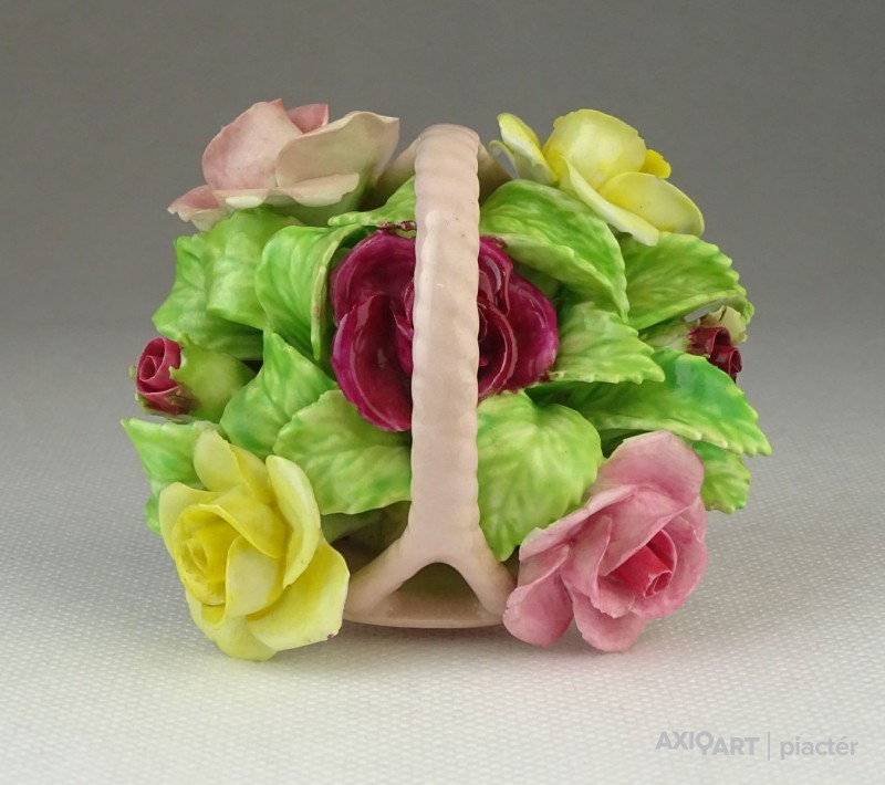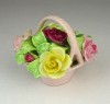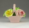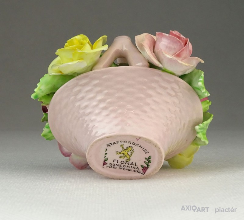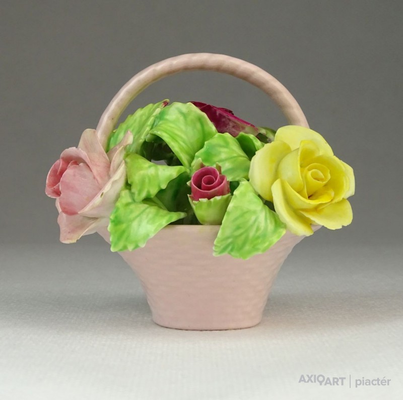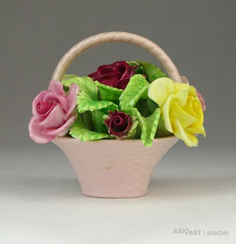 [0P954/Z053] Régi jelzett, szép állapotú, kézi festett porcelán virág, rózsák rózsaszín kosárban. Alján márkajelzés: STAFFORDSHIRE FLORAL SONE CHINA MADE IN ENGLAND A szirmokon és leveleken egy-két kisebb alig észrevehető lepattanás található. Magasság: 7 cm Szélesség: 7.5 cm Hosszúság: 8 cm Súly: 0.168 kg