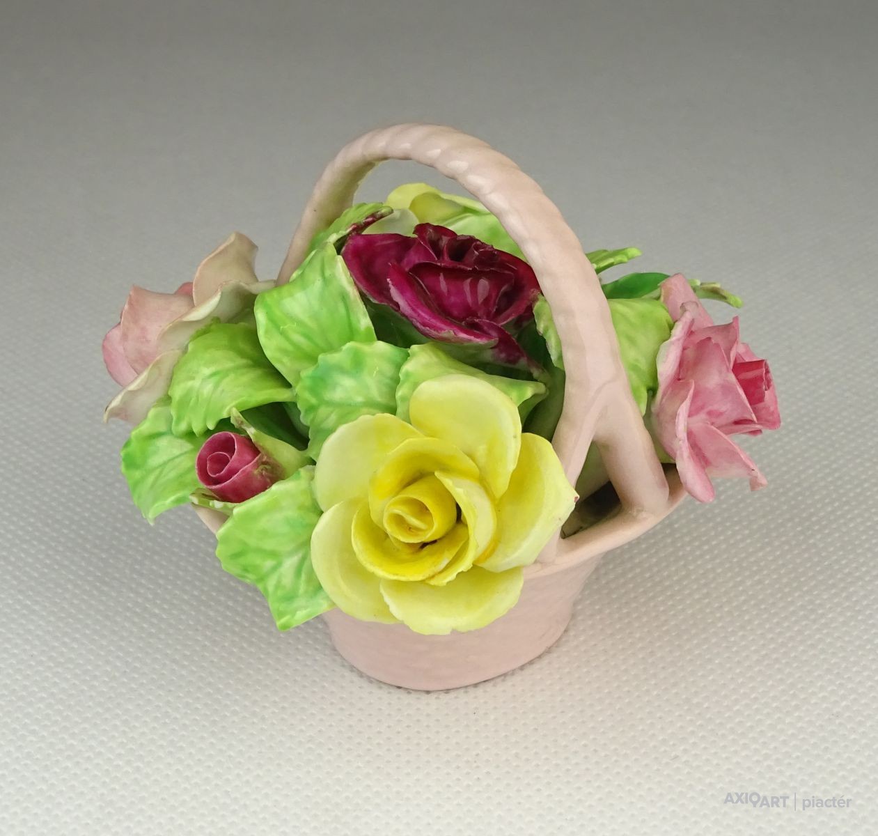 Régi jelzett, szép állapotú, kézi festett porcelán virág, rózsák rózsaszín kosárban.