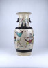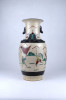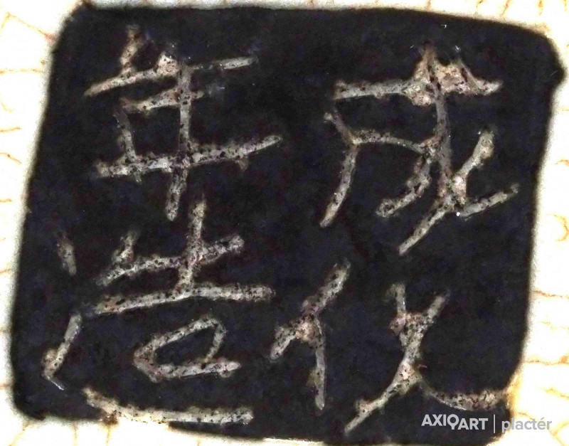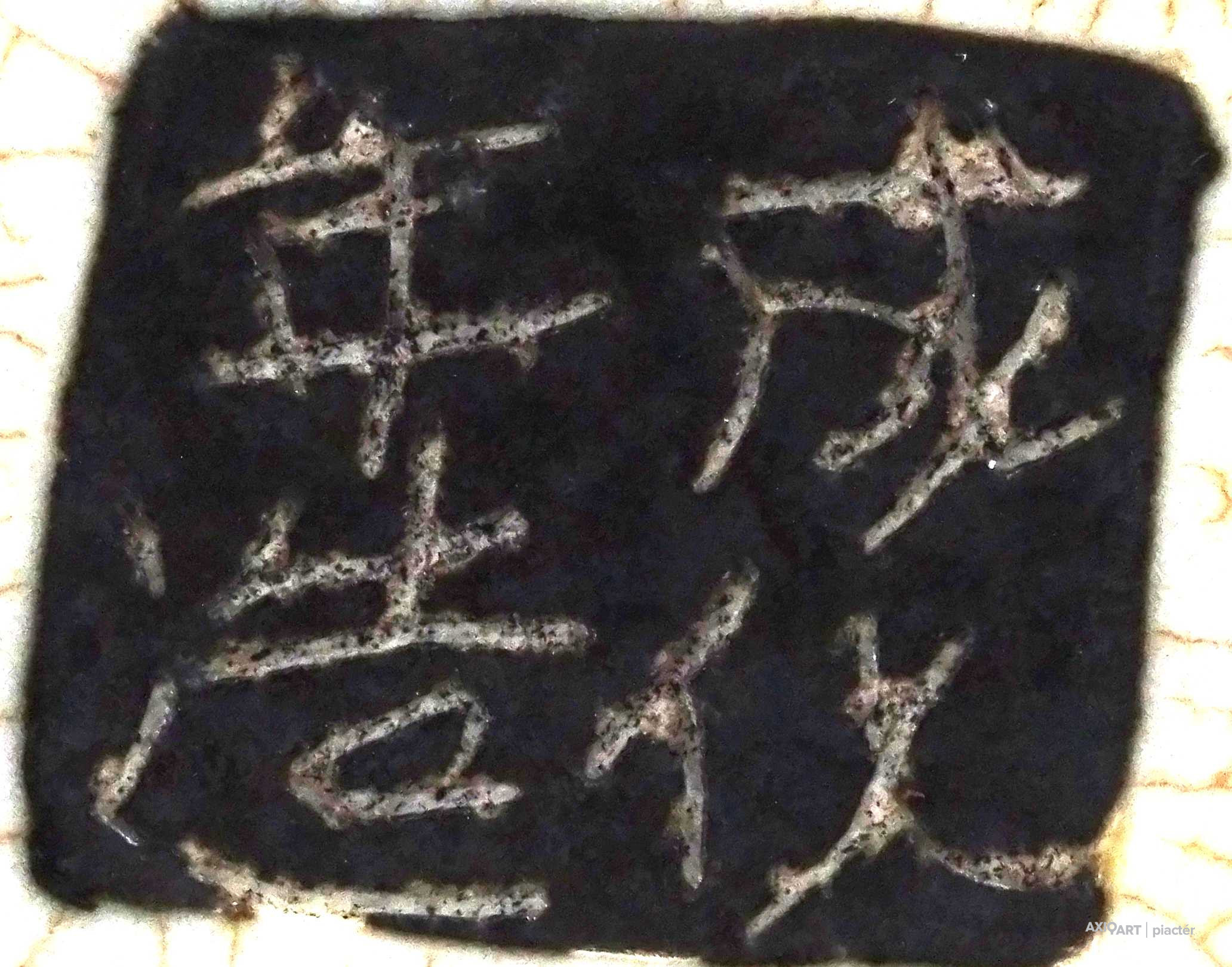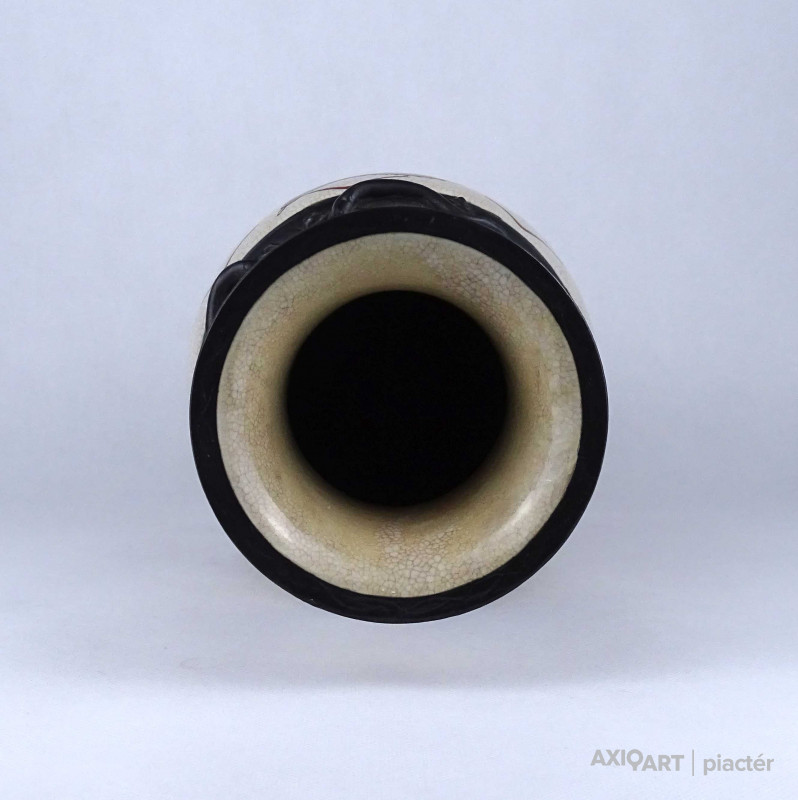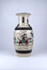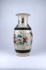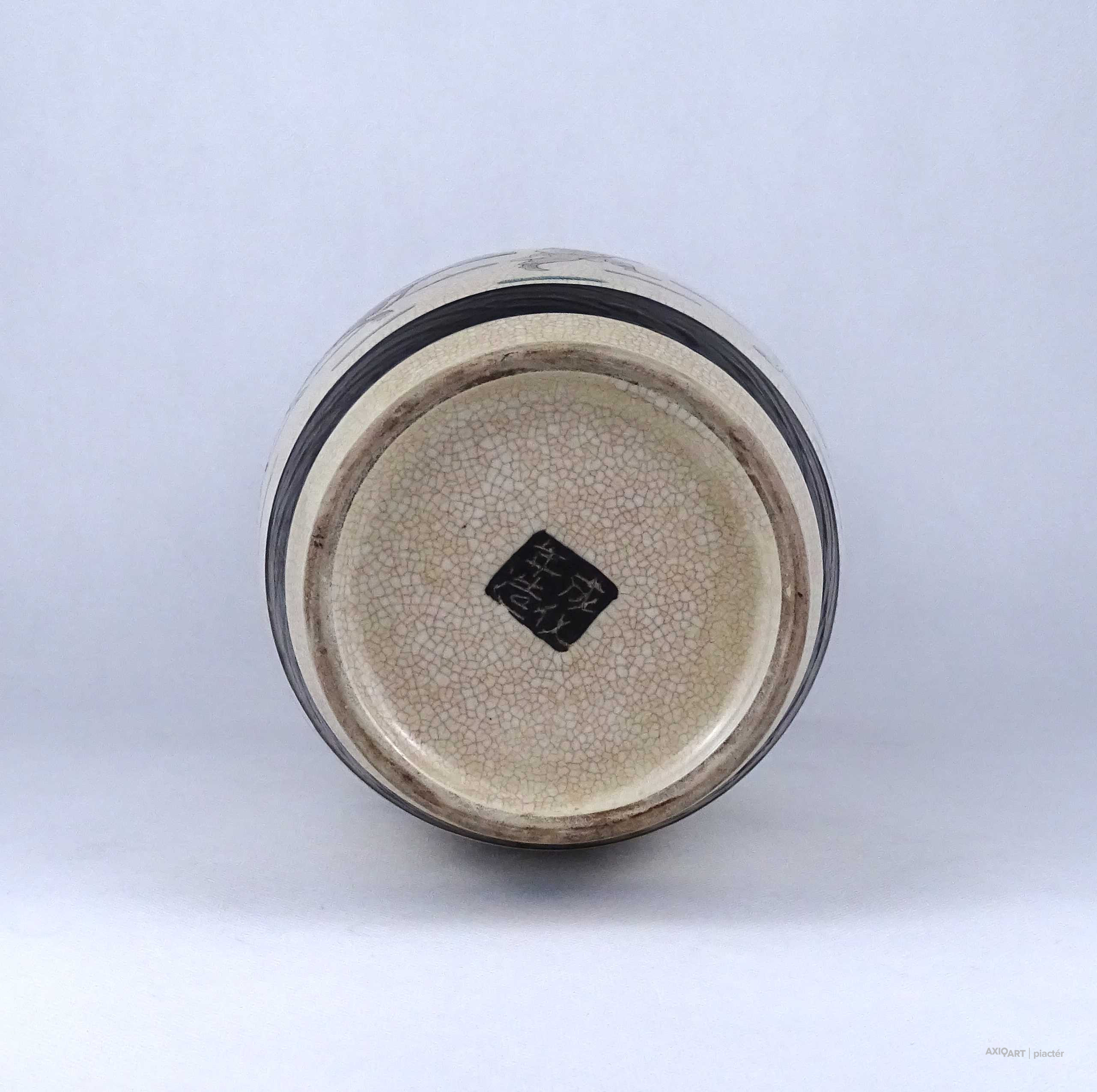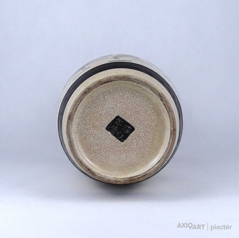 [1Z914/Z017] Régi, nagyméretű, szép állapotú, jelzett, kerámia váza, díszváza. Oldalán kézzel festett lovas és szamuráj harcos alakok, katonák, nyakán négy darab bronz színű kerámia sárkány alak látható. Szája restaurátor által szakszerűen javított. Alján kalligrafikus jelzés, lásd fotó. Magasság: 35.3 cm Szélesség: 18 cm Súly: 2.11 kg