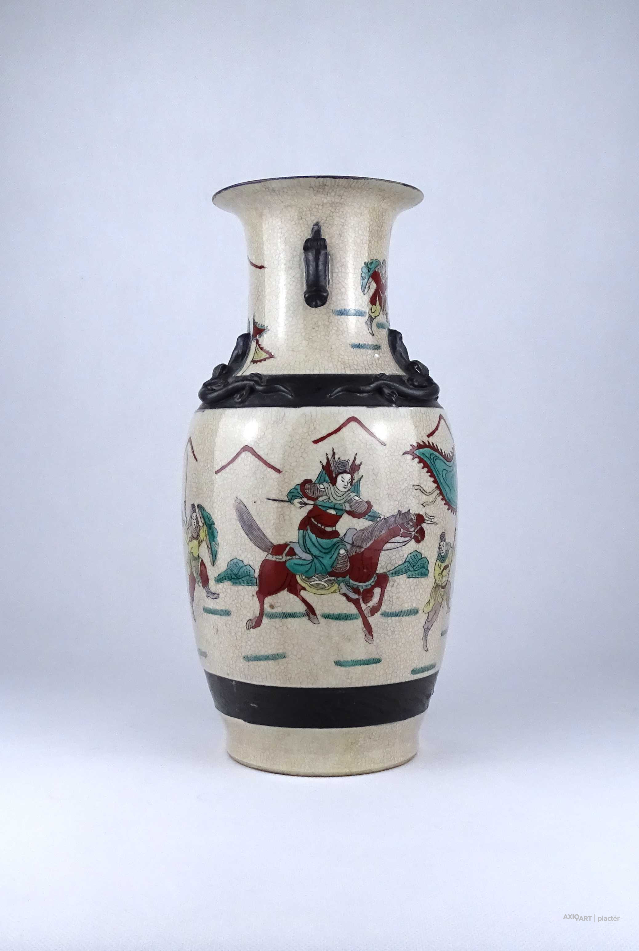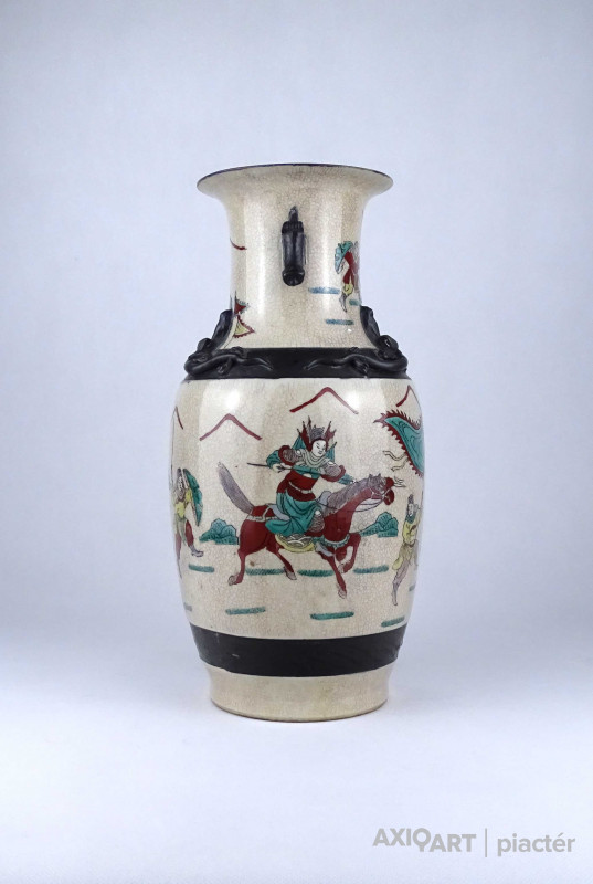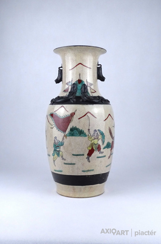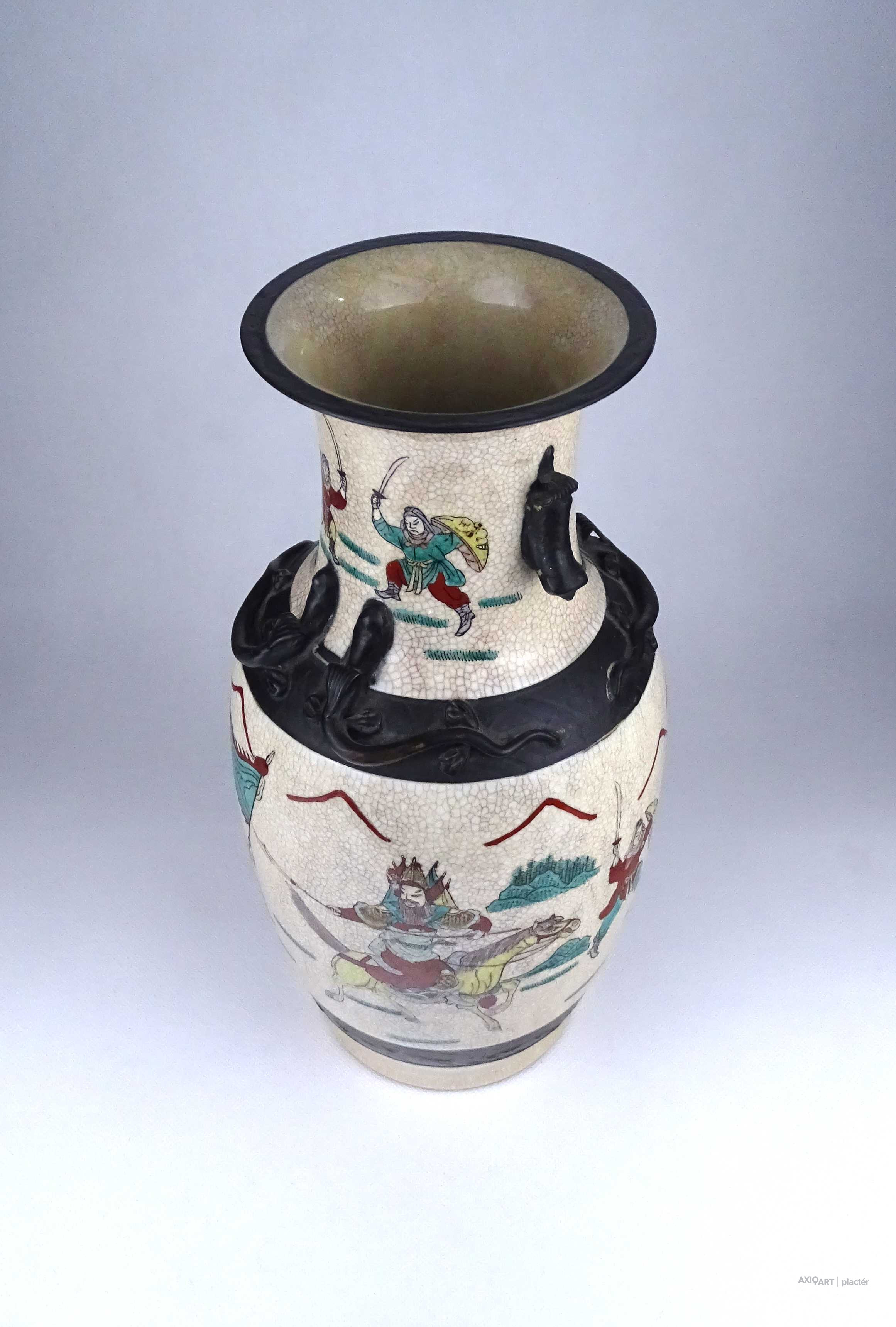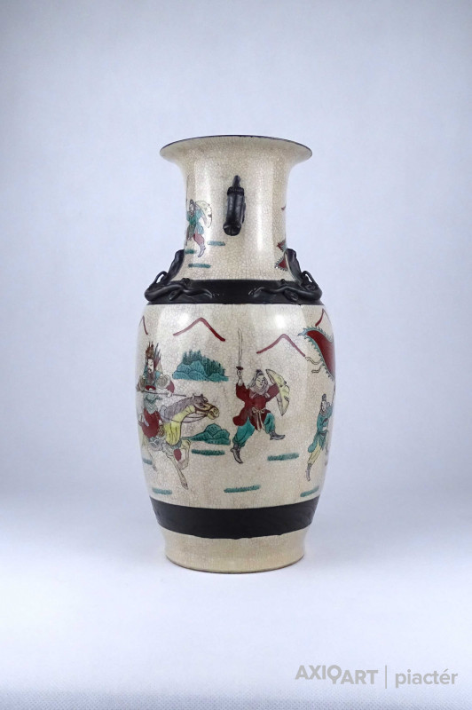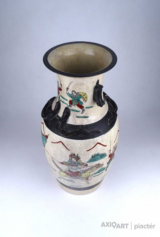 Régi, nagyméretű, szép állapotú, jelzett, kerámia váza, díszváza. Oldalán kézzel festett lovas és szamuráj harcos alakok, katonák, nyakán négy darab bronz színű kerámia sárkány alak látható. Szája restaurátor által szakszerűen javított.