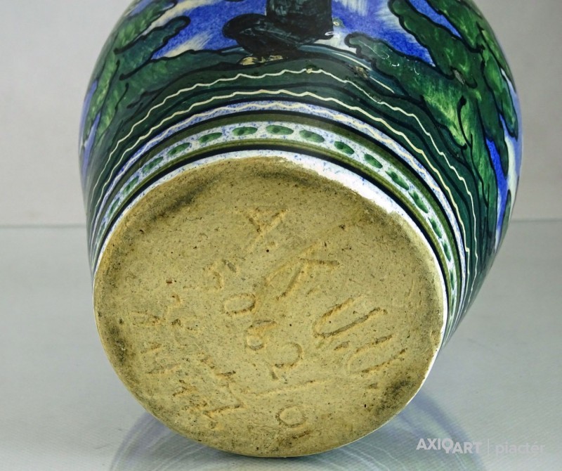 [0K238/BX-7 ] Hibátlan állapotú, kézi festéssel díszített kerámia váza. Alján jelzés: AKUU 5062/6 A váza felső peremét profi restaurátor javította. Magasság: 22 cm Szélesség: 16 cm Súly: 1.238 kg