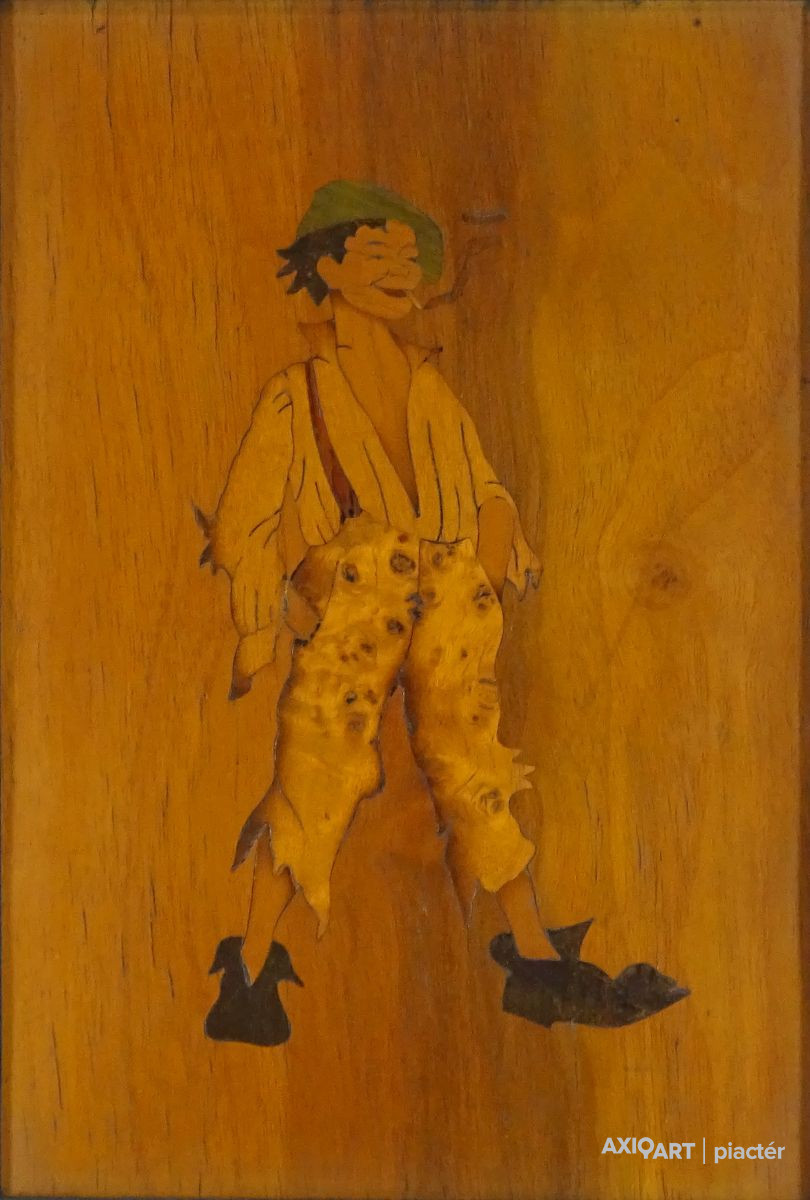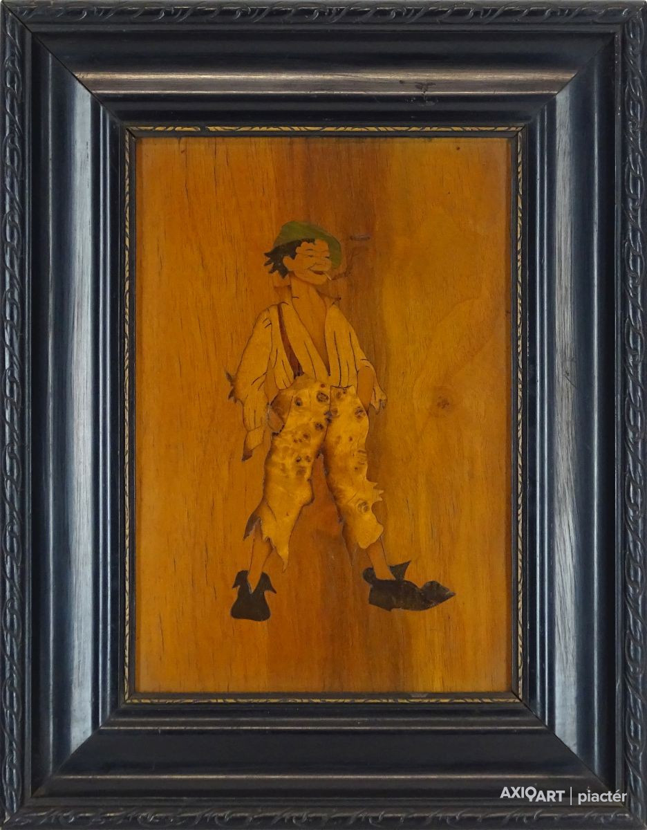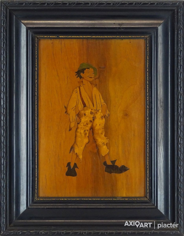 [0Y338/033] Régi, szép állapotú, sok fával elkészített műves intarzia munka, kézimunka, fekete keretben. Magasság: 33 cm Szélesség: 26 cm Súly: 0.55 kg