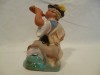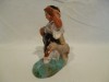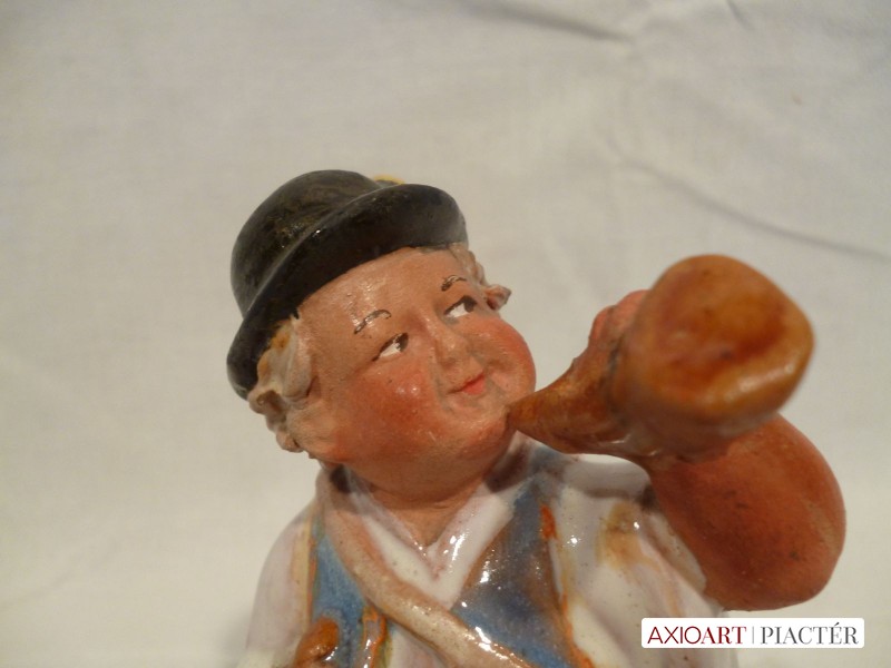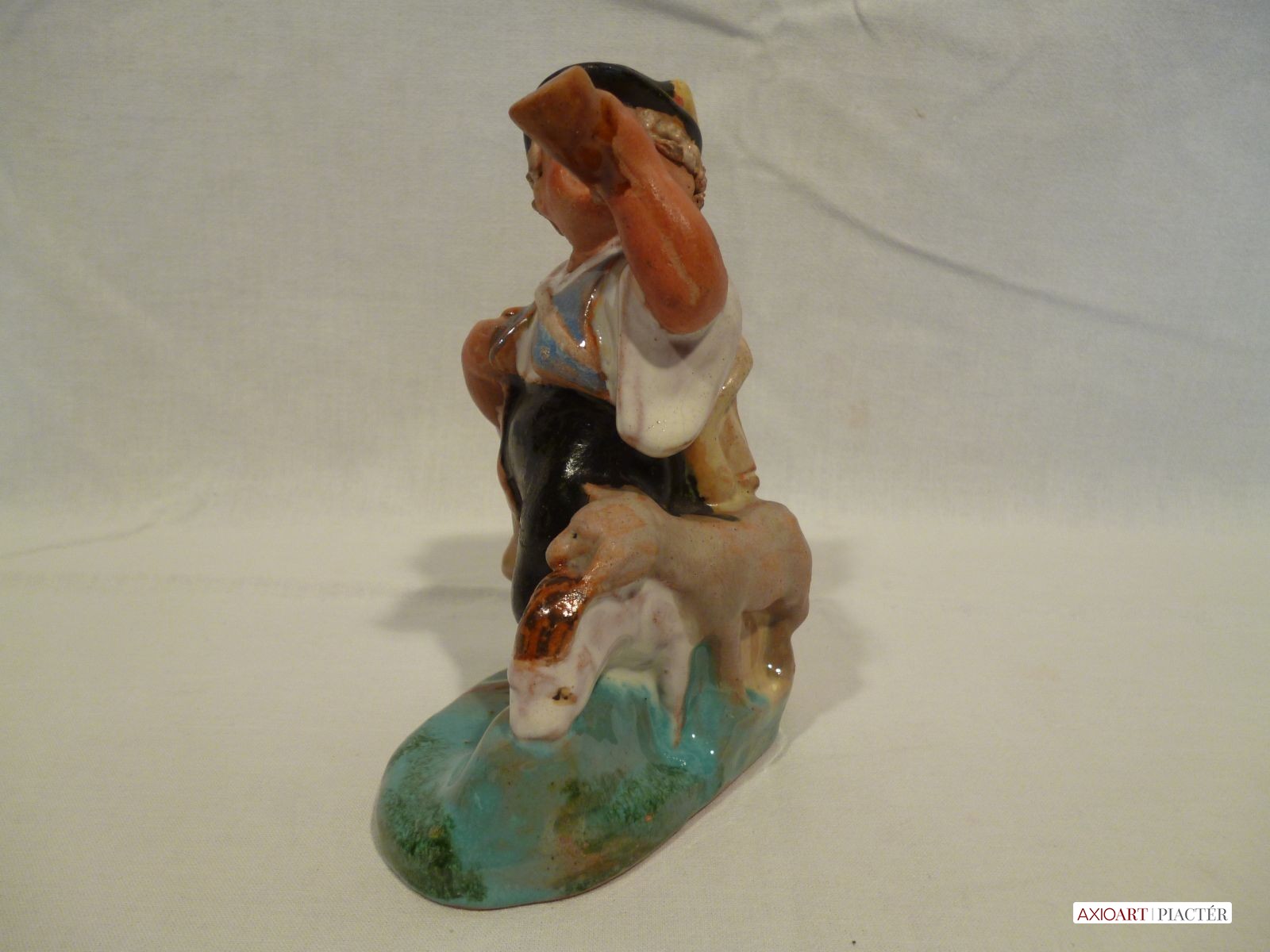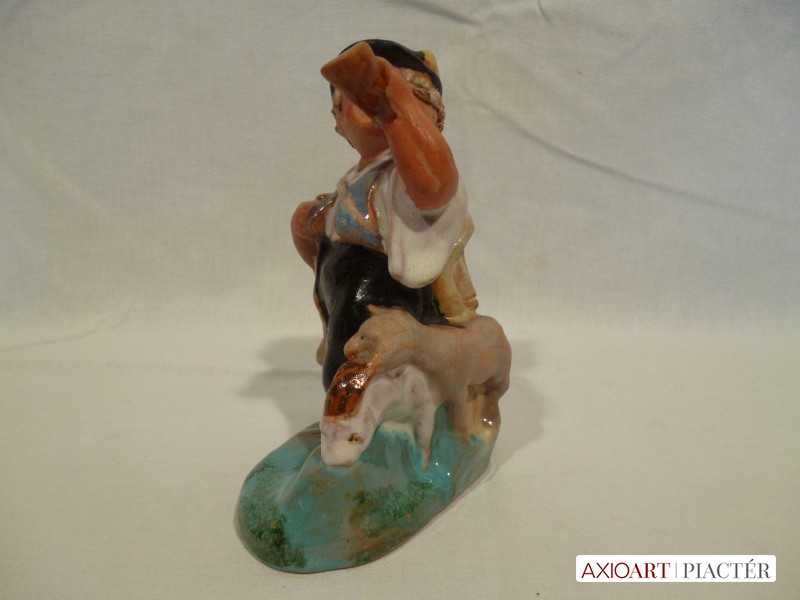 Hibátlan, szép, alakos Szécsi kerámia, kürtöt fújó népviseletbe öltözött kisfiú birkával, kecskével.