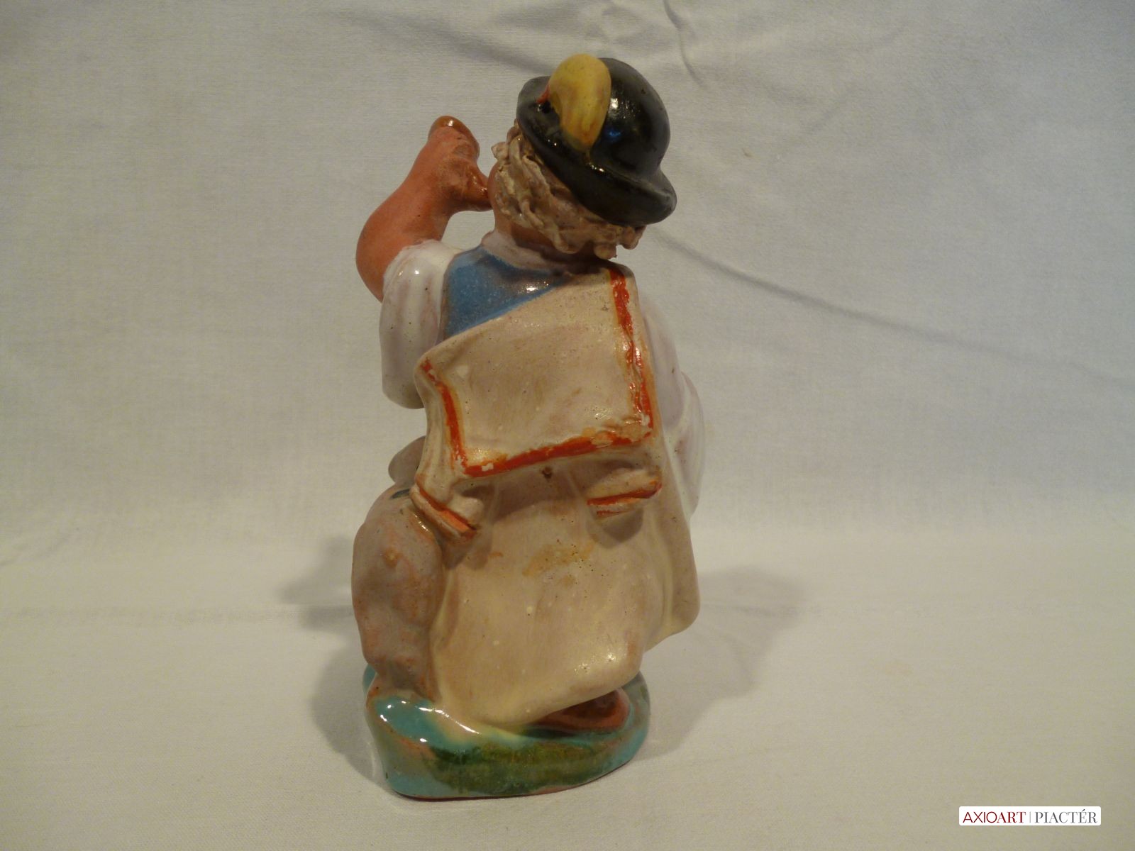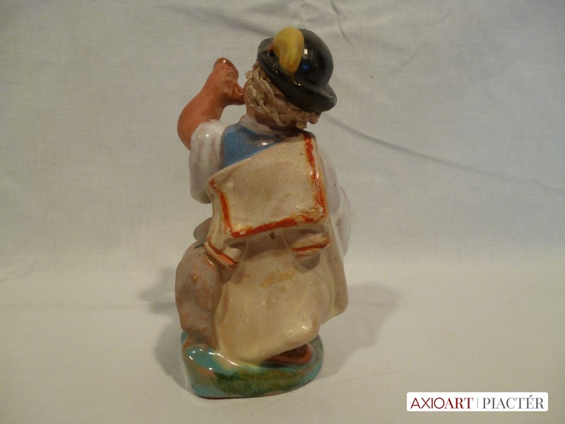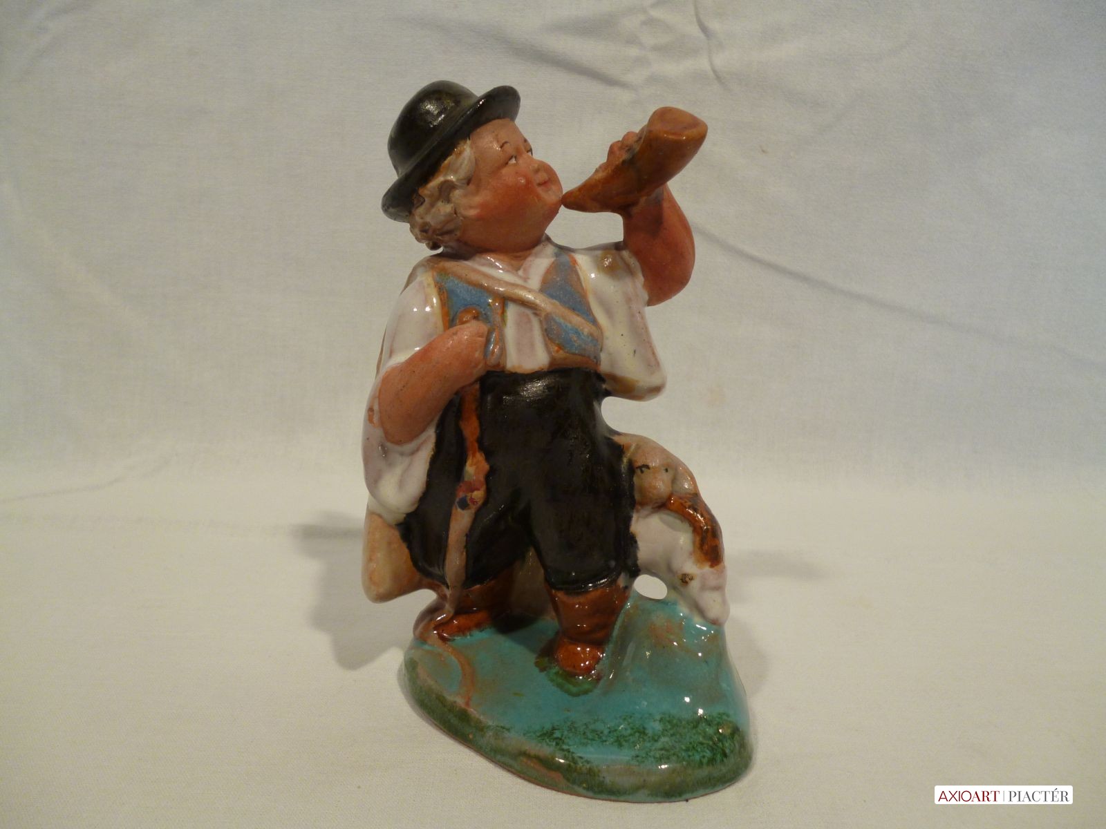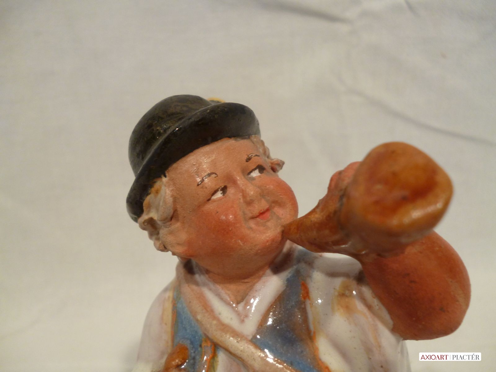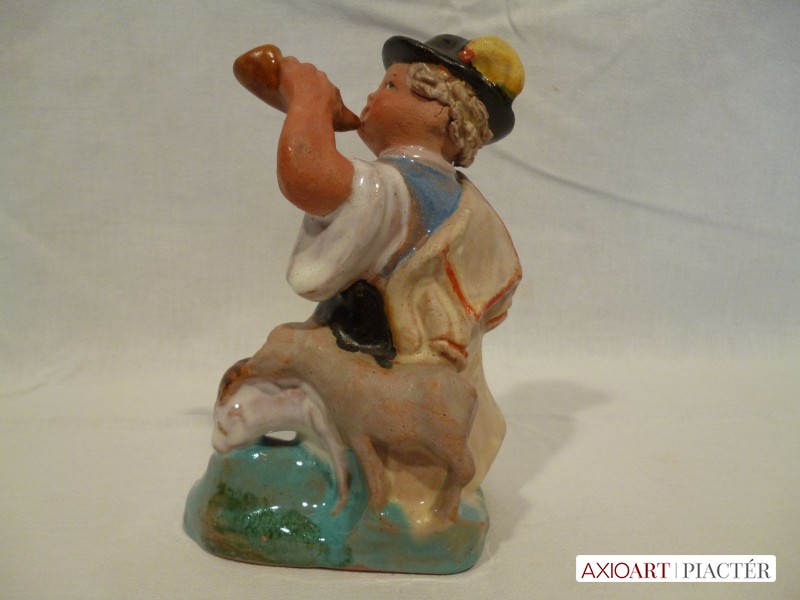 [3314/X002] Hibátlan, szép, alakos Szécsi kerámia, kürtöt fújó népviseletbe öltözött kisfiú birkával, kecskével. Alján mélynyomású Szécsi jelzés, mellette régi korabeli Szécsi Kerámia papírvignetta. Magasság: 15 cm Szélesség: 9.5 cm Súly: 0.511 kg   Súlya 511 g, magassága 15 cm, szélessége 9,5 cm.