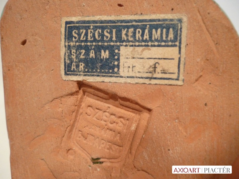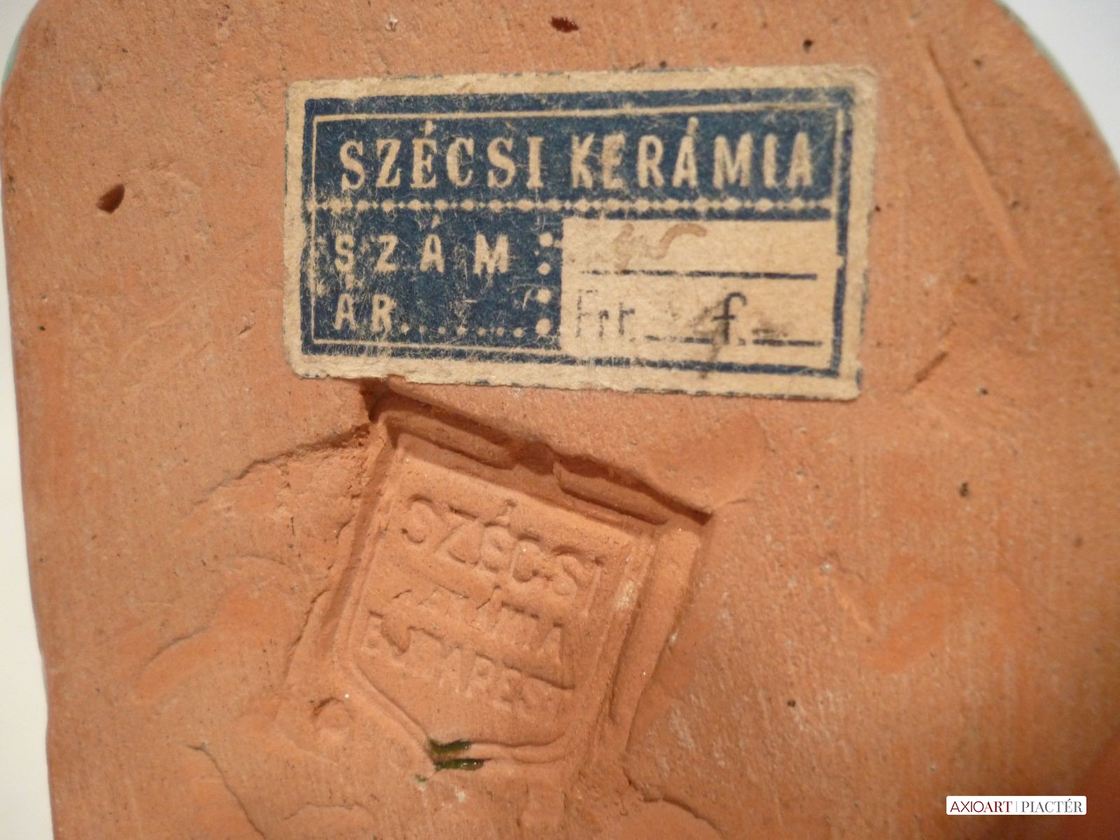 Alján mélynyomású Szécsi jelzés, mellette régi korabeli Szécsi Kerámia papírvignetta.