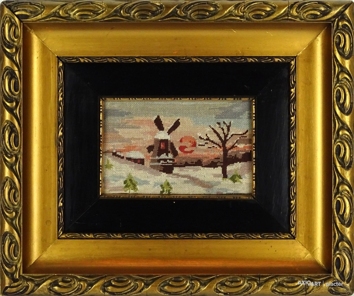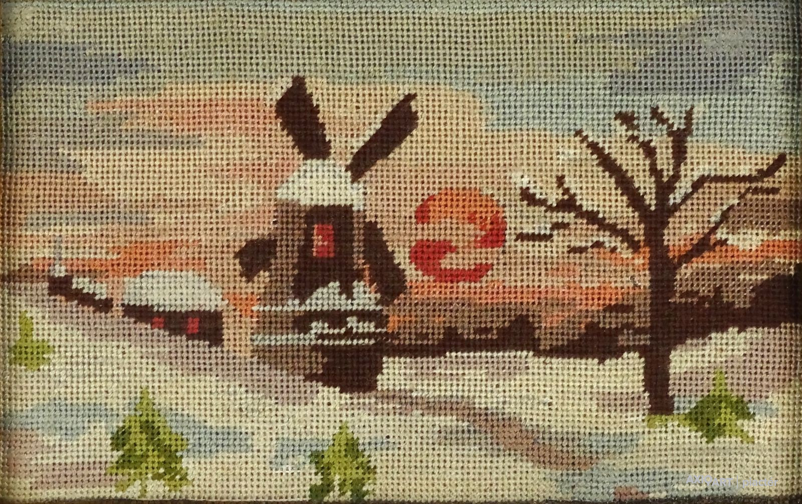 [1F860/026] Régi aranyozott keretben, üveglap mögött található régi kézimunka, tűgobelin. Szélmalom naplementében. Magasság: 26 cm Szélesség: 30.5 cm Súly: 1.045 kg