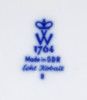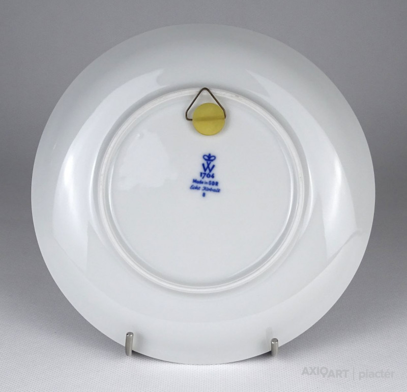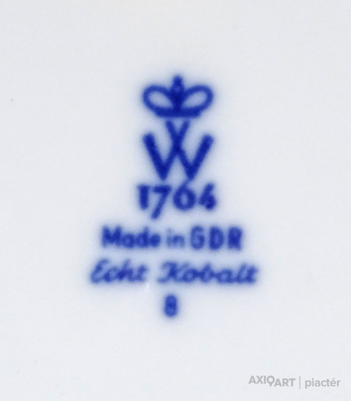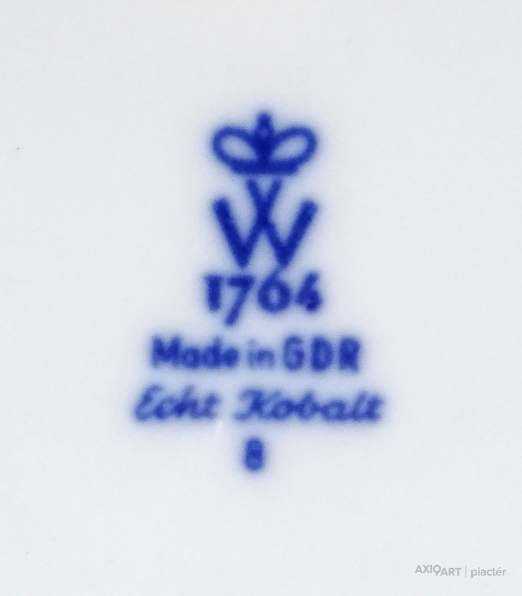 [1N022/X139] Régi, arannyal és kobaltkékkel díszített porcelán dísztál, fali dísz tányér. Akasztási lehetőséggel rendelkezik. Alján kék koronás márkajelzés: W 1764 MADE IN GDR ECHT KOBALT Szélesség: 19.5 cm Súly: 0.225 kg