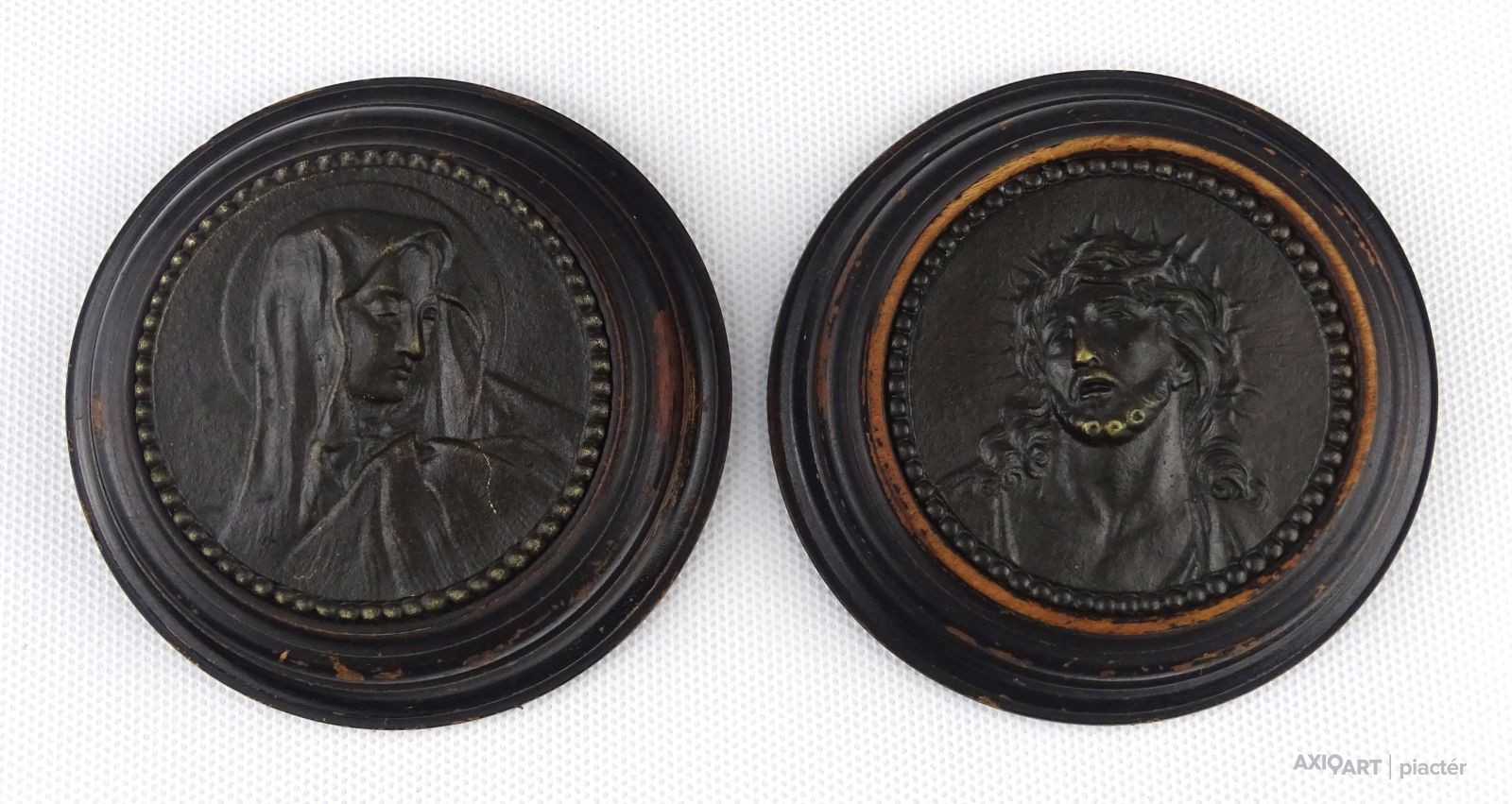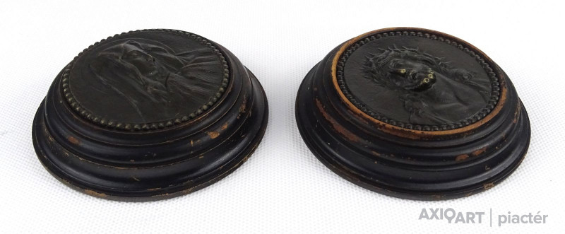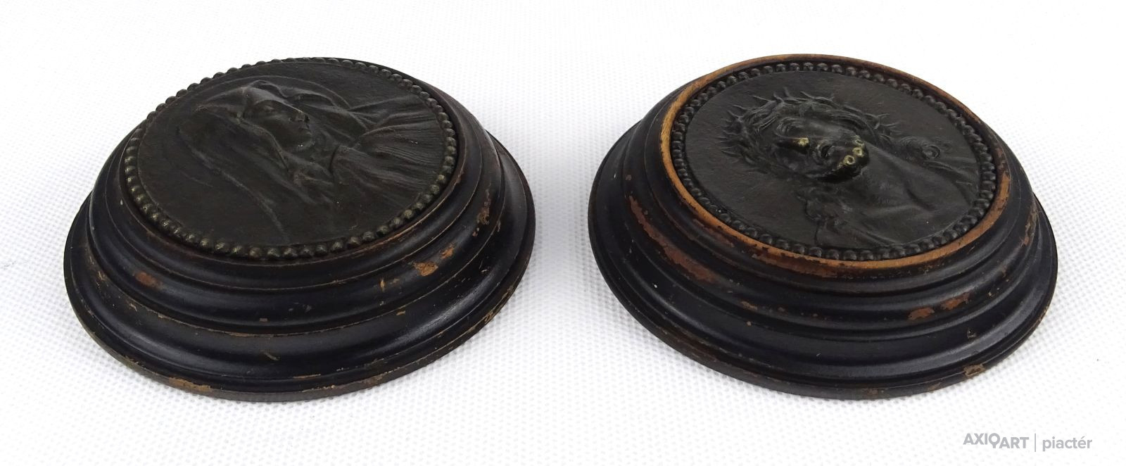 Szűz Máriát és Jézust ábrázoló, fa keretre illesztett falra akasztható réz plakett, fali plakett, vallási kegytárgy párban.