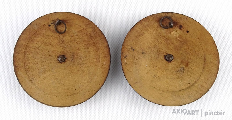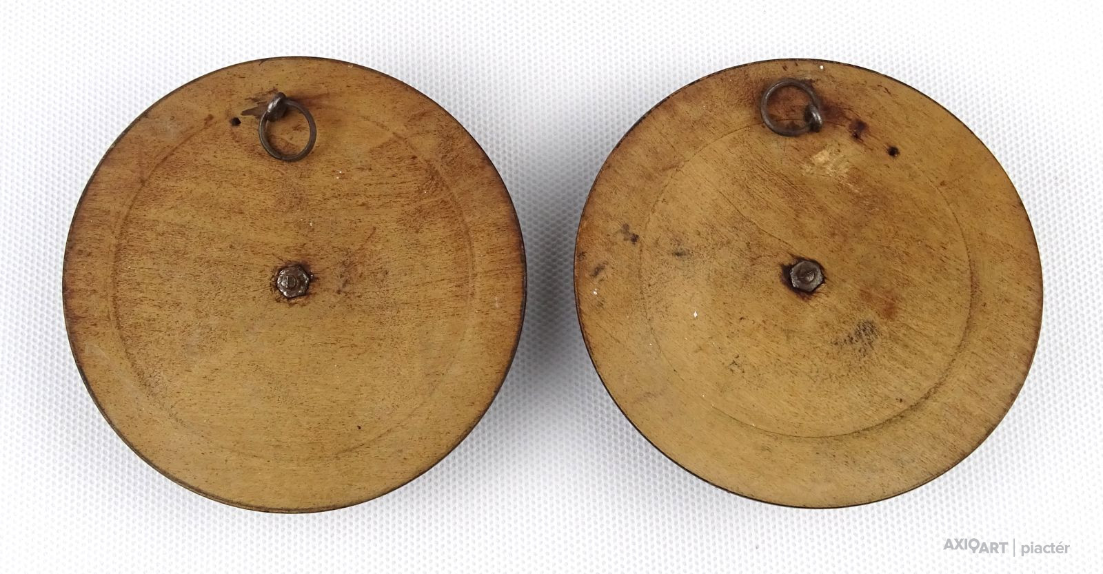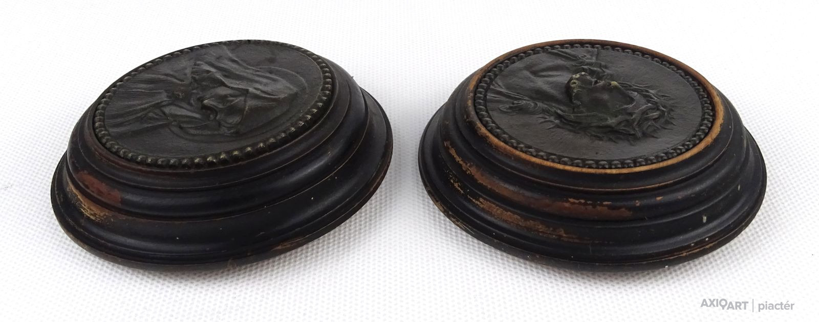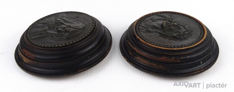 [1N928/X002] Szűz Máriát és Jézust ábrázoló, fa keretre illesztett falra akasztható réz plakett, fali plakett, vallási kegytárgy párban. Szélesség: 9.3 cm Súly: 0.21 kg