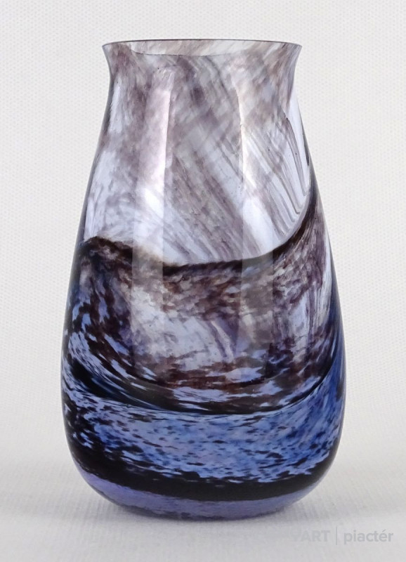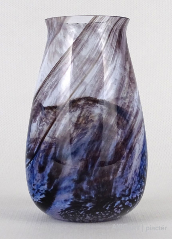 [1O212/Z046] Hibátlan állapotú, színezett fúvott üveg váza, talpas üveg váza vagy üveg kupa. Skandináv design üveg. Talpán a fúvás szakítás nyoma szépen kivehető. Magasság: 14 cm Szélesség: 6.5 cm Súly: 0.215 kg Erik Höglund  Ugrás a navigációhozUgrás a kereséshez A papról (1902–1971) lásd Erik Höglund (pap) . Erik Höglund Született 1932. január 31. Karlskrona , Blekinge megye Halál 1998. január 27. (65 éves) Maria Magdalena plébánia , Stockholm Állampolgárság svéd Foglalkozás/megbízás Tervező, művész Ismert Tervezés Koszta Boda számára Feleség Maerit Levin (sz. 1953–1967; elvált) Ingrid Höglund (sz. 1974–1998; halála) Partner Monica Backström (partner 1968-1972) Rokonok Anna Höglund (lánya) Erika Höglund (lánya) Albin Höglund (fia)  Erik Sylvester Höglund , 1932. január 31-én született Karlskronában , 1998. január 27-én halt meg a stockholmi Maria Magdalena plébánián , svéd szobrász , festő , grafikus és üvegművész . Életrajz  Erik Höglund Torsten Höglund és Jenny Jonsson könyvelő fia, valamint Tore Enar Höglund szobrász és grafikus öccse volt . Tanulmányait a stockholmi Konstfackban végezte , először dekorfestészetet Fritz Sjöströmnek , majd szobrászatot Robert Nilssonnak , végül 1951–1952-ben Harald Sallbergnek grafikát . Erik Rosén , a Boda Üveggyár 1953 és 1973 között dolgozó tervezője fogadta be , és ez idő alatt jött el, hogy átalakítsa a svéd műüveggyártást az üvegtermékek kinézetére vonatkozó új ötletek bevezetésével. Ösztöndíja többek között metszetekkel kapcsolatban, a színek és a földes, aszimmetrikus dizájn sikeres lett a külpiacon. Bodán töltött ideje alatt fenyővel, vasalással és bútorokkal is foglalkozott. Később más üveggyárakkal is együttműködött, például a Pukeberggel , a Lindshammarral és a Studioglas Strömbergshyttannal . 1968-ban Monica Backström üvegművésszel megalapította a Backström & Höglund Design AB formatervező céget, amely bútorok, háztartási eszközök és használati tárgyak tervezésével foglalkozik. Höglund tagja volt a Vet Hut AB-nek is, amelyet 1971-ben alapított a Boda glasbruk tíz tervezője szokásos munkájuk mellett: Erik Höglund, Monica Backström, Ann Wolff , Göran Wärff , Bertil Vallien , Ulrica Hydman-Vallien , Per Arne. Lundahl, Liselotte Jörgensdotter, Gunhild Sinnemark és Rolf Sinnemark . Erik Höglund szobrászként számos köztéri dekorációt készített különféle anyagokból, köztük téglából és betonból. Ezt követően gyakran dolgozott együtt olyan építészekkel, mint Jon Höjer a Höjer & Ljungqvistnél , Bengt Gate és Lars Ågren .  Kiállítás  A stockholmi Palmcrantzska gyárban korábban Ulf G. Lindén állandó kiállítása volt Erik Höglund alkotásaival. Ezt a gyűjteményt 2009 szeptemberében a karlskronai Blekinge Múzeumnak adományozták.  Közművek válogatásban  Két állat és egy játék (1966), gránit, Bredängs Torg Stockholmban. Fiskargumman a karlskronai halpiacon. Négyzet alakú oszlop Gävle-ben Erik Höglund mintegy 150 köztéri dekorációt készített üvegből, bronzból, kovácsolásból, téglából, gránitból és betonból. Kerékpárosok I (1956), bronz, a trelleborgi oktatási intézmény Kerékpárosok II (1957), bronz, a karlskogai oktatási intézmény Kerékpárosok III (1957), bronz, stockholmi Hökarängens iskola Az élő szó (1958), festmény a nybrói városi könyvtárban Kerékpárosok IV (1958), bronz, Handverkstorget Sandvikenben Kerékpárosok V (1959), Sjöboskolan, Borås Falfestmény üvegablak (1962) a borgholmi templomban Kristallglasskogen (1964), üvegmozaik fal, Ellagårdsskolan Täby községben A tudás fája (1966), vasműves és üveg, Folkets Hus Nybroban Állatszobrok (1964-67), gránit, Hallsberg Két állat és egy játék (1966), gránit, Bredängs torg Stockholmban Tó szökőkúttal (1967), gránit, Trelleborg Ülő terhes nő (1971), bronz, Haganässkolan Älmhultban Hajó halászokkal (1972), vas, üveg és fa, Hotel Witt Kalmarban Négyzet alakú oszlop (1971-74), beton, Stortorget Gävle -ben A súlyemelő (1974), bronz, az östersundi sportcsarnok Gyűrűk a vízen (1976-77), bronz, Rödeby Torg , Karlskrona önkormányzat Az élet játéka , tégladomborműves fal és régi érmék , üveg, mindkettő 1979–1980, Sparbanken Linköpingben Úszók (1980), kovácsoltvas, úszócsarnok Rödebyben , Karlskrona önkormányzat Cirkuszgömb (1980-81), kovácsoltvas, Kristianstad megyei tanács Fiskargumman (1981-82), bronz, halpiac Karlskronában Az olvasócsalád (1983), bronz és üveg, Kalmár Városi Könyvtár Életmentő (1985), réz, úszócsarnok Haganässkolanban Älmhultban Dans bort i vägen (1985), bronz, Torsås volt Anya és gyermeke , bronz, Trelleborg A büszke apa és Két ember , bronz, Eskadern lakónegyed Linköpingben Játssz szobrot téglából, Lönneberga óvoda, Norra Fäladen Lundban  Forrás: wikipédia