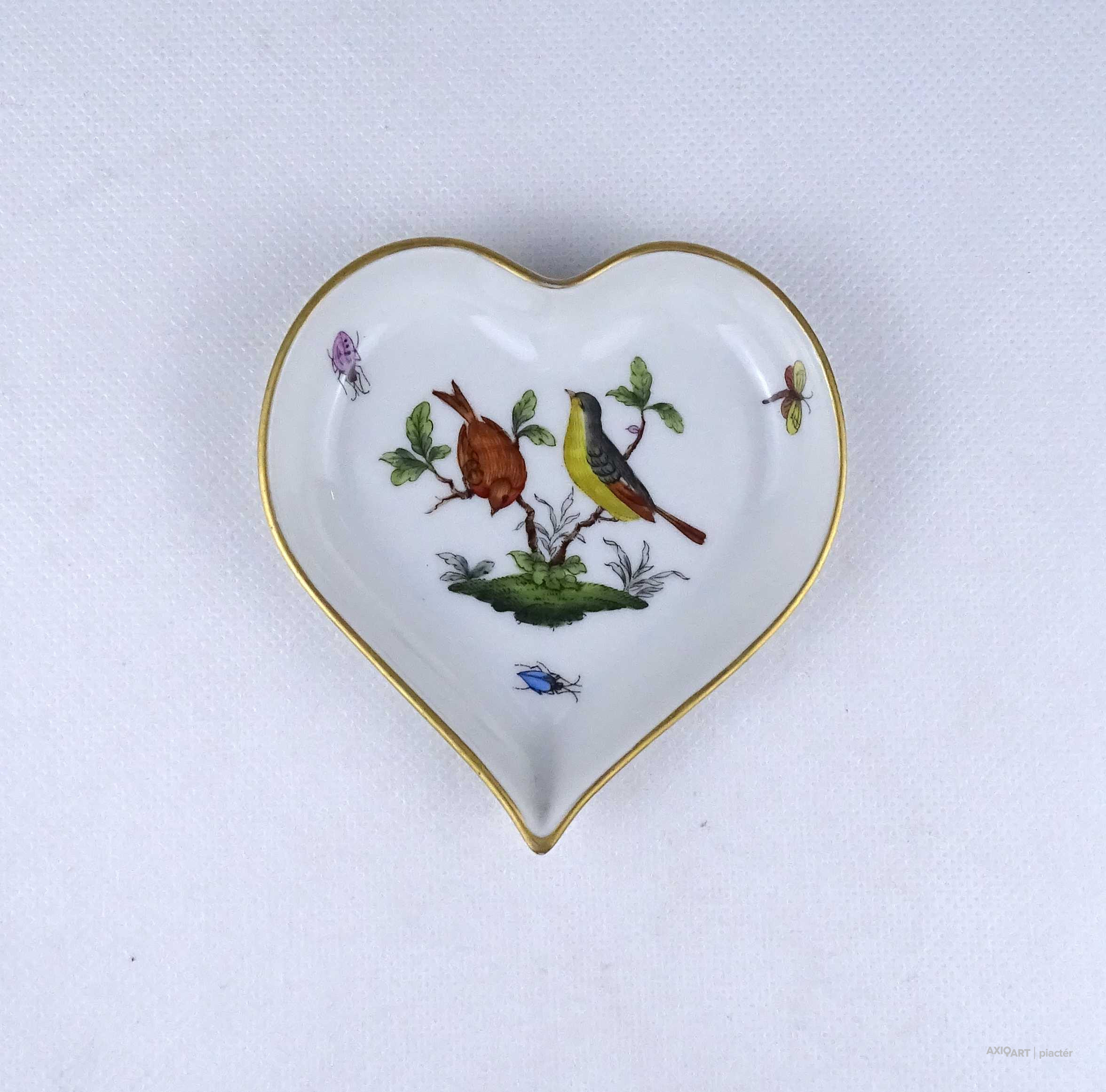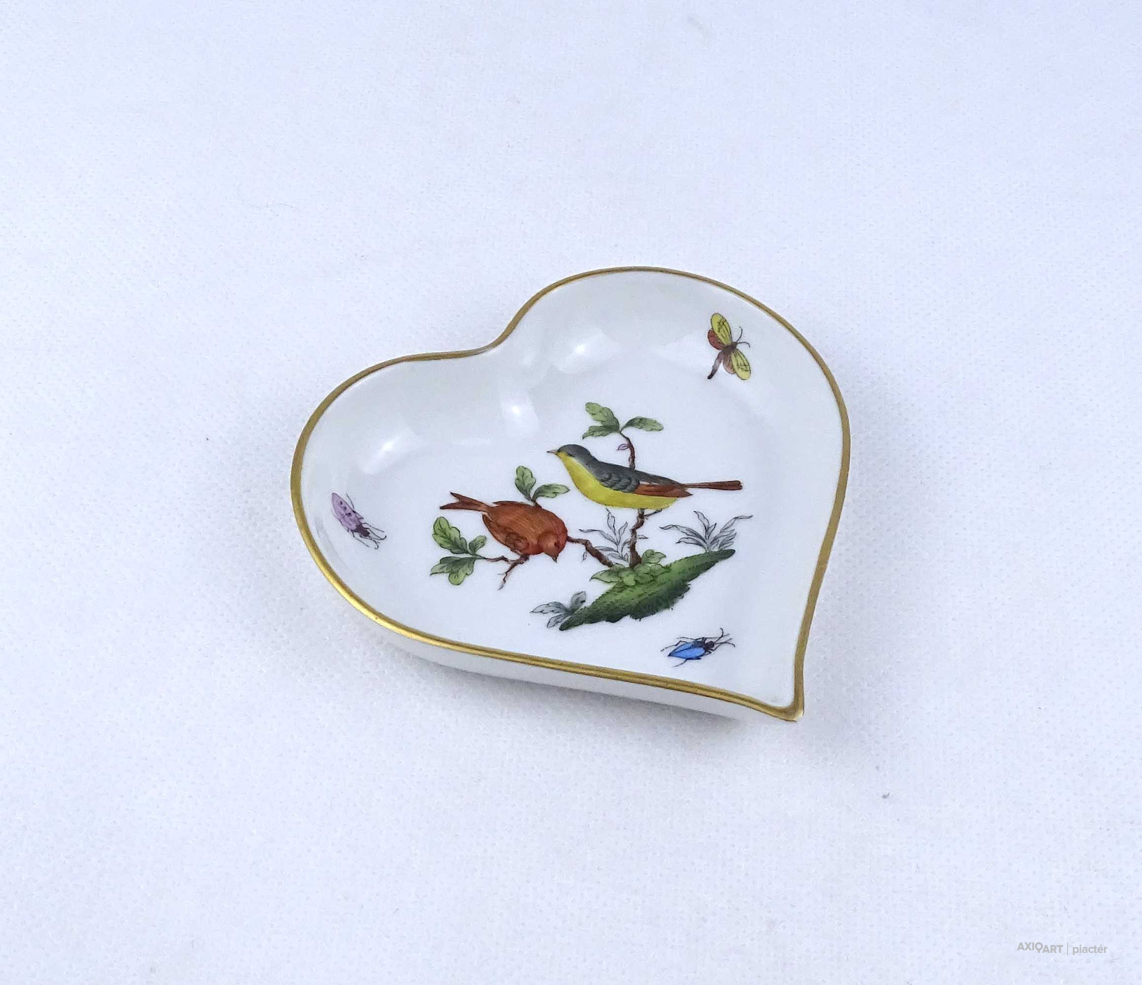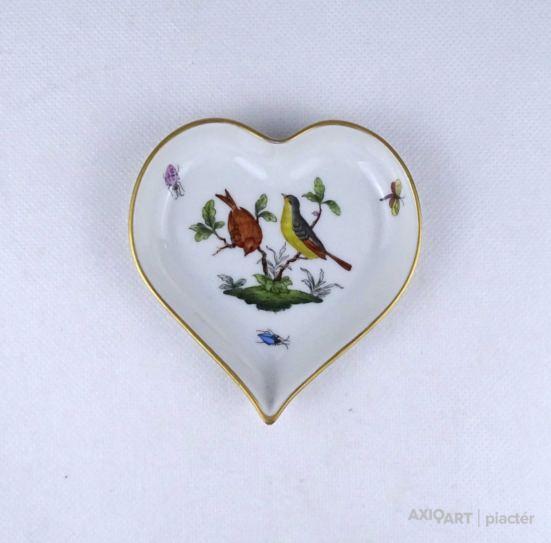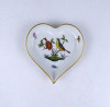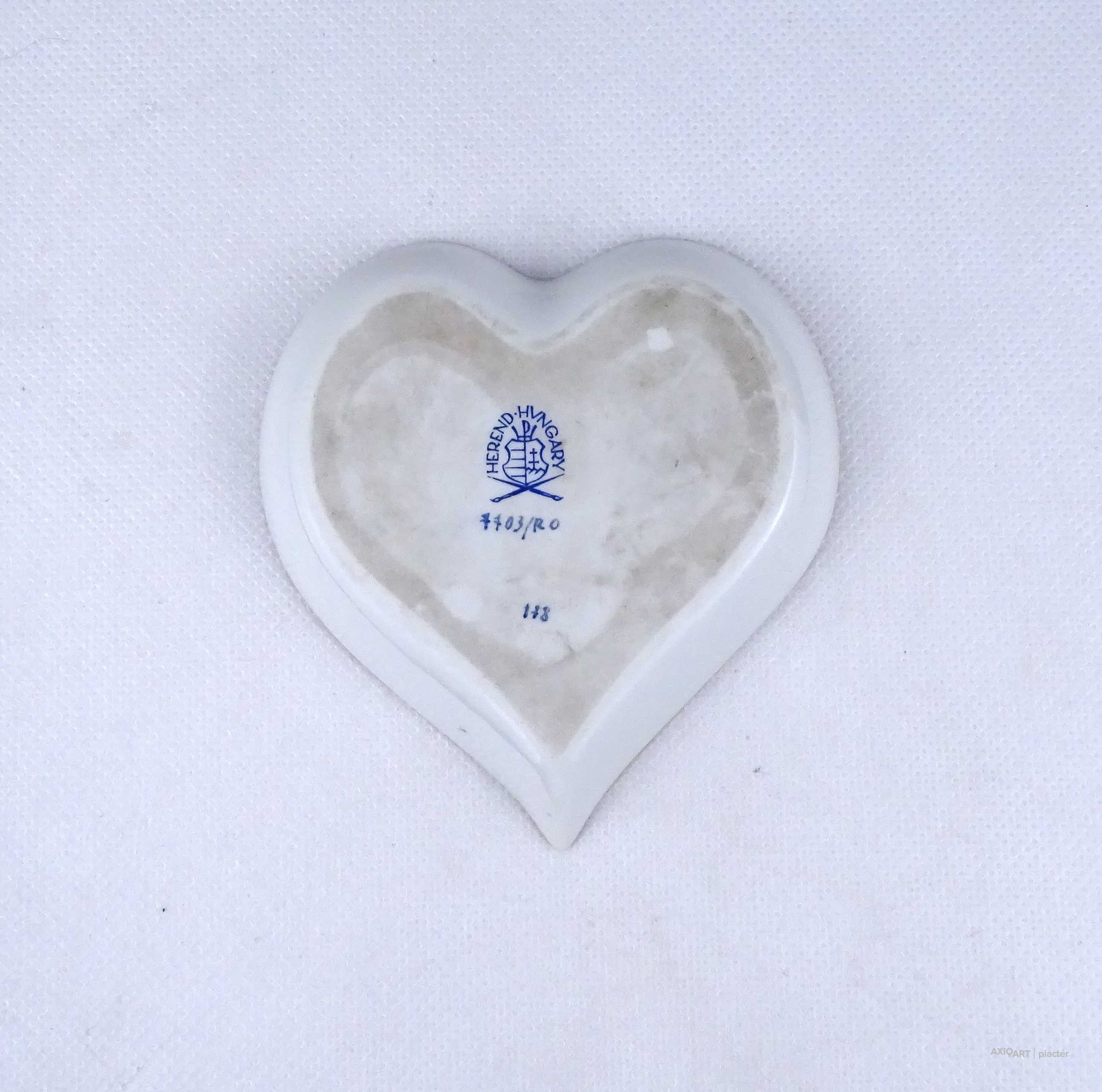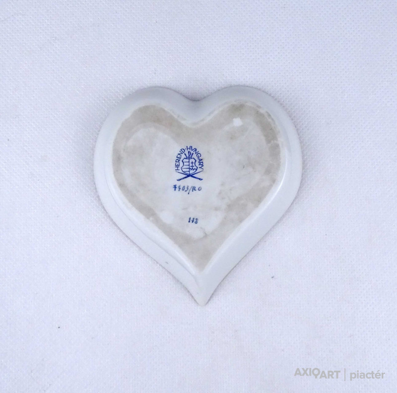 [1Z780/Z009] Régi, hibátlan állapotú, szív alakú rothschild mintás Herendi porcelán tál, hamutál. Alján kék Herendi márkajelzés: HEREND HUNGARY Mélynyomással: HEREND Formaszám kékkel: 7703/RO Magasság: 1.7 cm Szélesség: 9.8 cm Hosszúság: 10.3 cm Súly: 0.055 kg