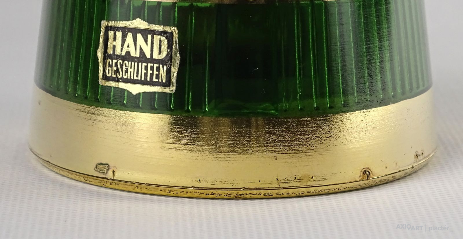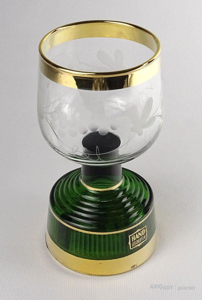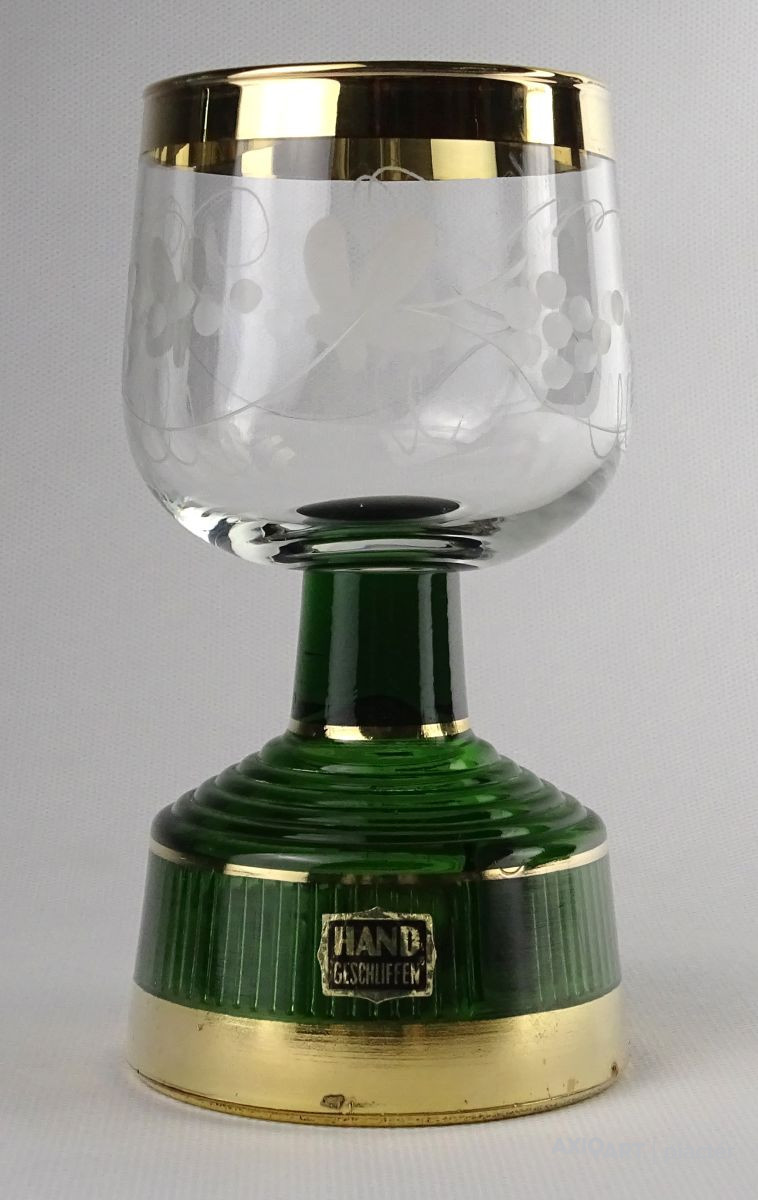 [1P757/X210] Régi hibátlan állapotú, aranyozott, zöld talpas üveg pohár kehely. Oldalán csiszolt szőlőfürt díszítéssel. A talpában zenélő szerkezet található. Oldalán jelzés: HAND GESCHLIFFEN (kézi csiszolás) Alján felirat: ICH MUSS WIEDER (EINMAL IN) GRINZING SEIN SWISS MUSICAL MOVEMENT Magasság: 14.5 cm Szélesség: 7.5 cm Súly: 0.34 kg Zene: https://www.youtube.com/watch?v=OnH6pT-lxHU&ab_channel=PeterAlexander-Topic