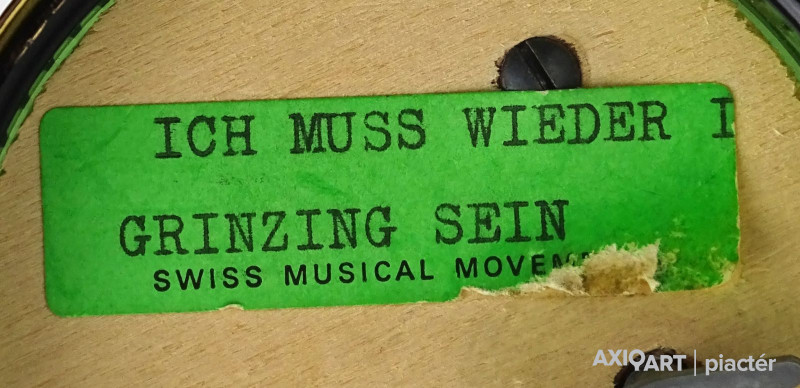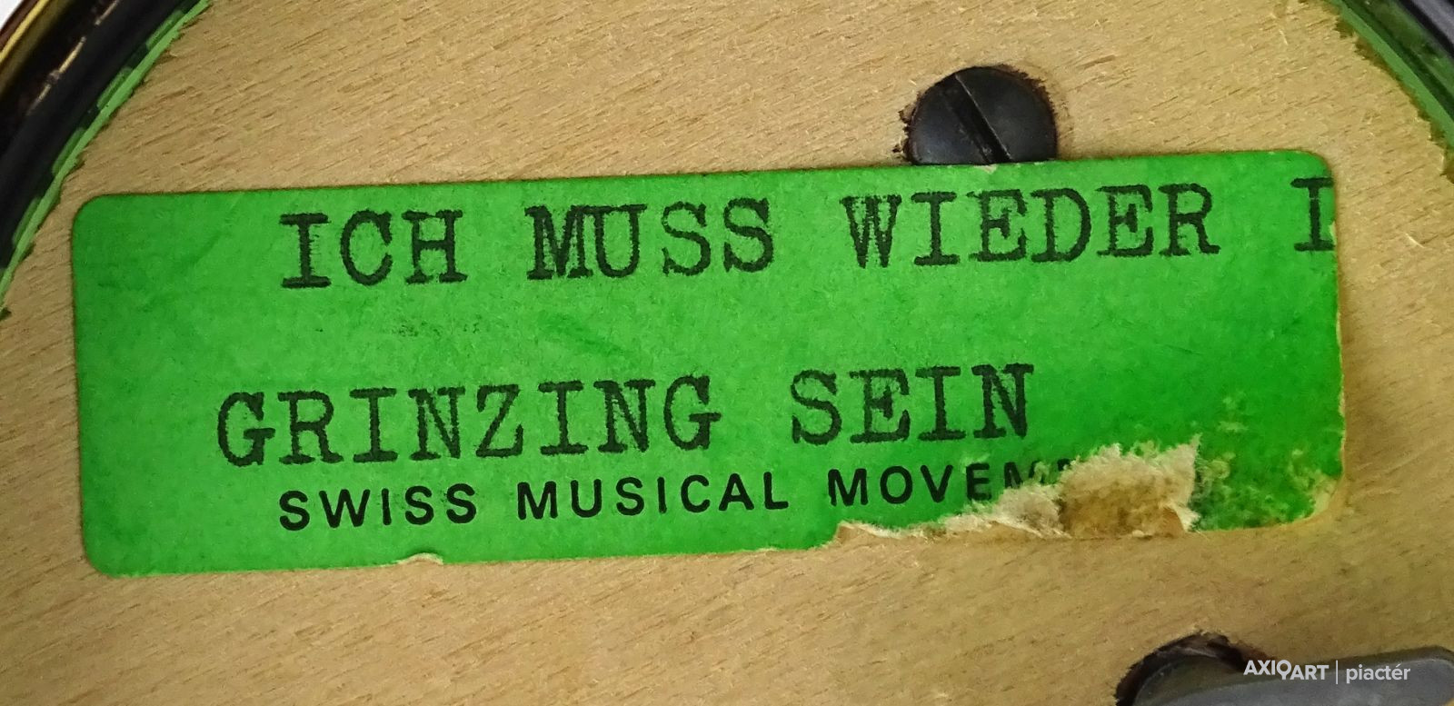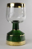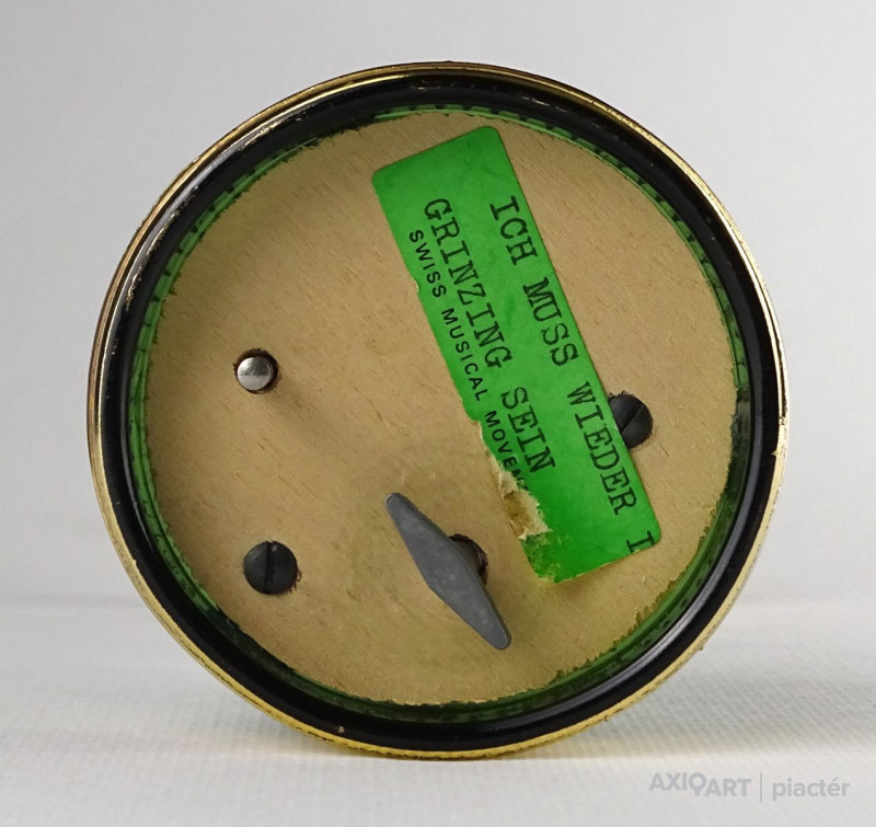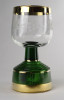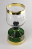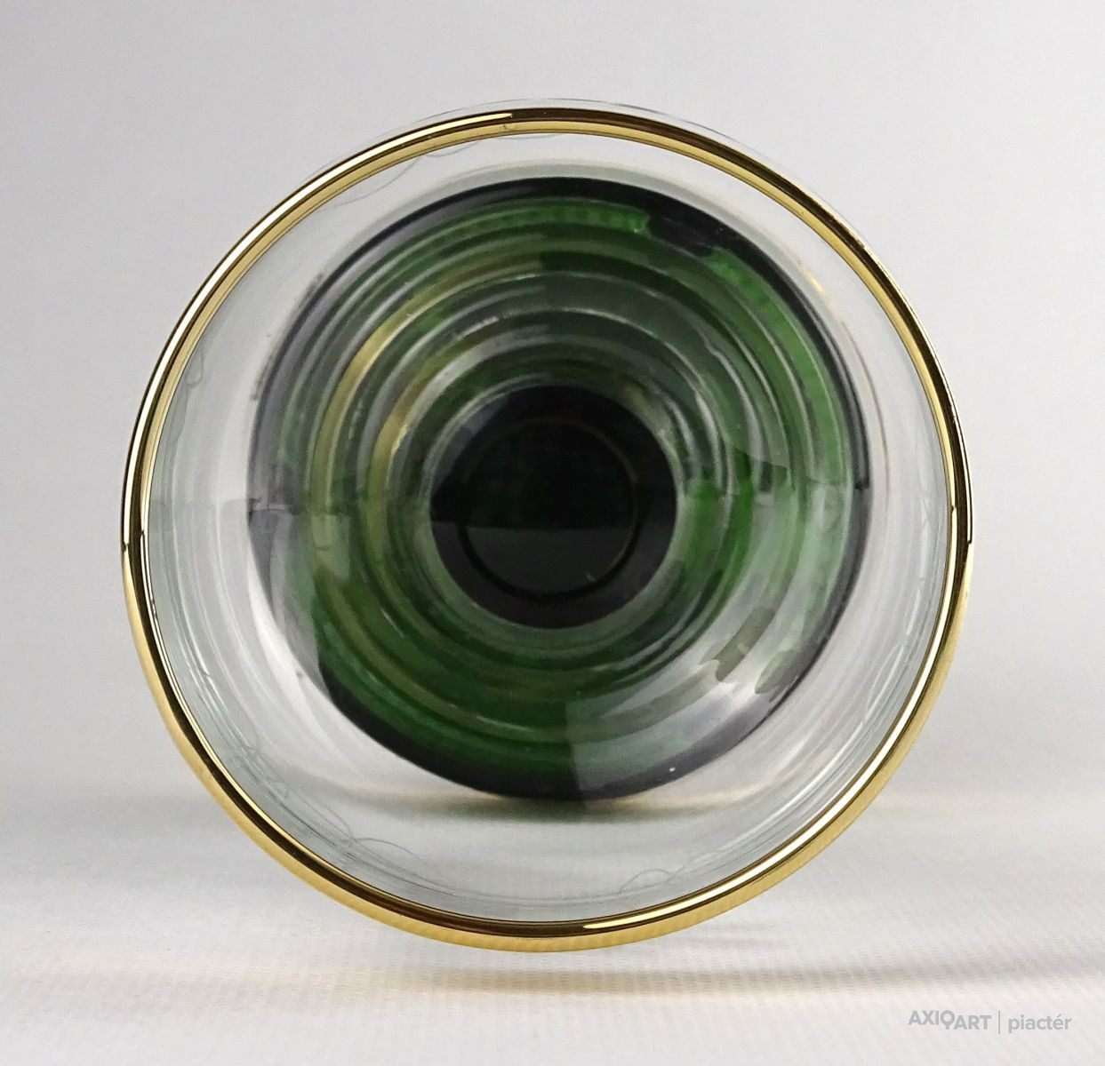 [1P757/X210] Régi hibátlan állapotú, aranyozott, zöld talpas üveg pohár kehely. Oldalán csiszolt szőlőfürt díszítéssel. A talpában zenélő szerkezet található. Oldalán jelzés: HAND GESCHLIFFEN (kézi csiszolás) Alján felirat: ICH MUSS WIEDER (EINMAL IN) GRINZING SEIN SWISS MUSICAL MOVEMENT Magasság: 14.5 cm Szélesség: 7.5 cm Súly: 0.34 kg Zene: https://www.youtube.com/watch?v=OnH6pT-lxHU&ab_channel=PeterAlexander-Topic