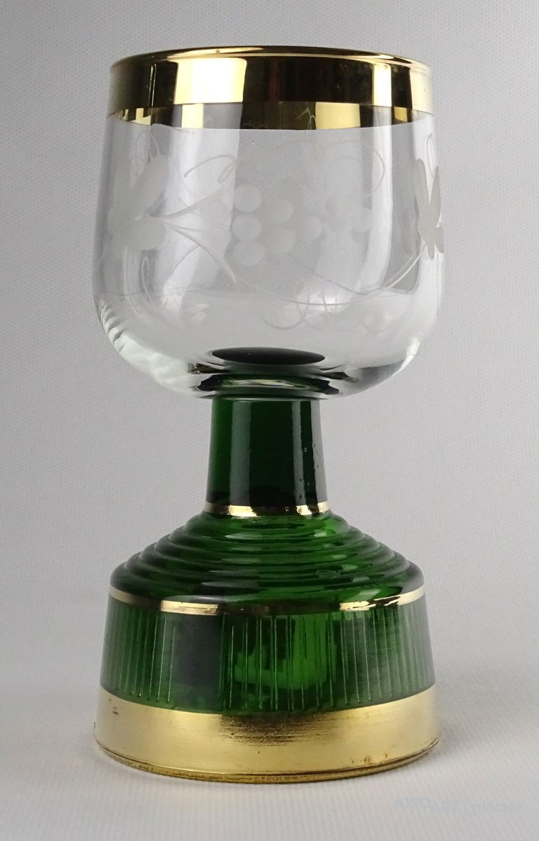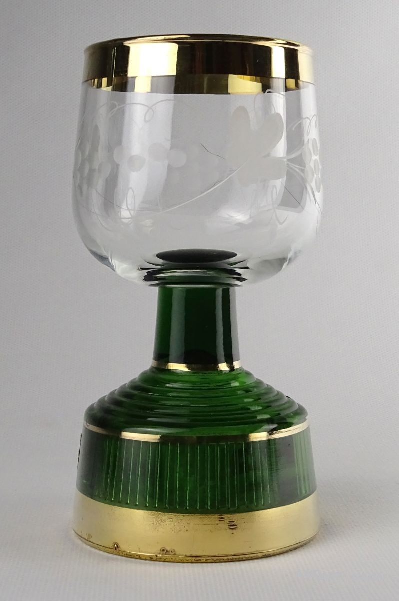 Régi hibátlan állapotú, aranyozott, zöld talpas üveg pohár kehely. Oldalán csiszolt szőlőfürt díszítéssel. A talpában zenélő szerkezet található.