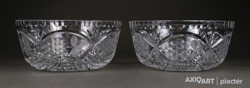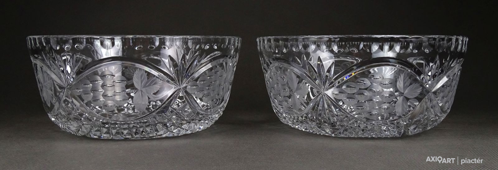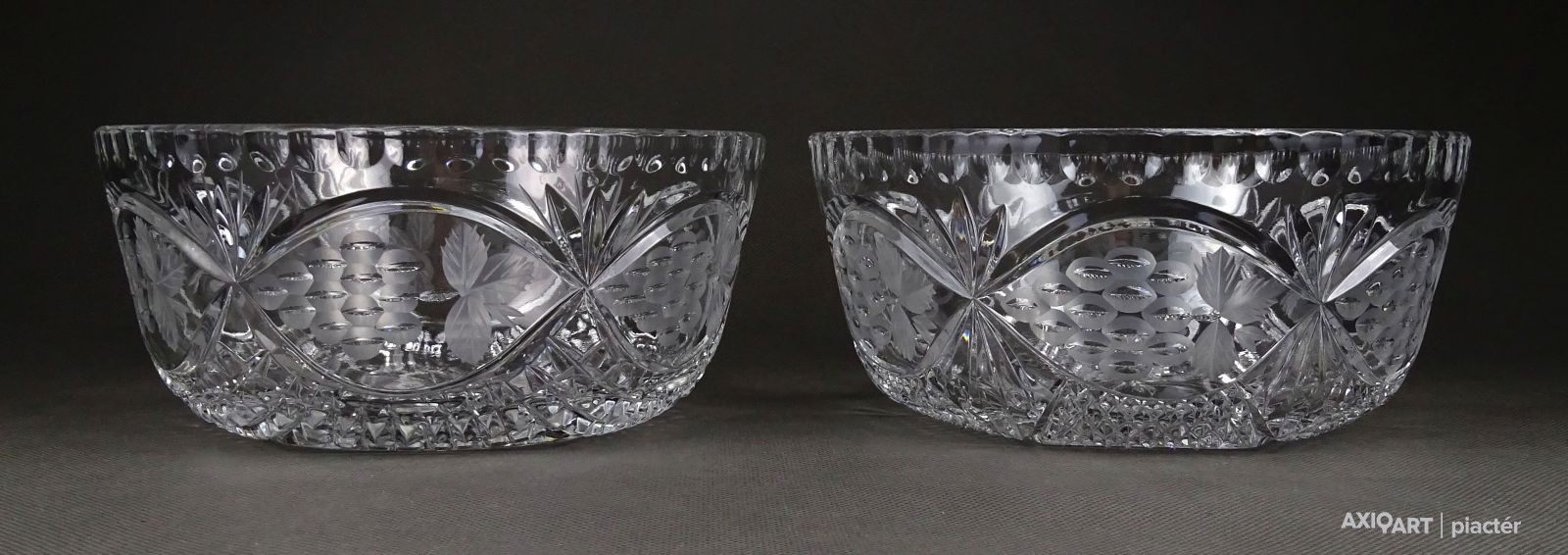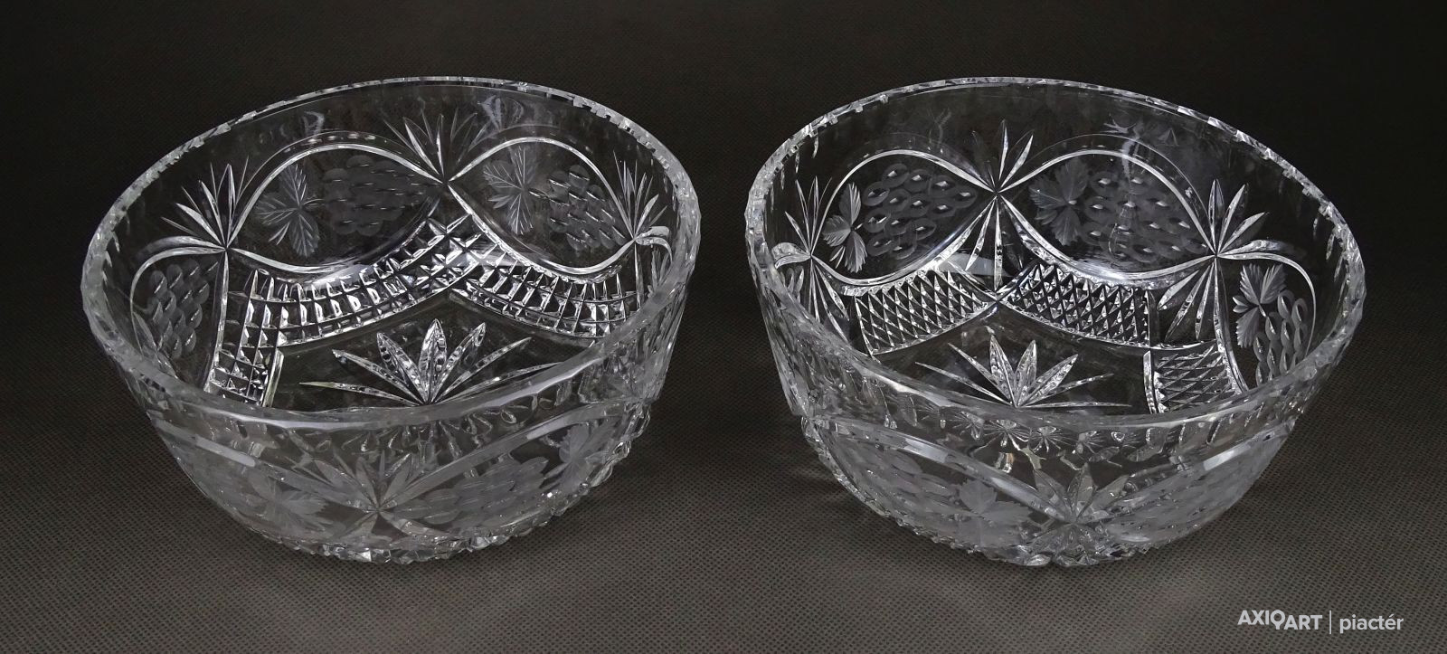Régi hibátlan állapotú, vastagfalú, csiszolatokkal gazdagon díszített kínáló tál, asztalközép kínáló tál. A tálakon szőlőfürt és szőlőlevél díszítés látható.