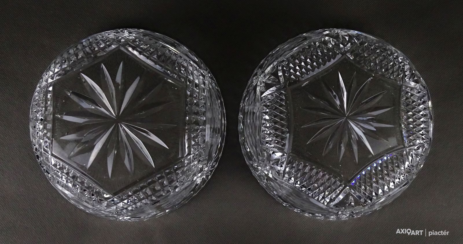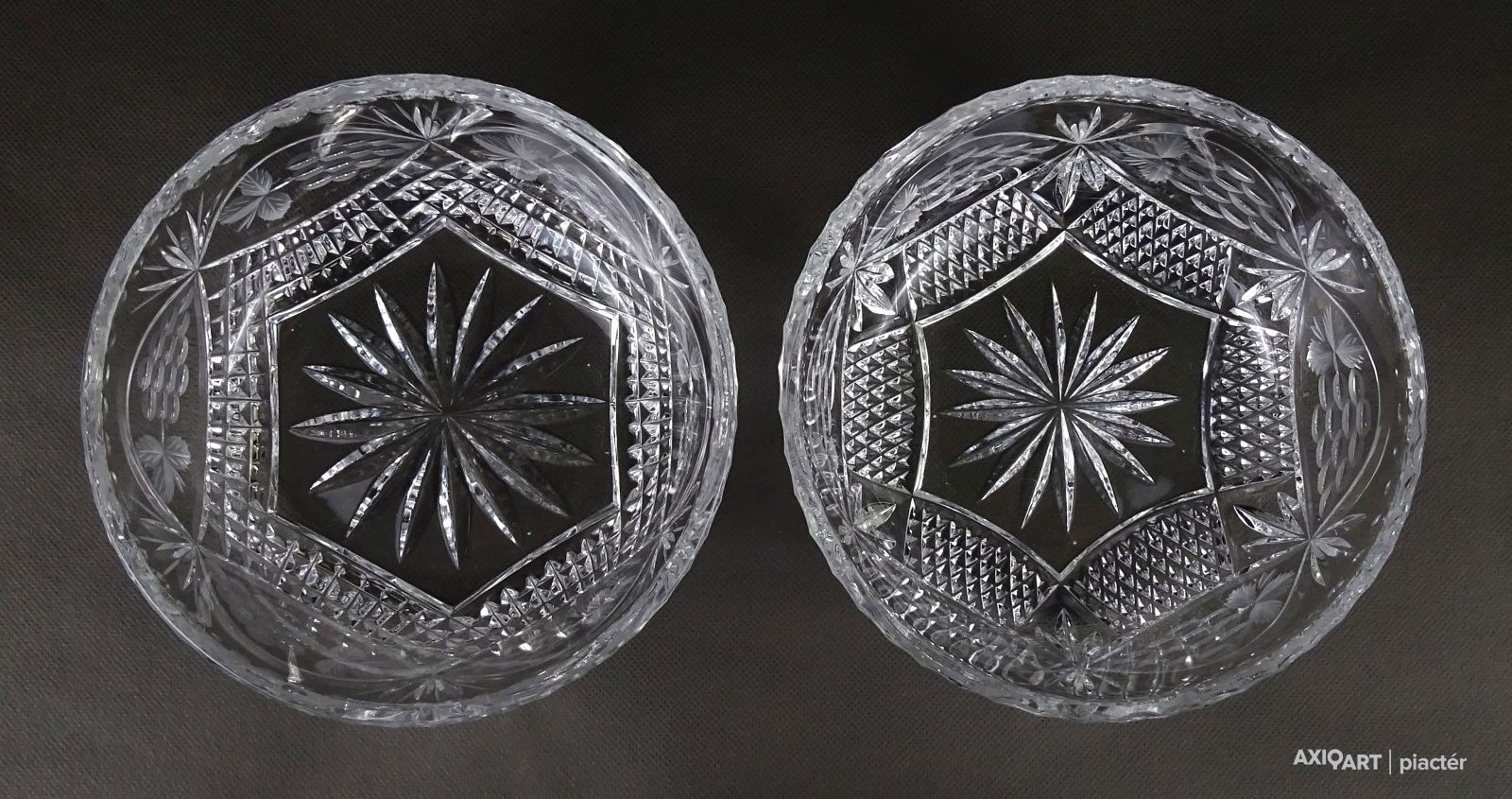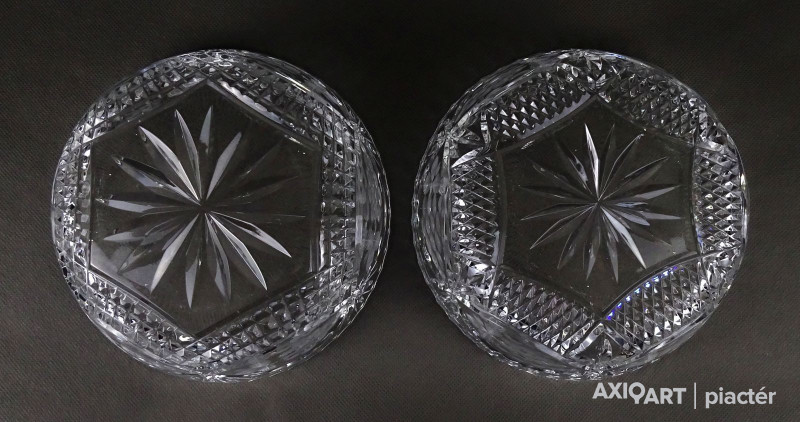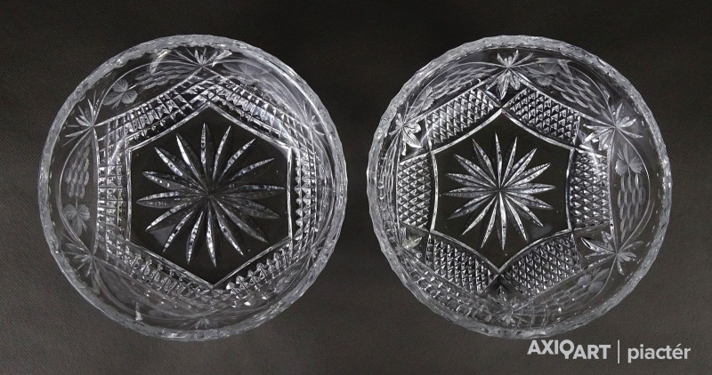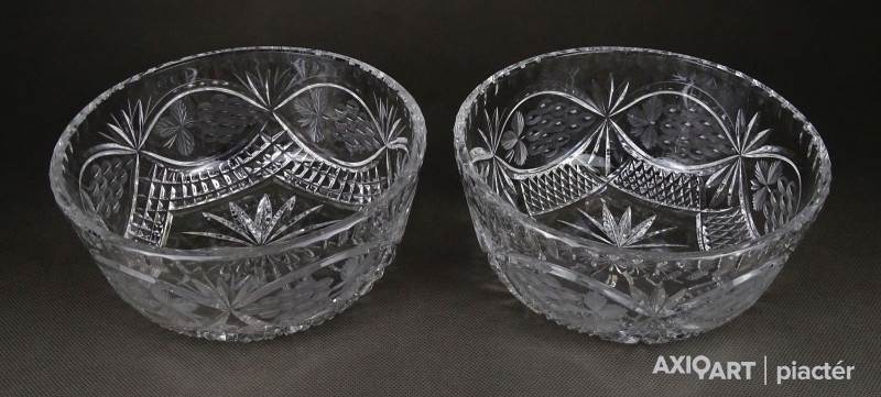 Régi hibátlan állapotú, vastagfalú, csiszolatokkal gazdagon díszített kínáló tál, asztalközép kínáló tál. A tálakon szőlőfürt és szőlőlevél díszítés látható.