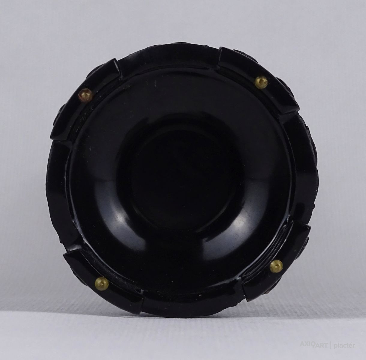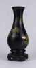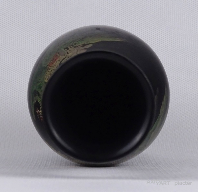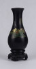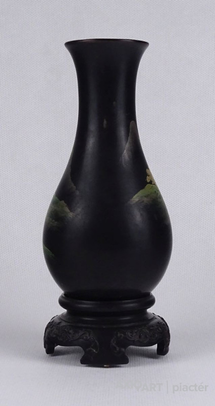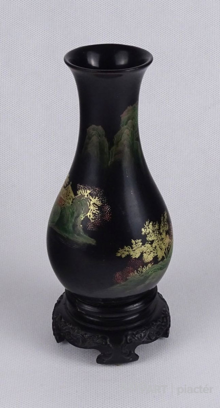 [1S786/X003] Régi hibátlan állapotú kézi festésű díszes fekete keleti váza, talpon. Oldalán keleti tájkép és épület díszítés. A váza igen könnyed. Magasság: 17.7 cm Súly: 0.075 kg