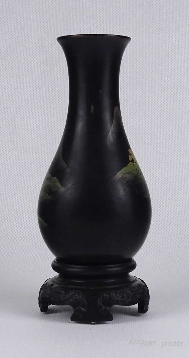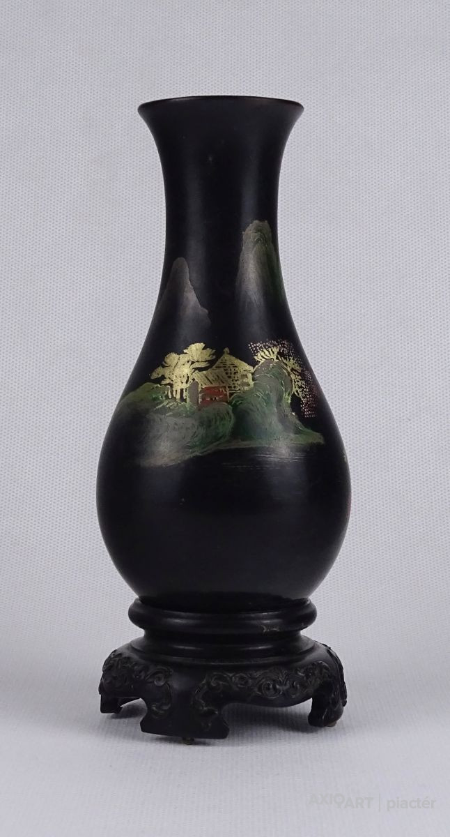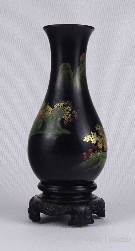 Régi hibátlan állapotú kézi festésű díszes fekete keleti váza, talpon. Oldalán keleti tájkép és épület díszítés. A váza igen könnyed.