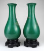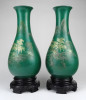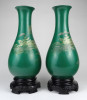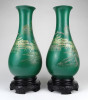 [1M811/BX-02] Régi hibátlan állapotú kézi festésű lakkozott, zöldre festett, díszes fekete talpakon álló keleti váza pár. Oldalán japán tájkép és épületek. A vázapár igen könnyed, anyaga talán bambusz. Magasság: 30 cm Szélesség: 12 cm Súly: 0.61 kg