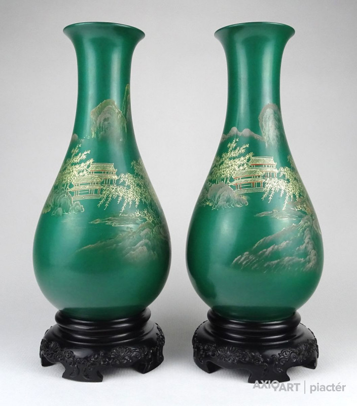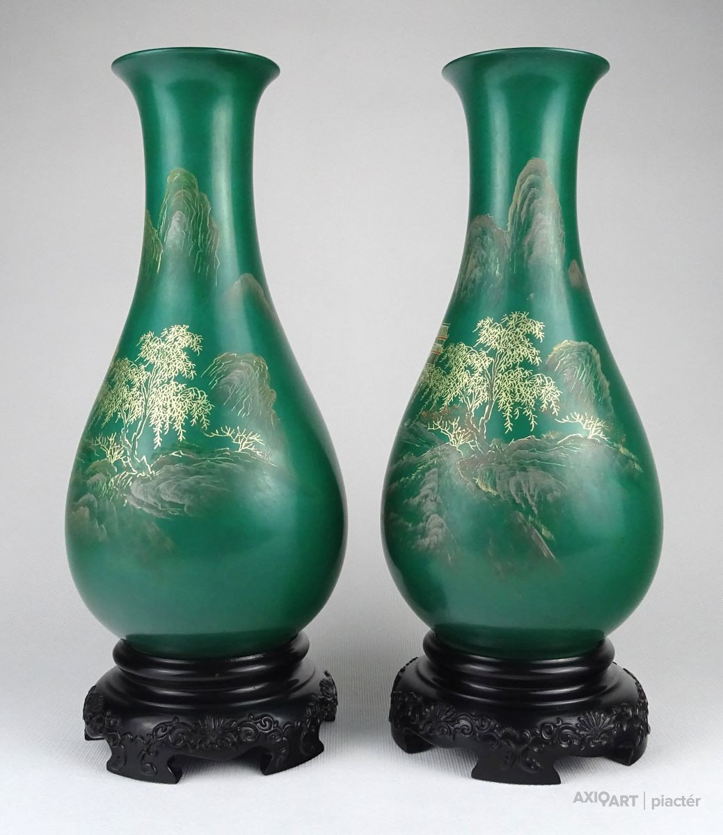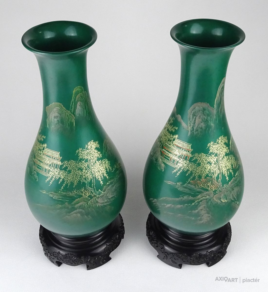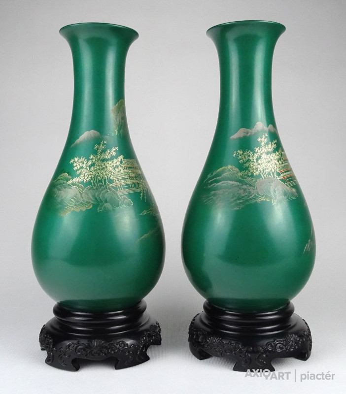 Régi hibátlan állapotú kézi festésű lakkozott, zöldre festett, díszes fekete talpakon álló keleti váza pár. Oldalán japán tájkép és épületek. A vázapár igen könnyed, anyaga talán bambusz.