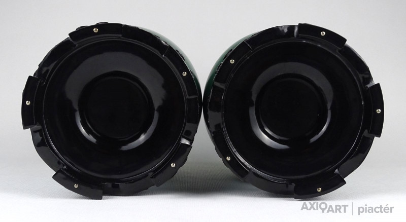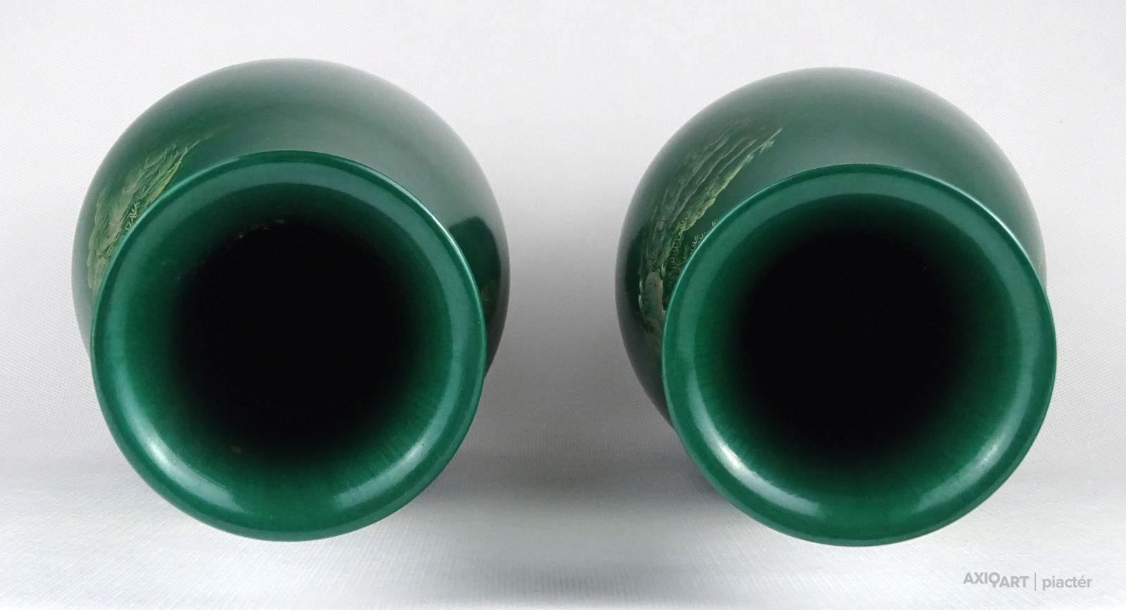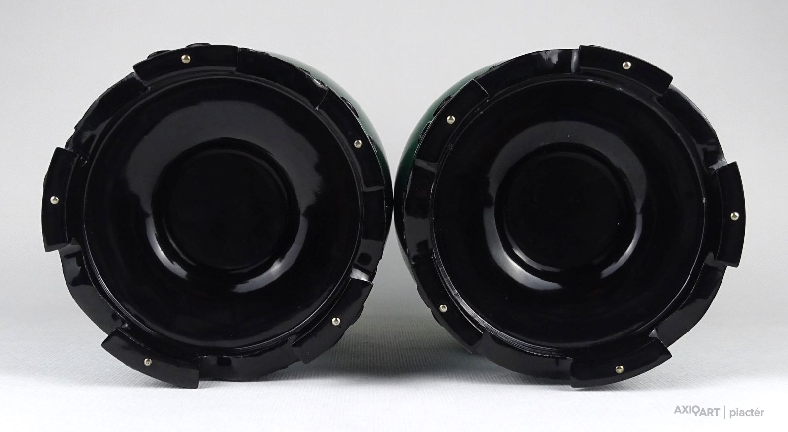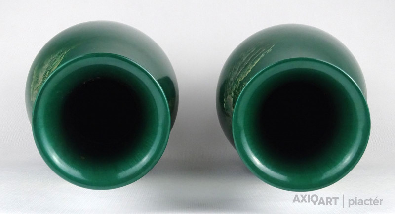 Régi hibátlan állapotú kézi festésű lakkozott, zöldre festett, díszes fekete talpakon álló keleti váza pár. Oldalán japán tájkép és épületek. A vázapár igen könnyed, anyaga talán bambusz.