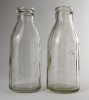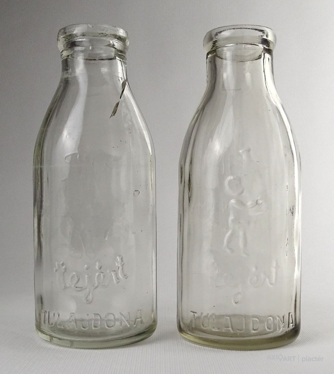 [1O433/X148] Régi, szép állapotú, tejes üveg palack pár. Az egyik palack nyakán nem kitapintható kisebb repedés található, mellette koronás 1958-as hitelesítő pecsét található. Oldalukon felirat: 5 DL KIÜRÍTÉS UTÁN AZONNAL KIMOSANDÓ TEJÉRT TULAJDONA Talpukon jelzés: ST. és BT. Magasság: 19.5 cm Szélesség: 7.5 cm Súly: 0.98 kg