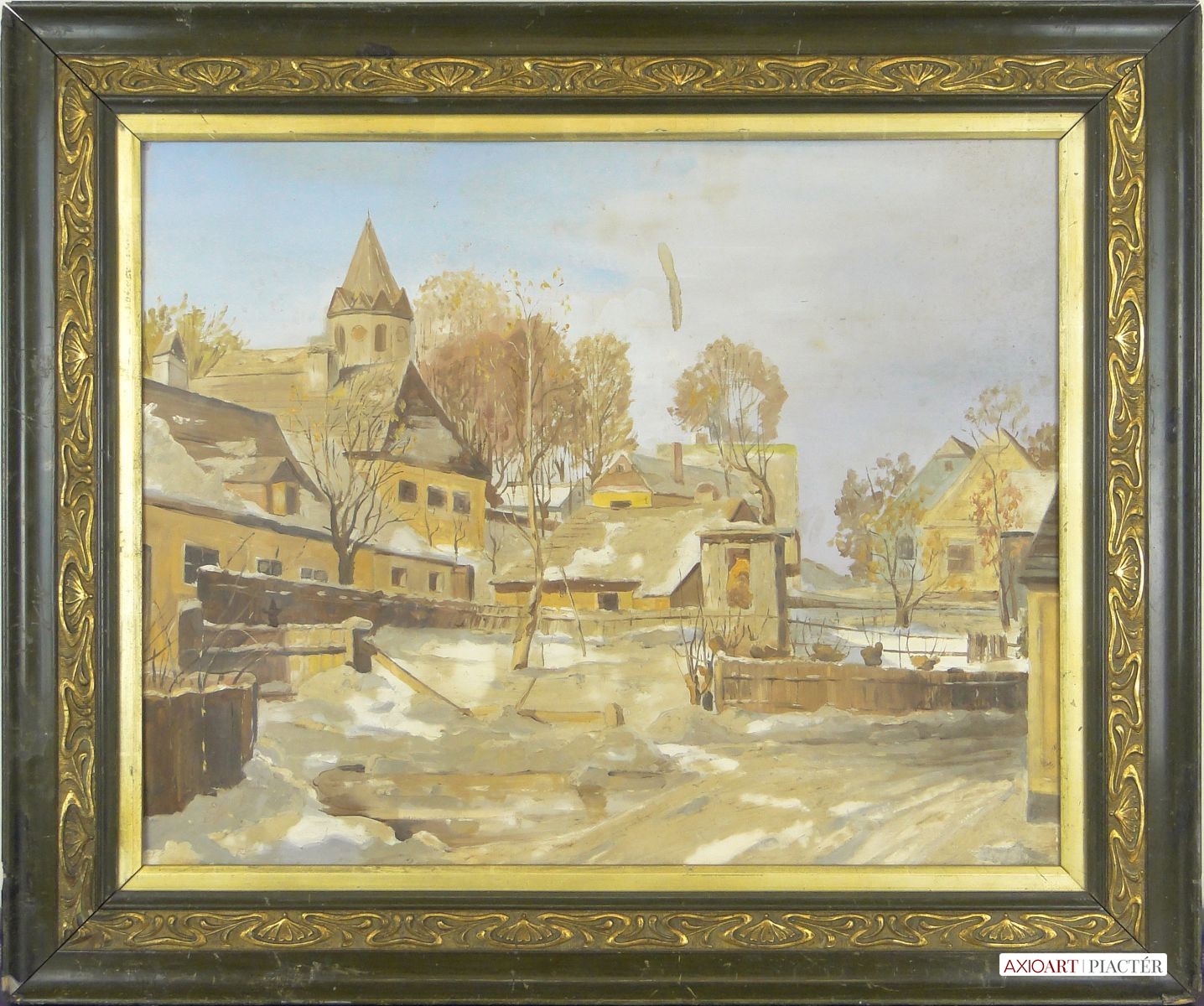[0E929/075] Olaj karton festmény, régi szecessziós keretben, a keret kissé kopott. Jelzés nélküli téli tájkép, utcarészlet. Magasság: 65 cm Szélesség: 78 cm Súly: 2.8 kg