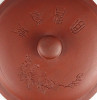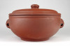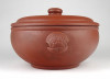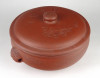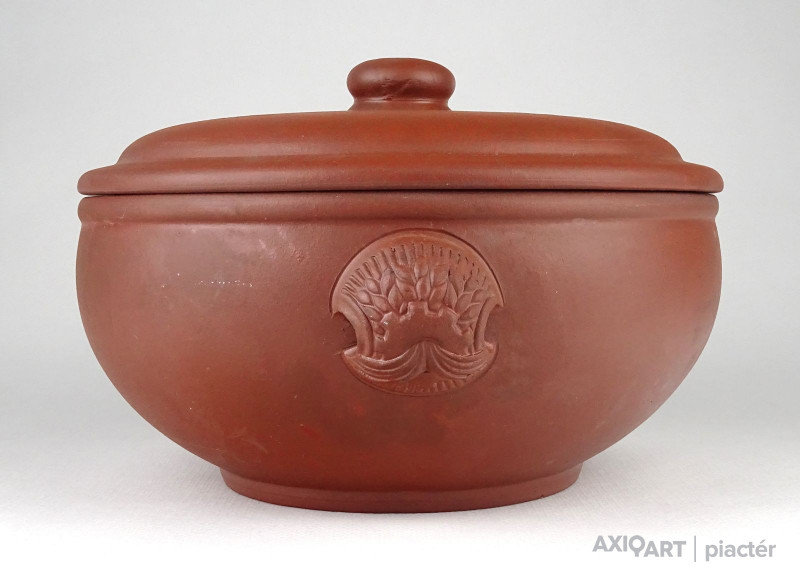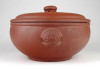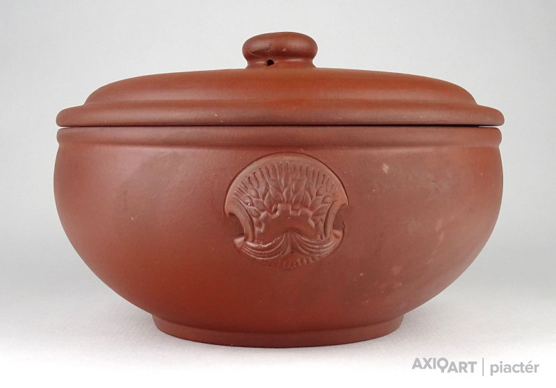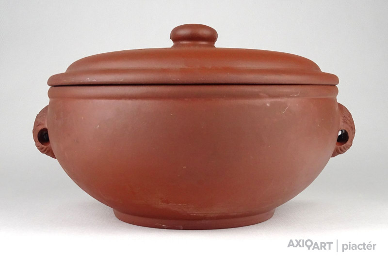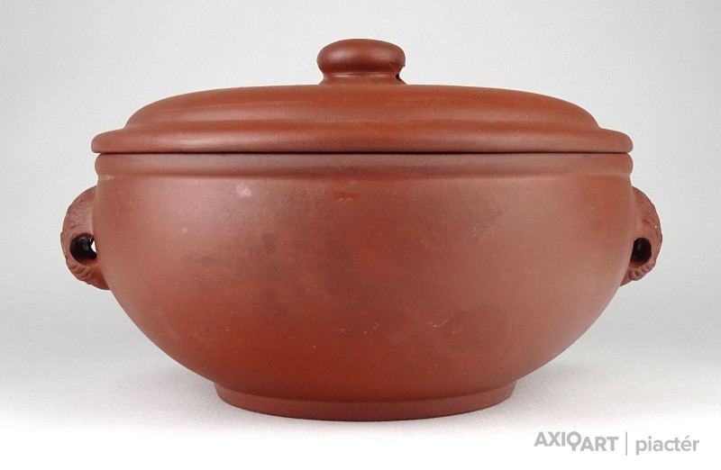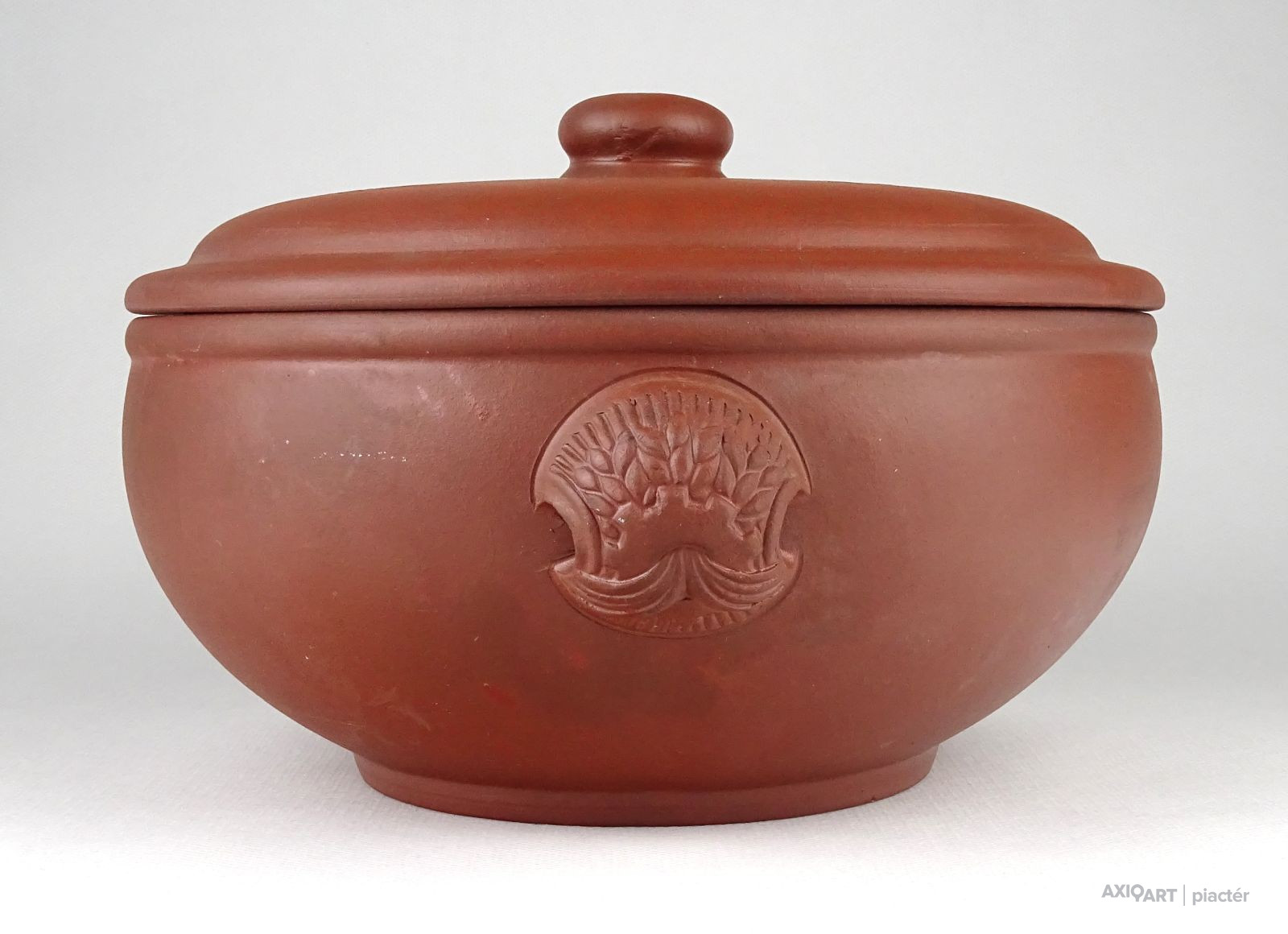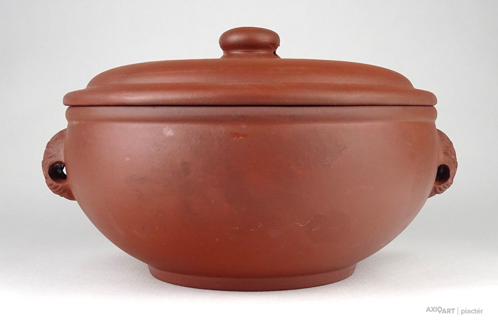 [1J523/X166] 25% ÁRENGEDMÉNY MINDEN TERMÉKÜNKRE Dec. 14-ig Régi, barna színű fedeles terrakotta edény. Keleti néprajzi, népművészeti kerámia edény, pároló edény fedővel és fülekkel. A fülein pálcákat dugtak át, így emelték meg a forró edényt. Fedelén nyomott minta és kalligrafikus jelzés, felirat, lásd fotó. Magasság: 14.5 cm Szélesség: 21.5 cm Hosszúság: 24 cm Súly: 1.865 kg