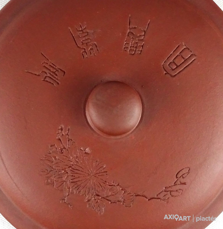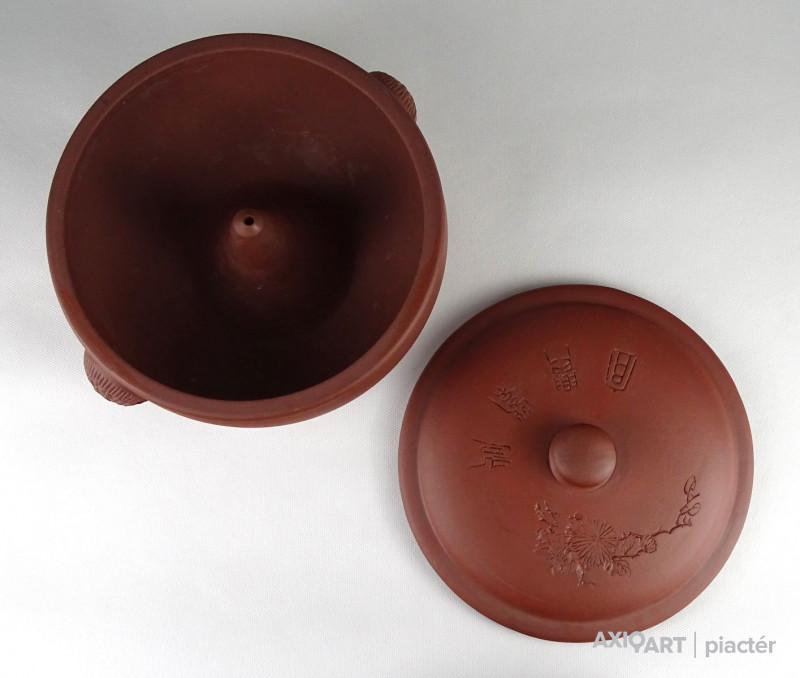 Régi, barna színű fedeles terrakotta edény. Keleti néprajzi, népművészeti kerámia edény, pároló edény fedővel és fülekkel. A fülein pálcákat dugtak át, így emelték meg a forró edényt. Fedelén nyomott minta és kalligrafikus jelzés, felirat, lásd fotó.