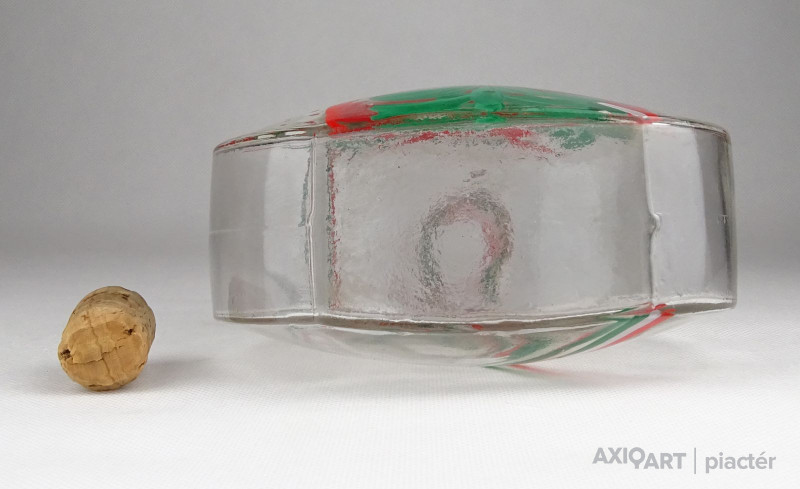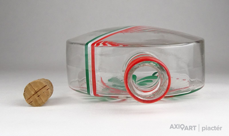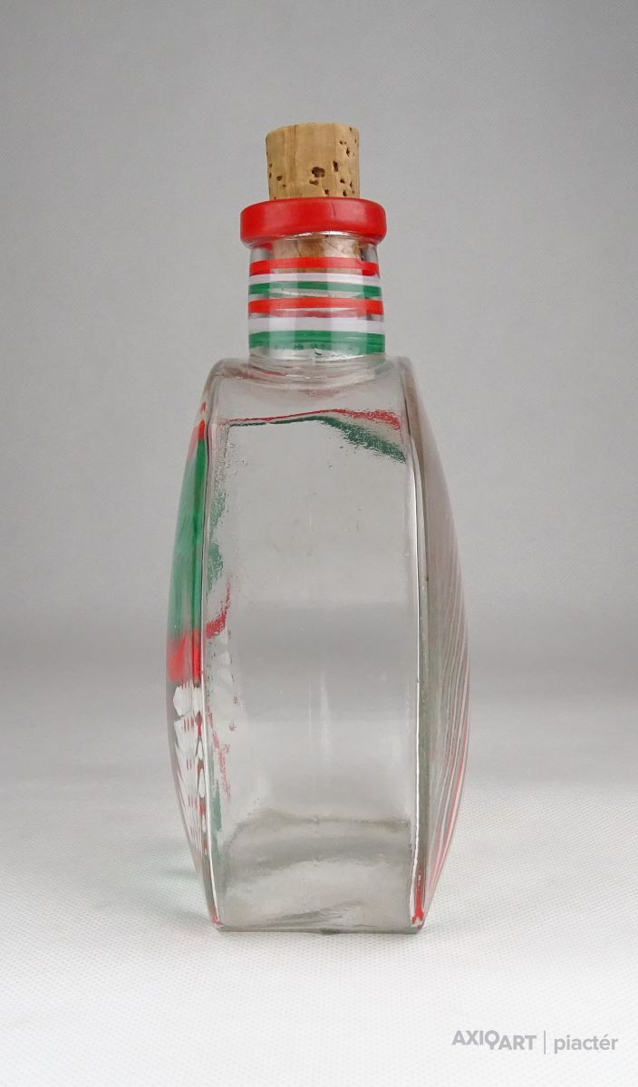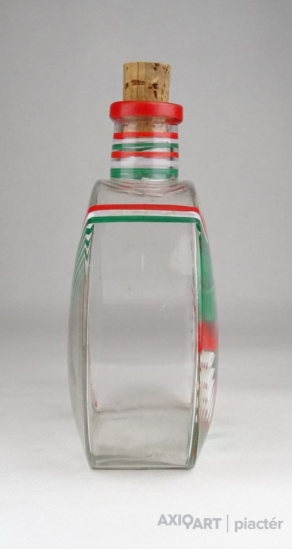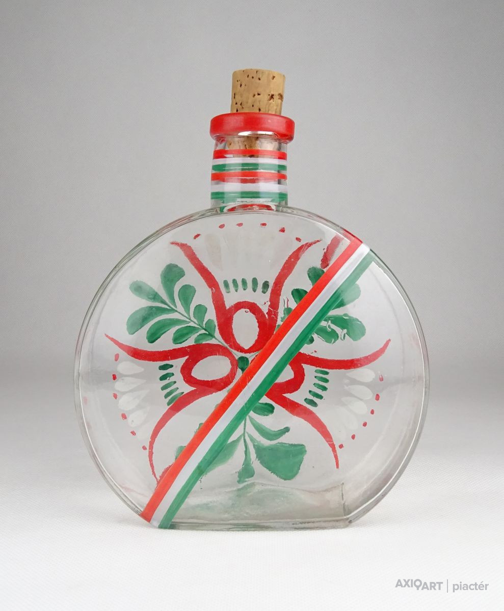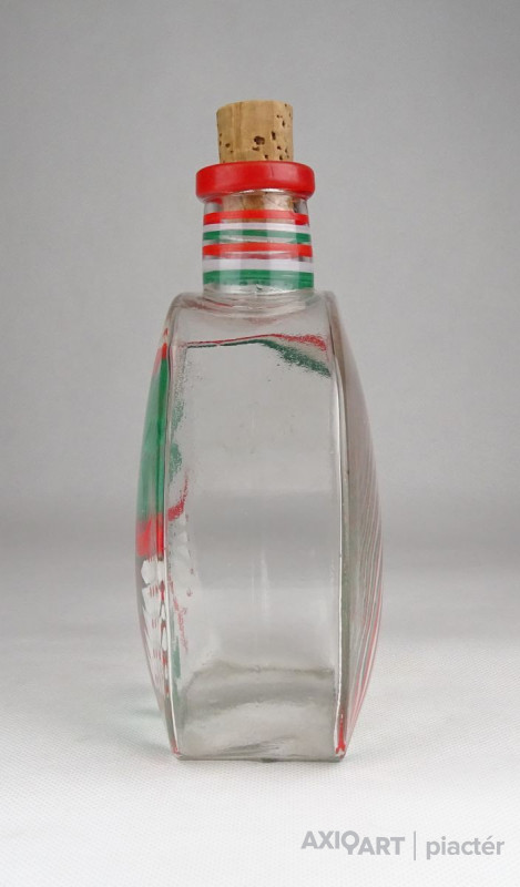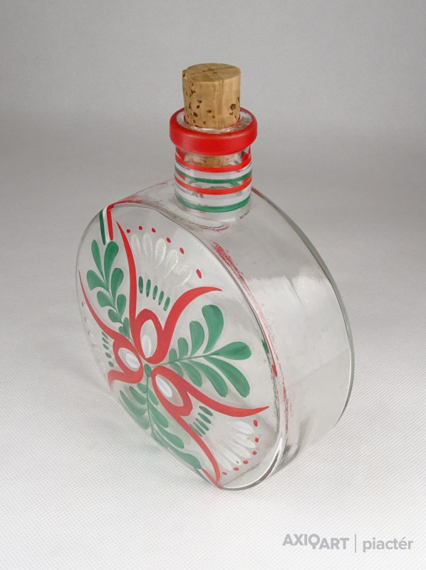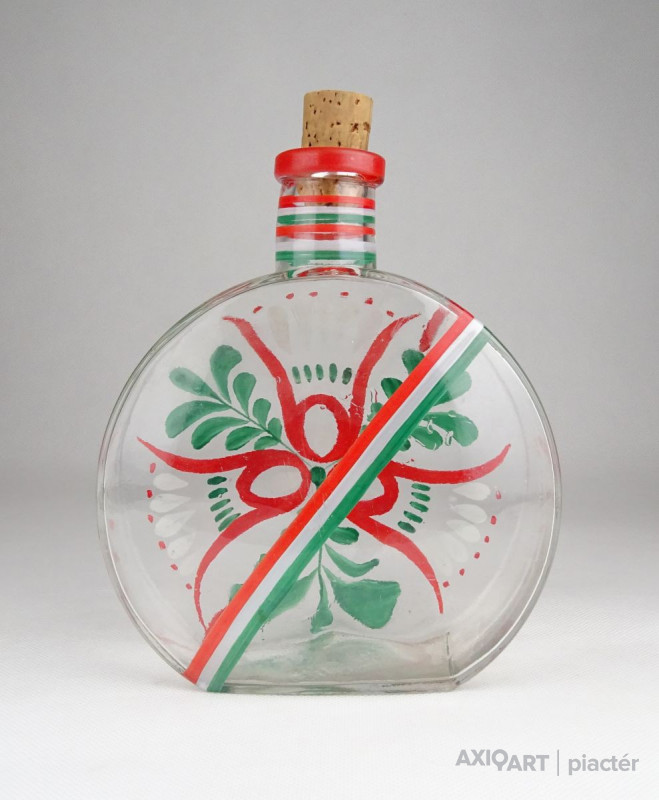 [0X607/X298] Régi, hibátlan állapotú üveg kulacs parafadugóval. Rajta kézzel festett trikoloros díszítésekkel. Magasság: 16.5 cm Szélesség: 6.5 cm Hosszúság: 14 cm Súly: 0.415 kg
