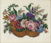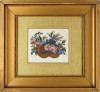 [1B766/060] Régi aranyozott keretben, üveglap mögött található régi kézimunka, tűgobelin. Színes virágkosár. Magasság: 24 cm Szélesség: 26 cm Súly: 0.565 kg