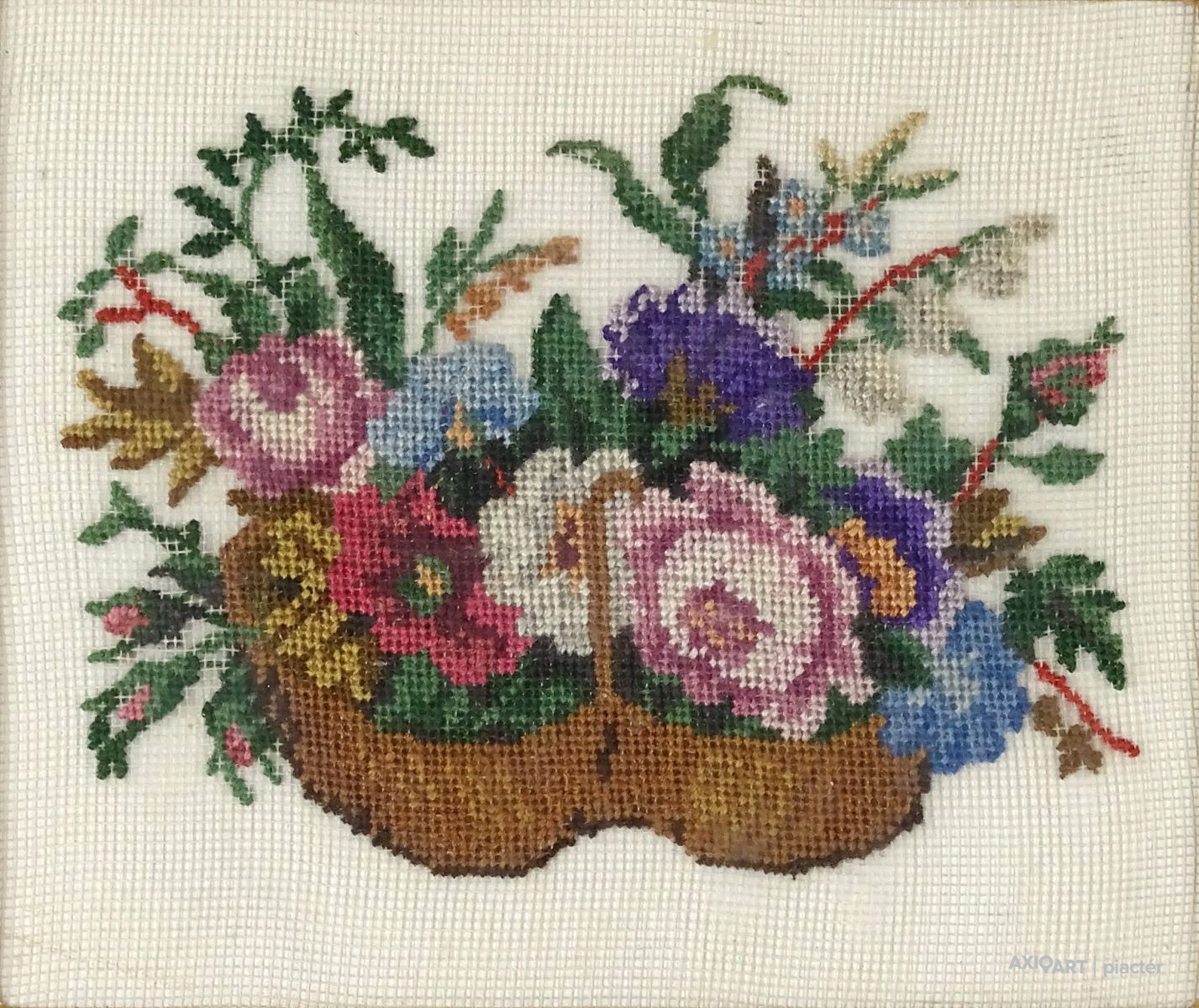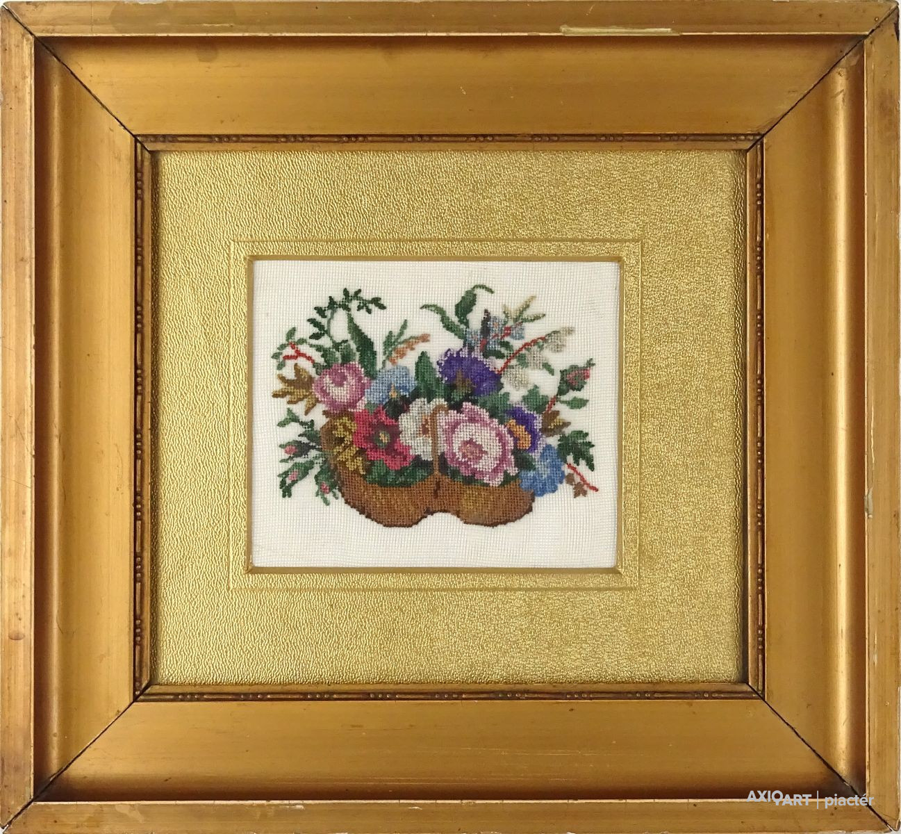 Régi aranyozott keretben, üveglap mögött található régi kézimunka, tűgobelin. Színes virágkosár.