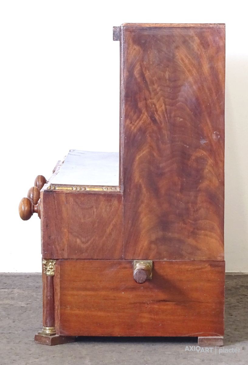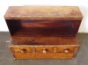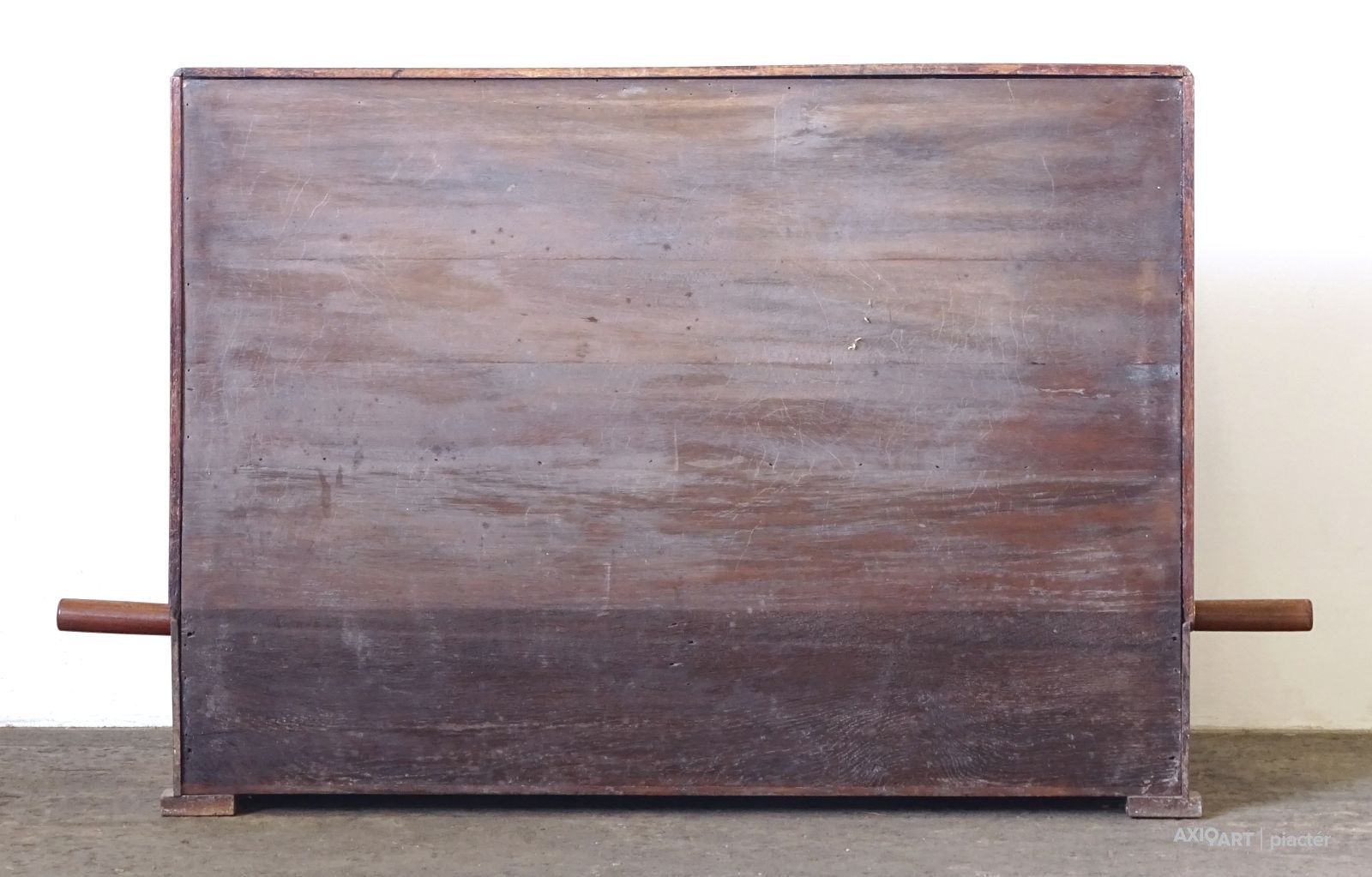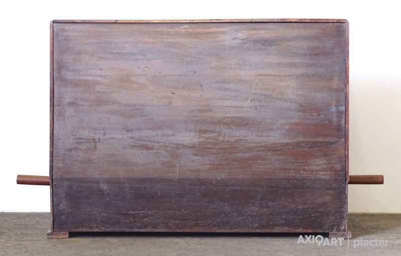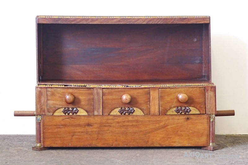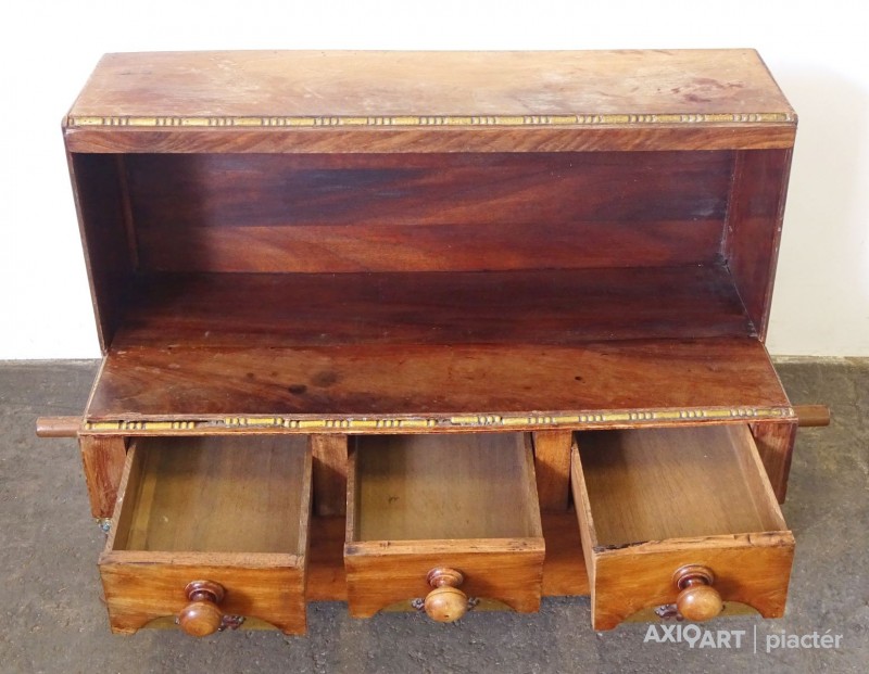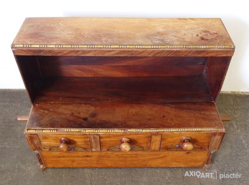 [0N587/UZ-K] Régi, szép állapotú, hordozó fogantyúkkal rendelkező, három fiókos utcai könyv árusító szekrény. Faragott díszekkel, arany festéssel és réz veretekkel díszített, ritka bútordarab. Magasság: 62 cm Szélesség: 40 cm Hosszúság: 107 cm