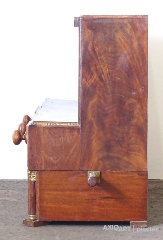 Faragott díszekkel, arany festéssel és réz veretekkel díszített, ritka bútordarab.