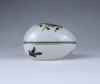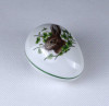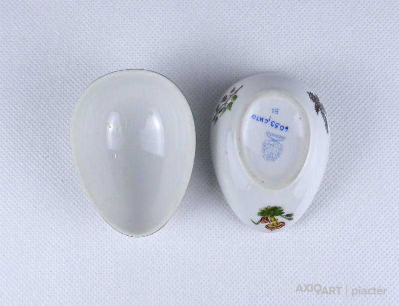 [1Z605/X333] Régi, hibátlan állapotú, vadásztrófea (chasse, tetes) mintás, nyúlfejes díszítésű tojás alakú, Herendi porcelán bonbonier. Alján kék Herendi márkajelzés: HEREND HUNGARY HANDPAINTED Festett formaszám: 6053 / CHTG Mélynyomással: HEREND Magasság: 4.9 cm Szélesség: 5.4 cm Hosszúság: 7.3 cm Súly: 0.085 kg