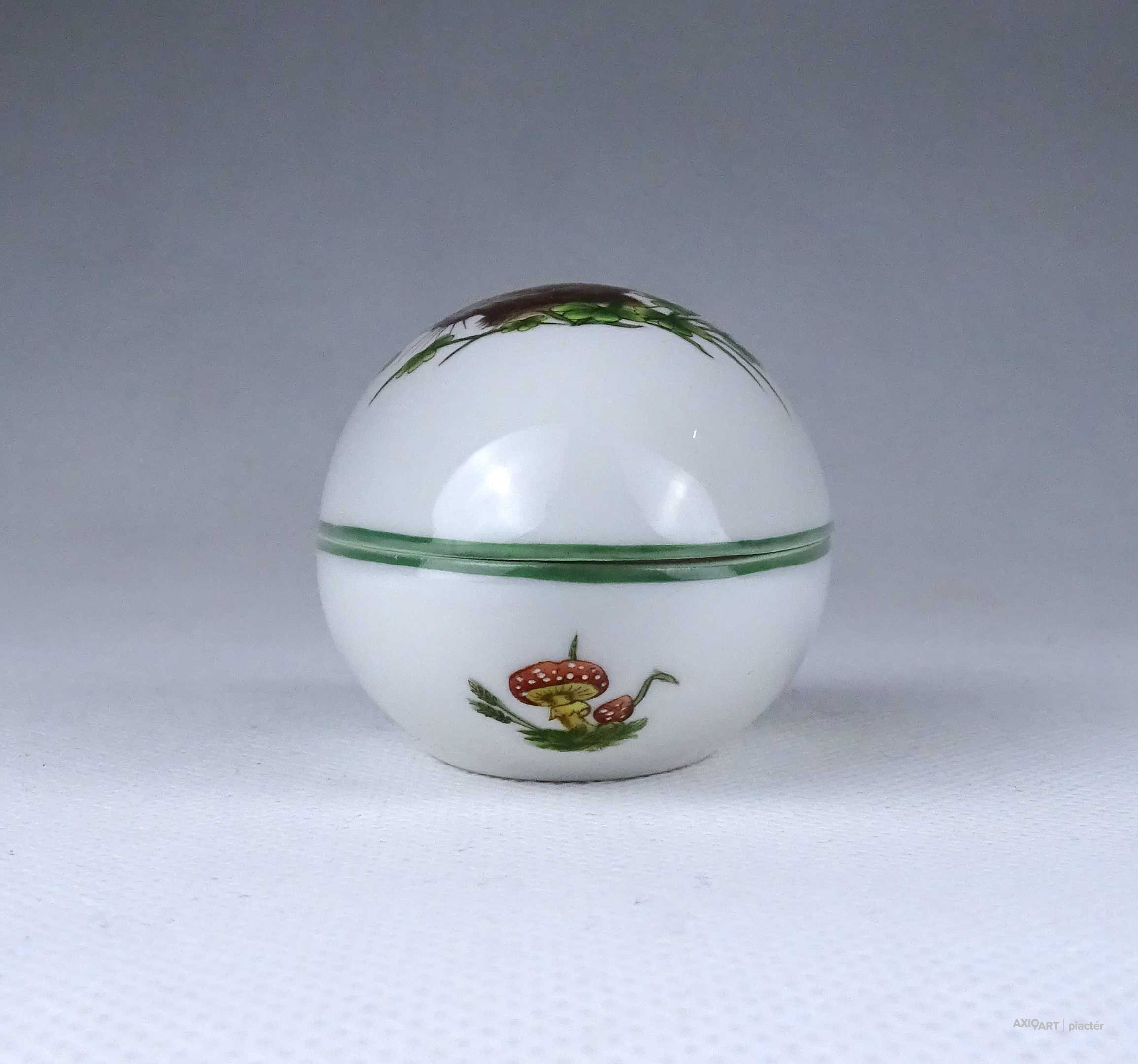 Régi, hibátlan állapotú, vadásztrófea (chasse, tetes) mintás, nyúlfejes díszítésű tojás alakú, Herendi porcelán bonbonier.