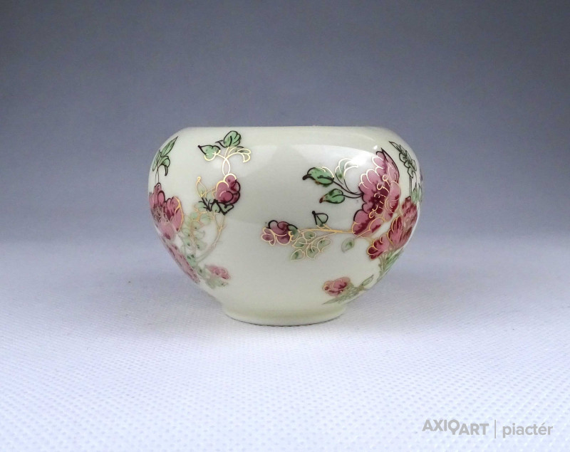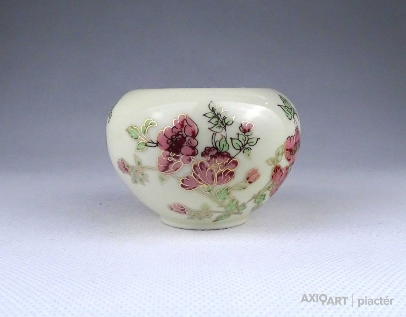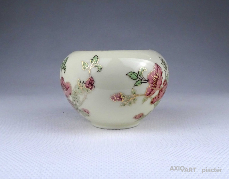 [1Z712/Z008] Régi, hibátlan állapotú, jelzett, kisméretű vaj színű, gazdagon aranyozott, virágmintás Zsolnay porcelán váza. Alján öttornyú Zsolnay márkajelzés: ZSOLNAY HUNGARY 1868 PÉCS HAND-PAINTED Arannyal formaszám: 644/VIII/064 Magasság: 6 cm Szélesség: 8.4 cm Súly: 0.135 kg