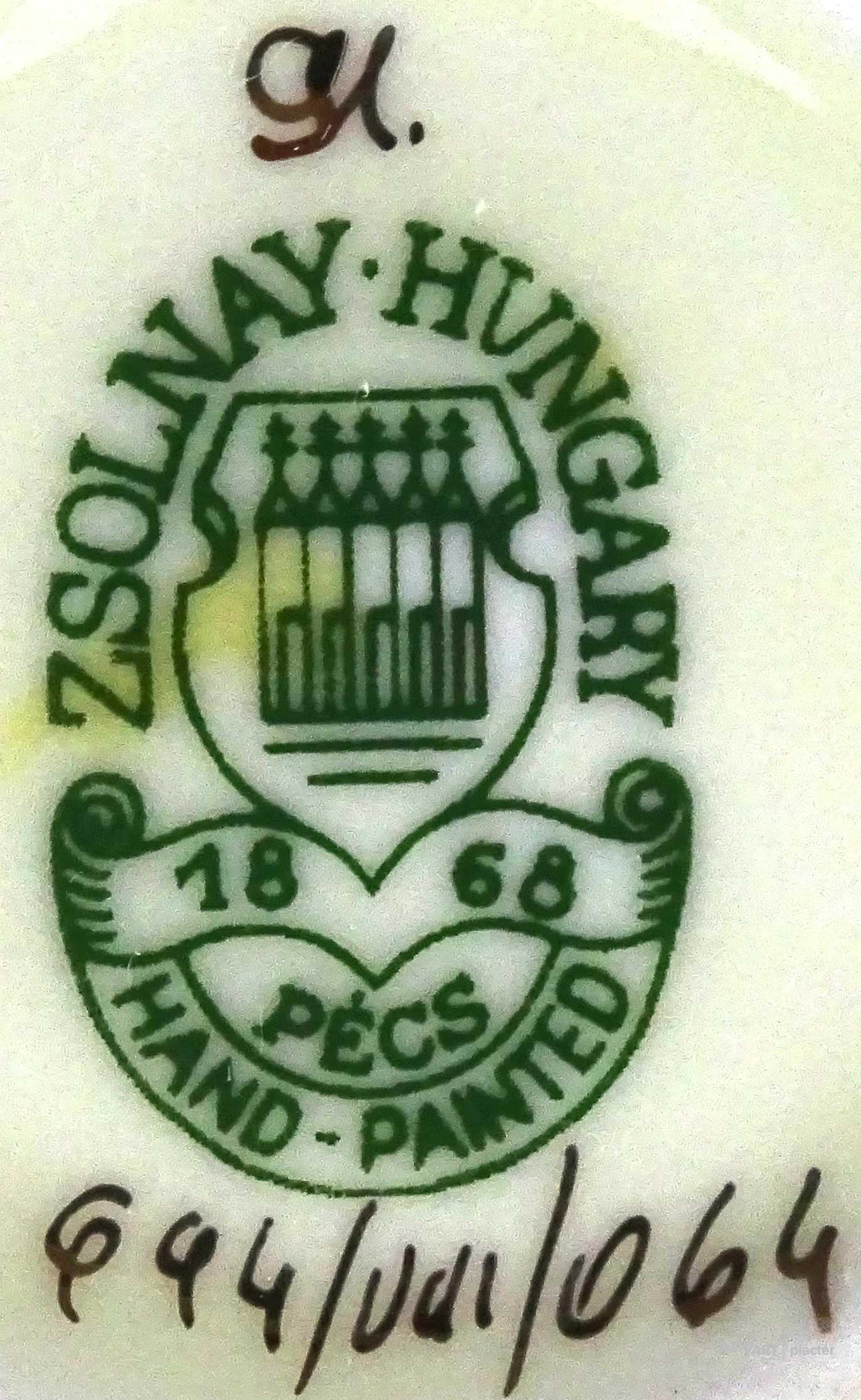 [1X618/Z034] Hibátlan állapotú, gazdagon aranyozott virágmintás, pillangós Zsolnay porcelán váza. Alján zöld színű felirat és Zsolnay márkajelzés: KÉSZÜLT A MOL RÉSZÉRE ZSOLNAY HUNGARY 1868 PÉCS HAND-PAINTED Arannyal formaszám: 871/40/026 Magasság: 16.3 cm Szélesség: 8.2 cm Súly: 0.255 kg Átmérője 12,5 cm. Magassága 6,5 cm. Súlya 257 g.
